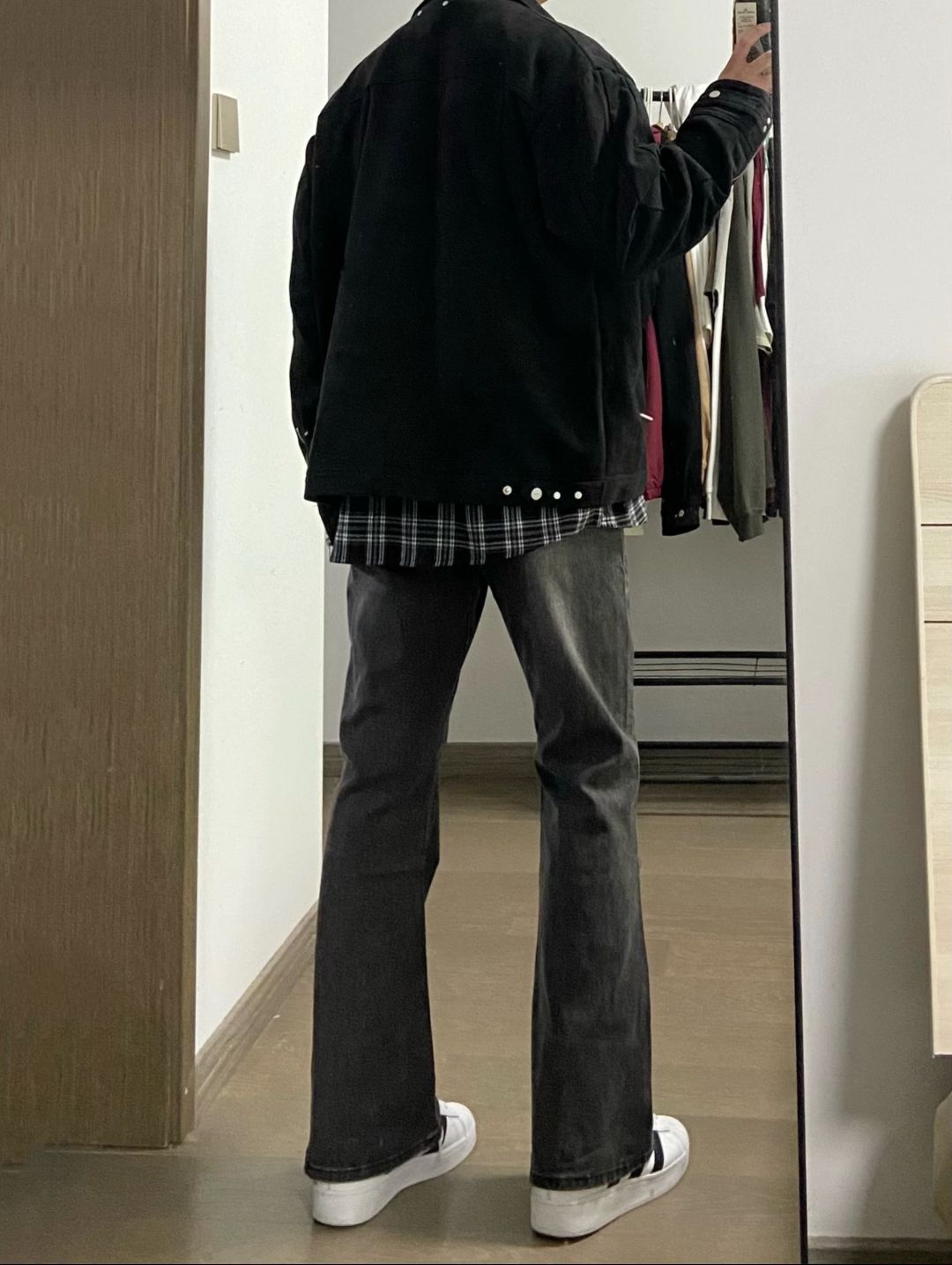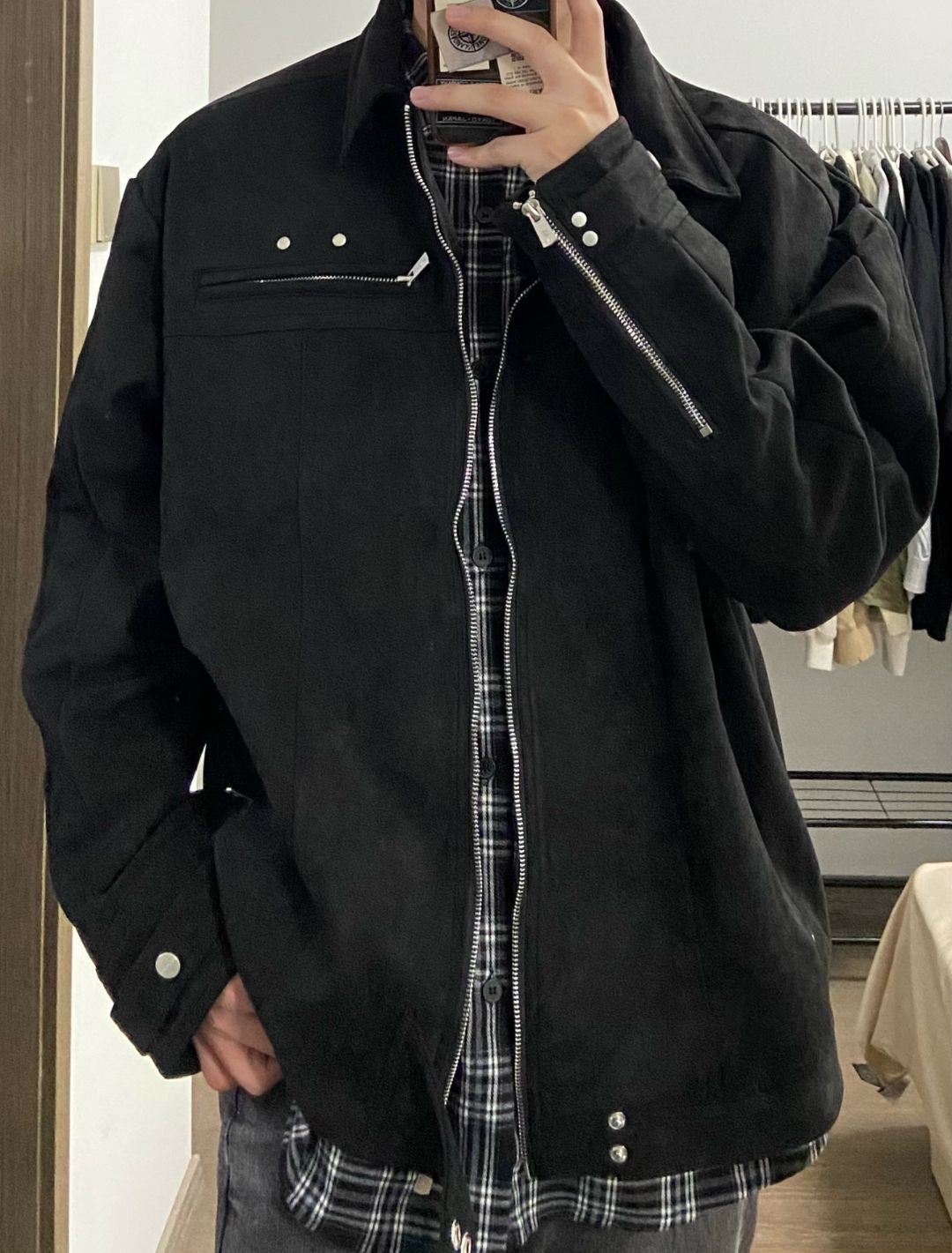 【男生秋季穿搭/黑色麂皮夹克+烟灰牛仔裤】,由用户 邳州薛之谦 分享,来自江苏。这是一篇来自识货社区的真实用户分享笔记。
