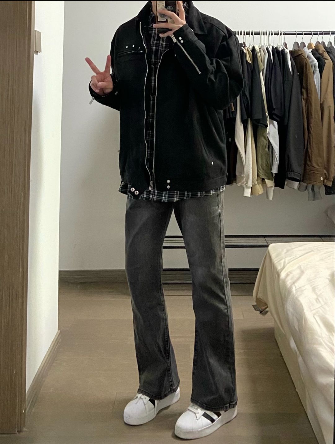 🧍♂️ 穿搭风格:unknowtal 春秋必备的一款夹克外套魔皮绒面料手感舒适柔软,保暖效果好版型宽松上身显瘦,拉链排扣设计美式潮流时尚,非常百搭! 👔 上衣:新因素 版型宽松微喇,面料舒适柔软修饰腿型,渐变烟灰色,复古百搭 🎒配饰: