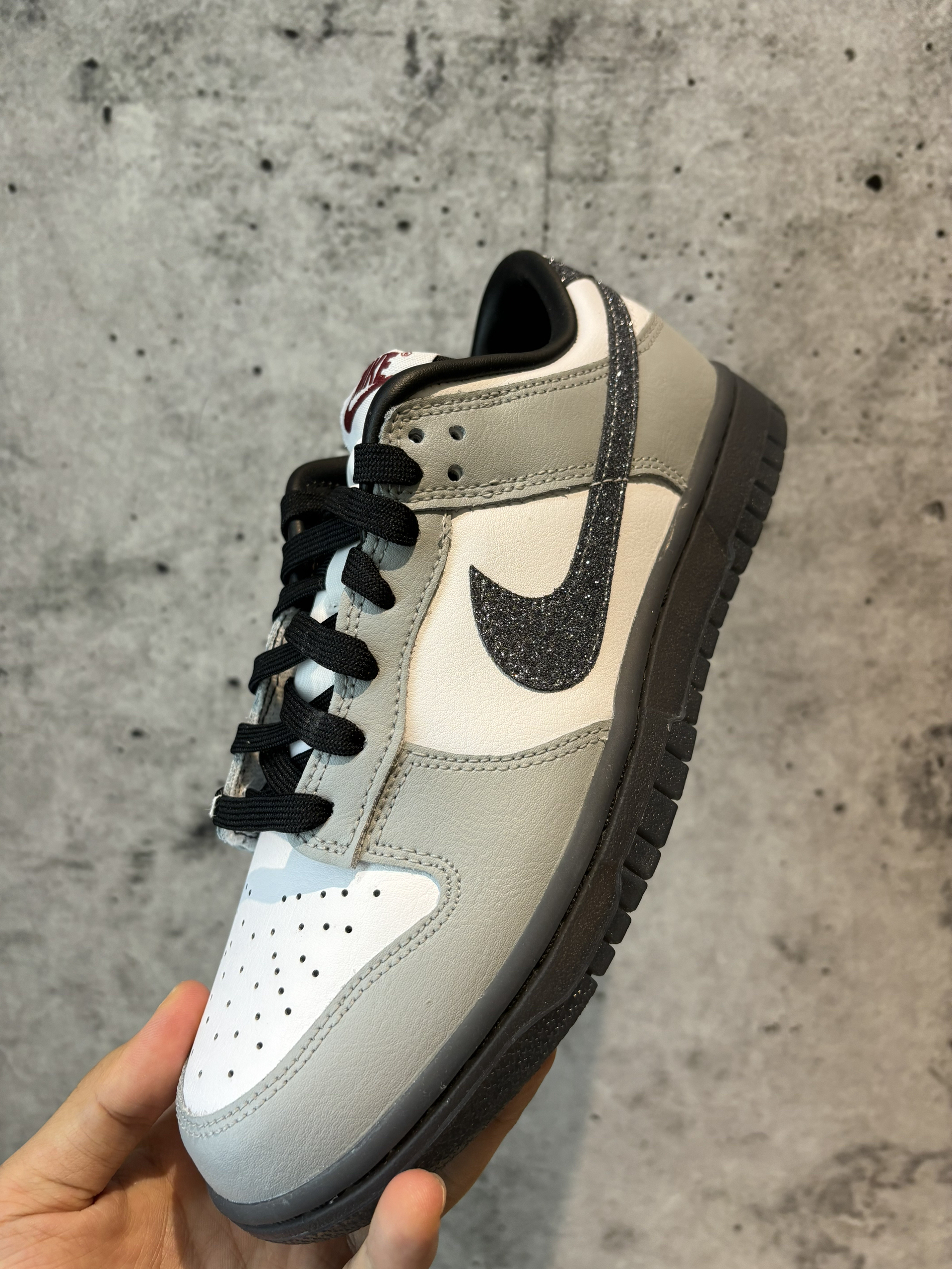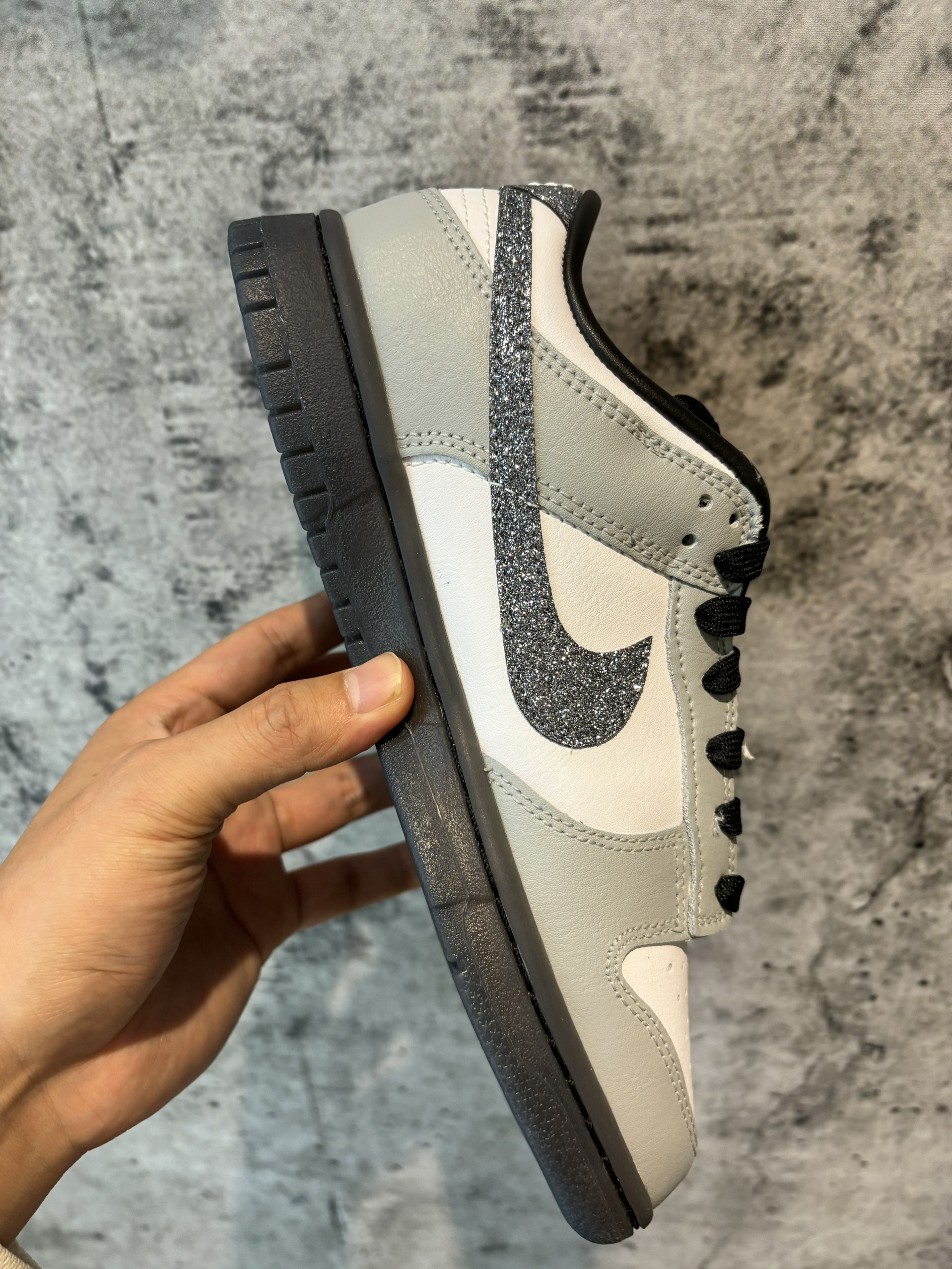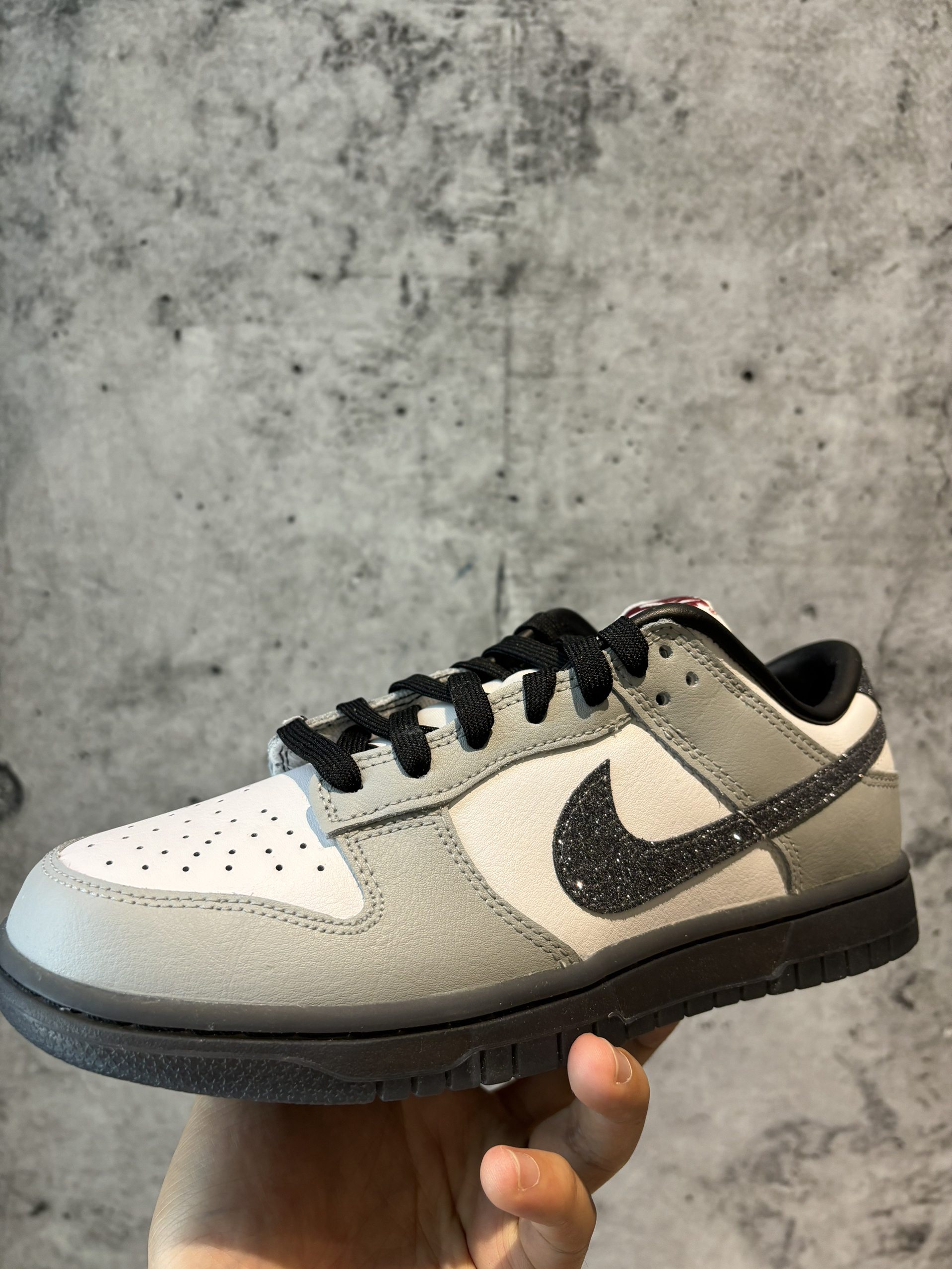 #鞋王争霸赛 #入秋的第一双鞋 #这双鞋我穿了很久 #新品档案库 一双施华洛世奇dunk你敢信吗? 配色灰黑色为主搭配白色 钩子银色元素点缀 这个小钻石💎是可以掉下来的 后跟处也有 尺码建议比aj1大半码 水晶底灰色很耐用 内衬是皮的需要穿厚点的袜子