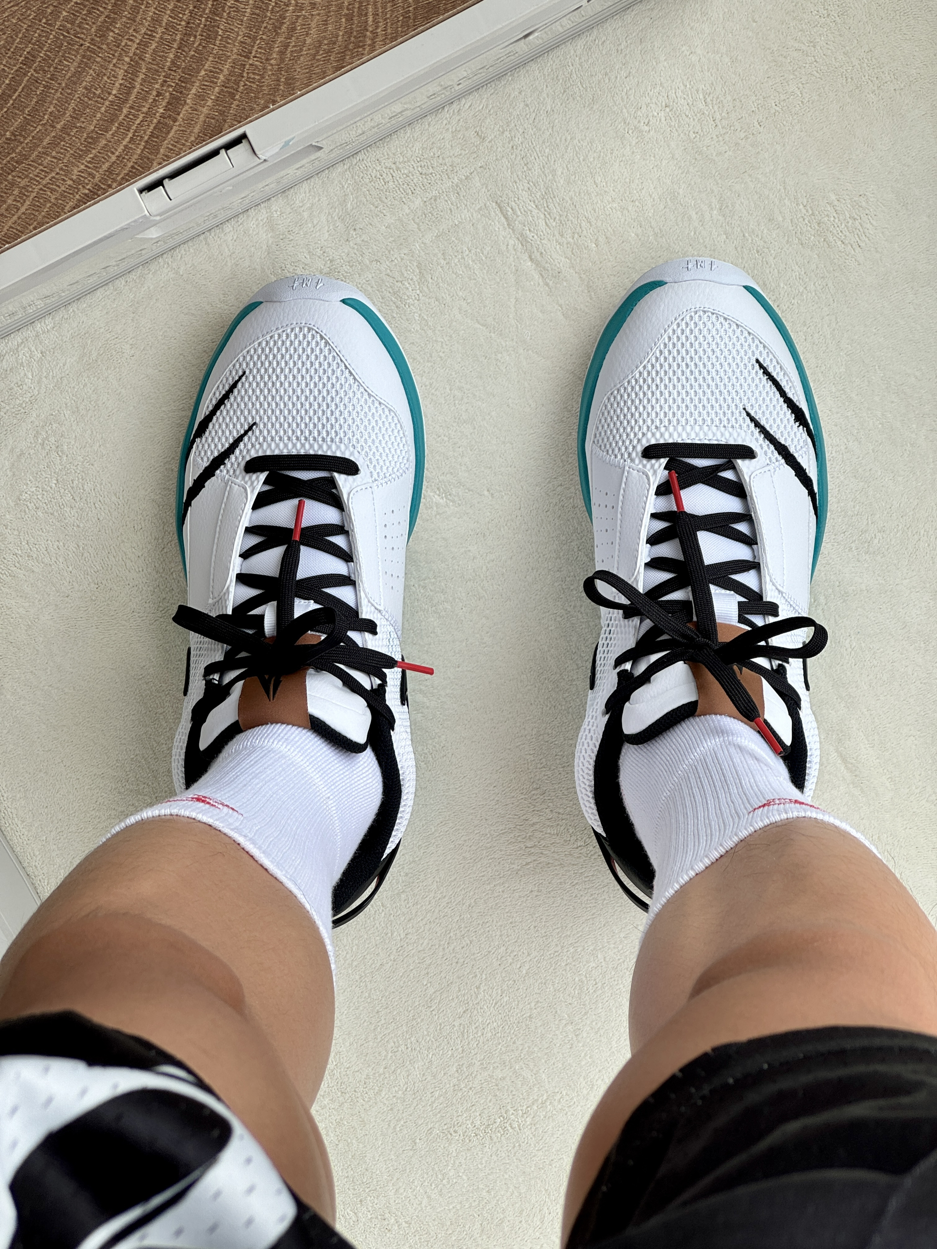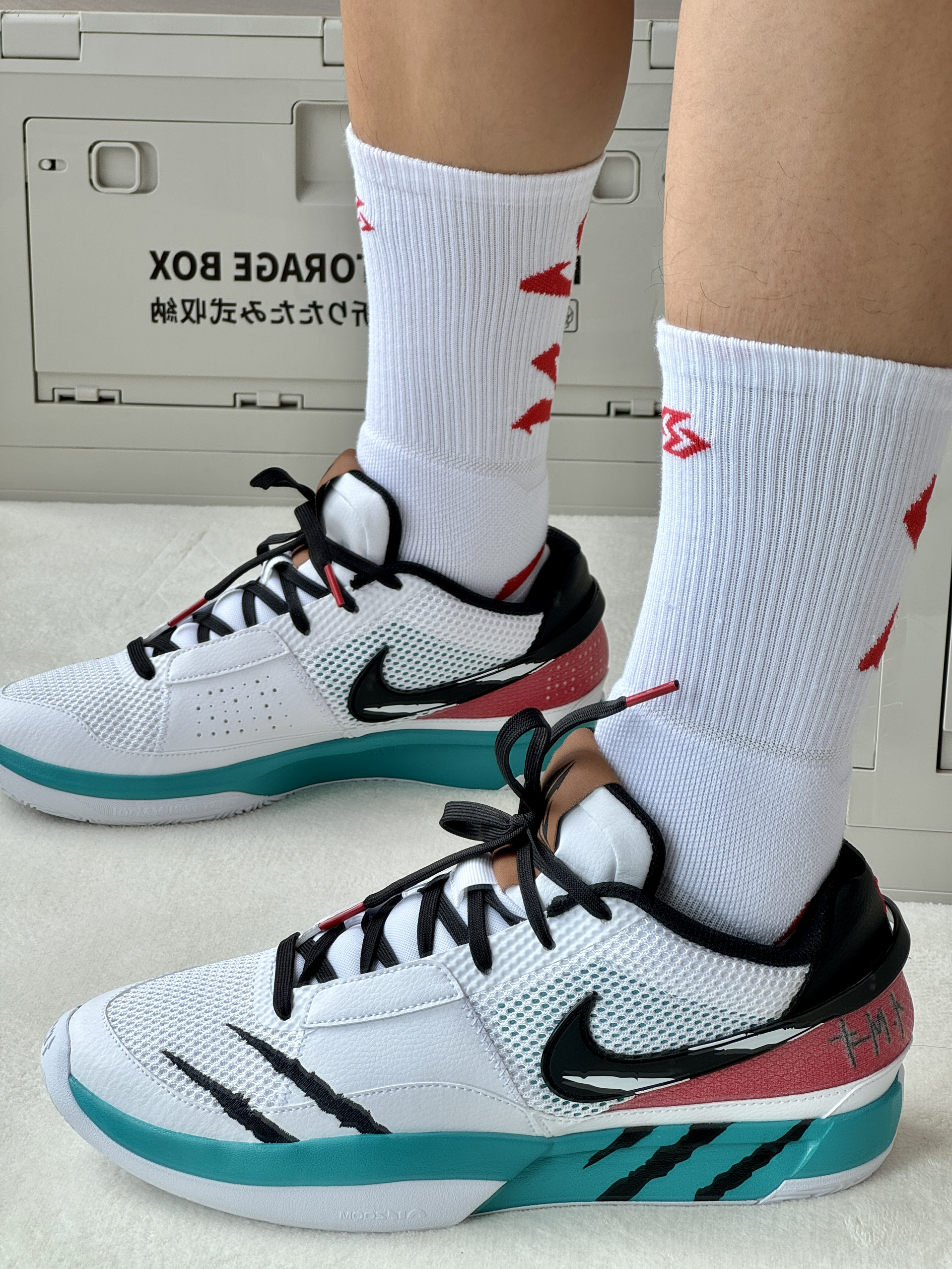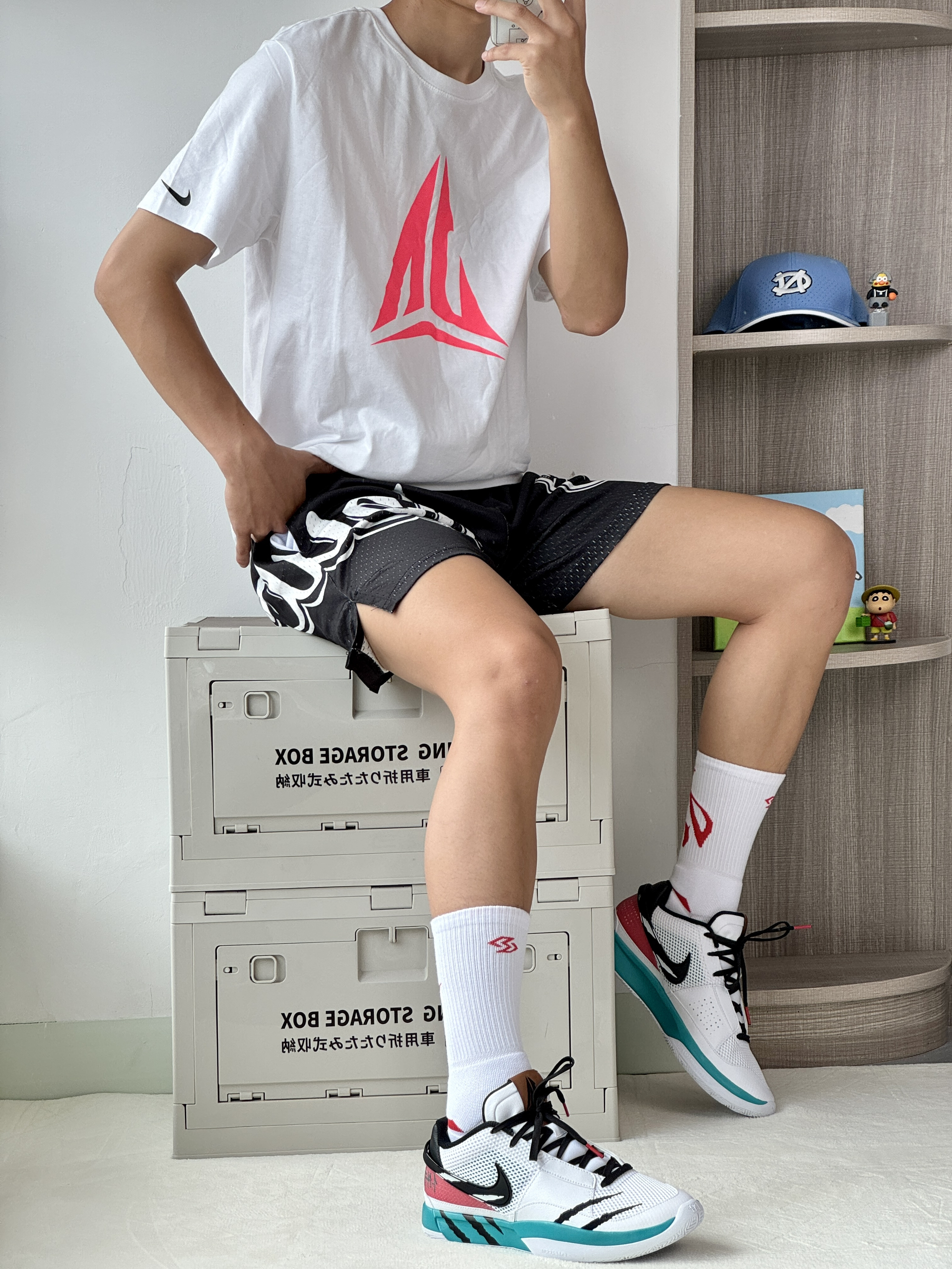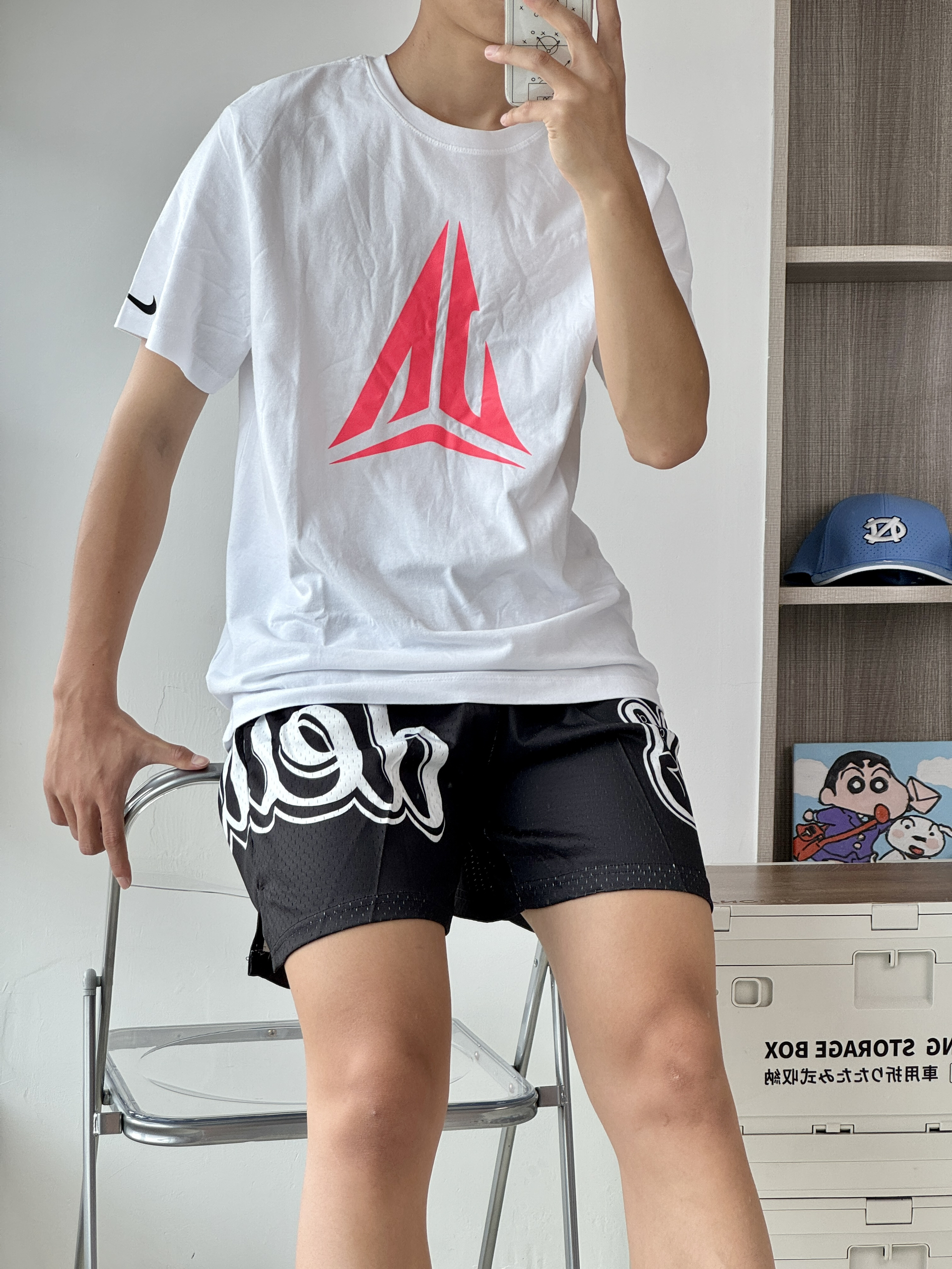 oi哈喽大家爱球鞋穿搭的小学生的故事来 给你们分享上脚一波莫兰特1新配色! 👔选择一件白粉色的短袖莫兰特的粉色 大logo帅气又吸睛 🩳搭配一条黑色美式短裤印花好看百搭 打球穿它很合适 👟莫兰特1前段时间新出的灰熊主场配色 很有亮点的侧面的刺绣抓痕白绿黑的颜色 搭配上脚颜值还不错的👌