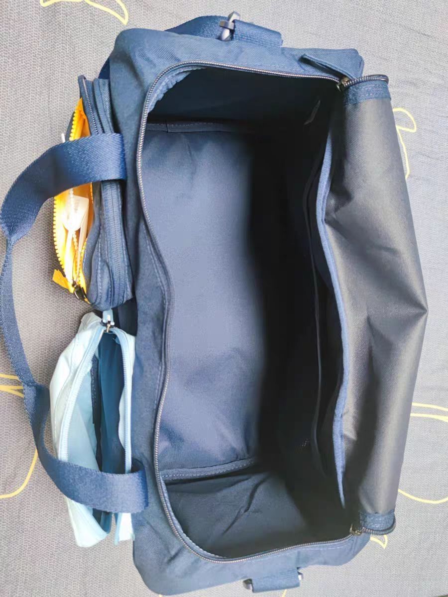 包包是可拎可挎的,肩带长短可以调节,对身高没要求 可以挂行李箱上,携带很方便 口袋多,容量大,可以放很多东西 健身用的水杯,鞋,毛巾;旅行或者出差需要带的洗漱用品,换洗衣物;上学用的东西都能用它装下