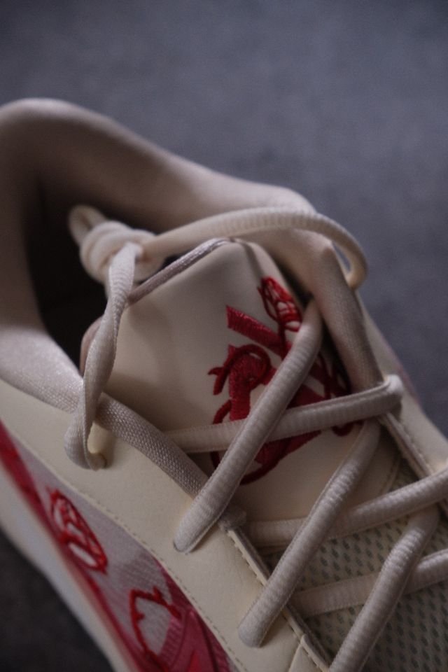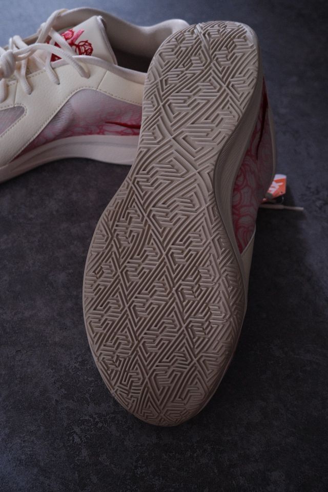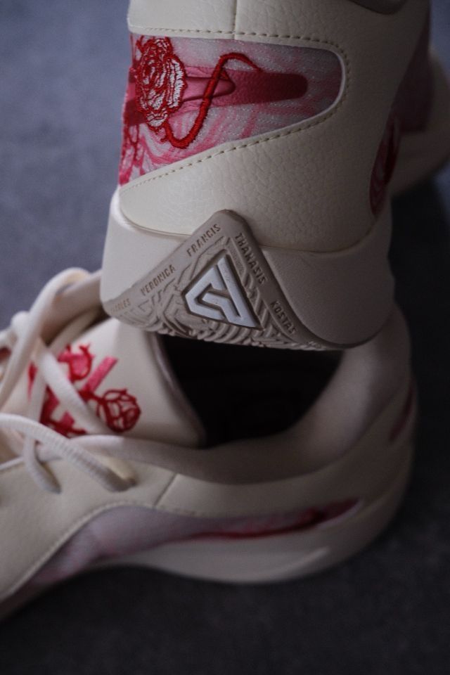 字母哥 6 代似有 1 代鞋底“搬”到鞋面之感。1 代鞋底玫瑰图案是钩子 logo 延伸,6 代鞋面也有玫瑰,代表对父亲怀念。这或许是字母哥纪念父亲的方式,让人感受到他的深情与独特用心。