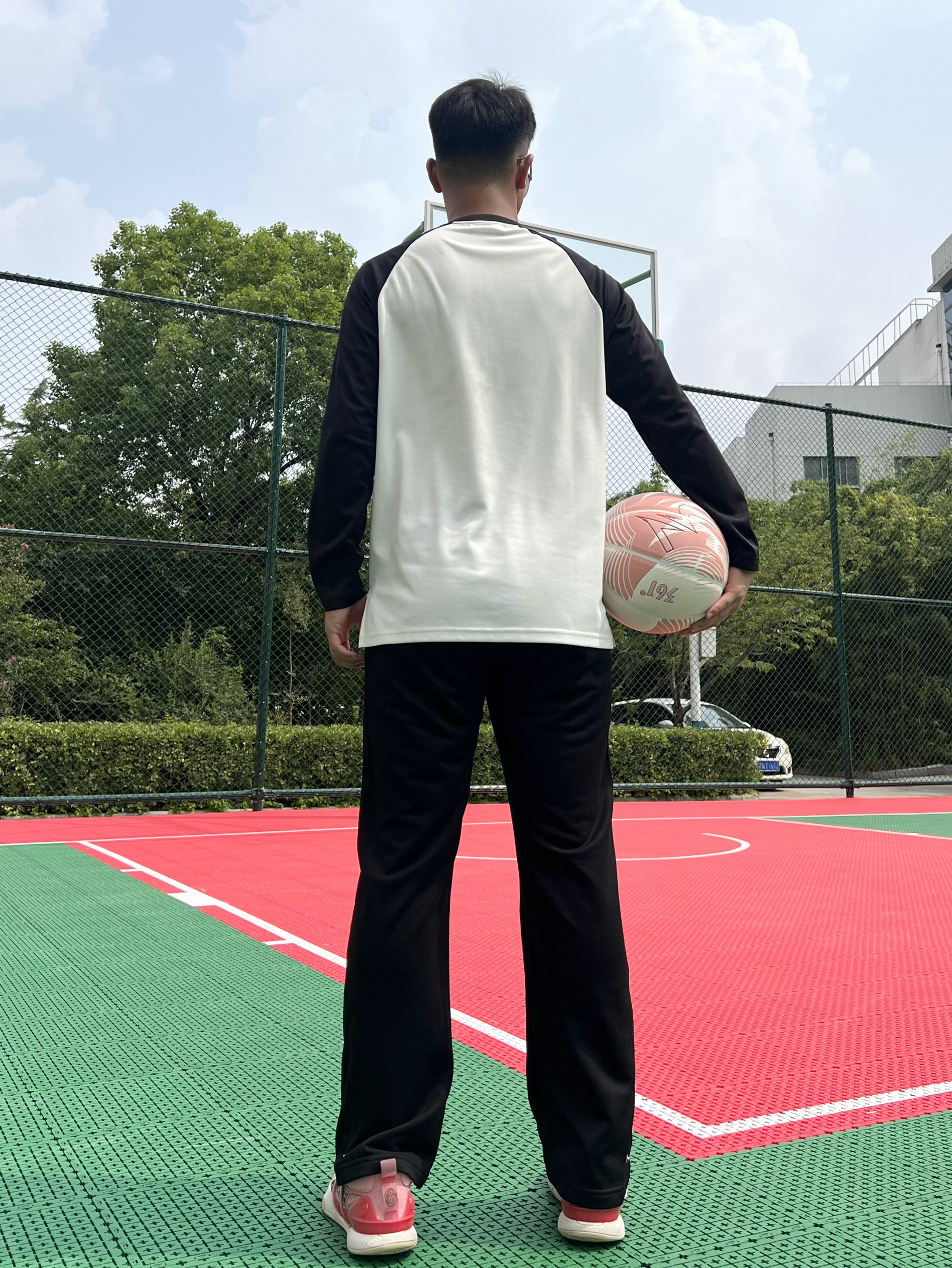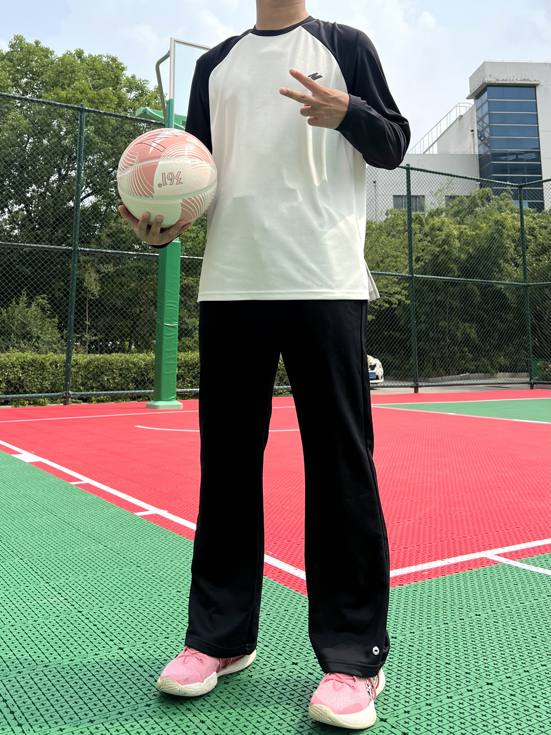 黑白撞色投篮服绝对帅✨ 一条微喇叭长裤兼顾日常和运动 直筒➕纽扣 满满的美式设计 来双粉红豹篮球鞋👟 绝了