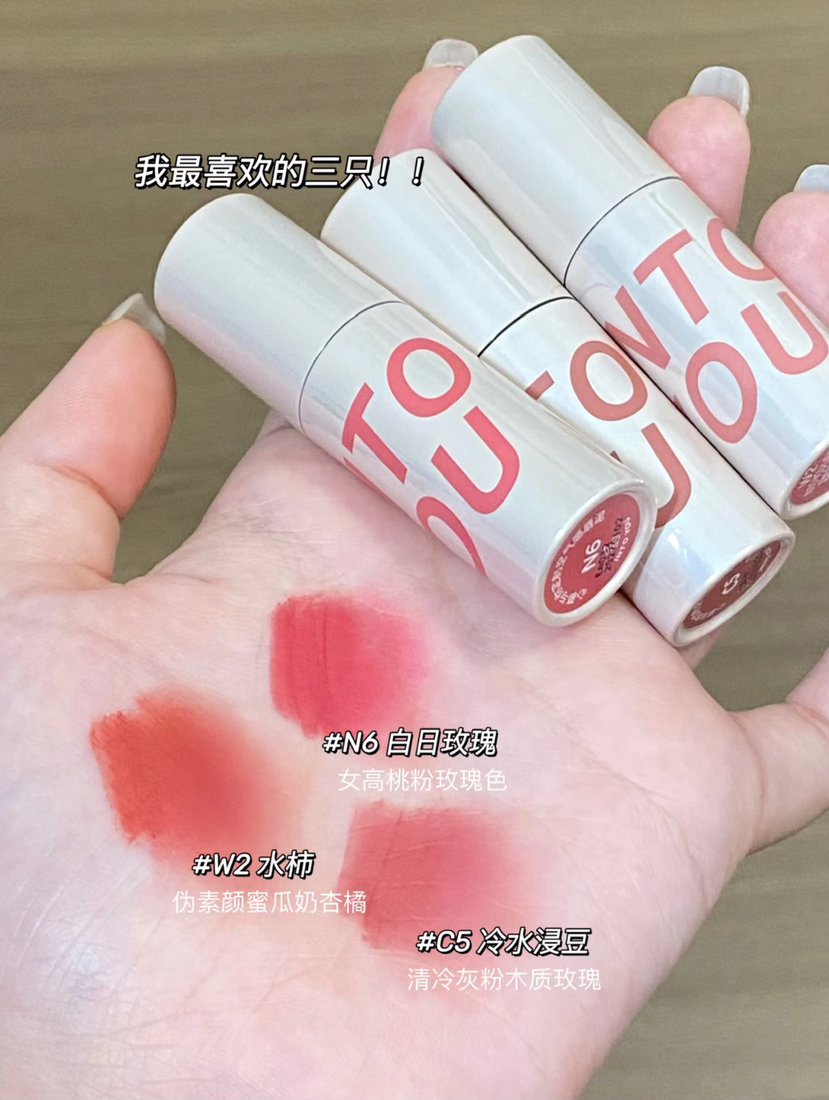all in了!印度油我的神!韩里韩气嫩妹色!😊 狠狠all in了20只的快乐!!💕 intoyou的调色师真的很有一手诶韩里韩气的伪素颜拿捏! 而且质地是那种很好涂开的轻薄空气感有做了三个系列 W-适合暖皮zui喜欢w2水柿伪素颜蜜瓜奶杏橘 N-适合中性皮n6白日玫瑰女高桃粉玫瑰色 C-适合冷皮c5冷水浸豆清冷灰木粉木制玫瑰🌸
