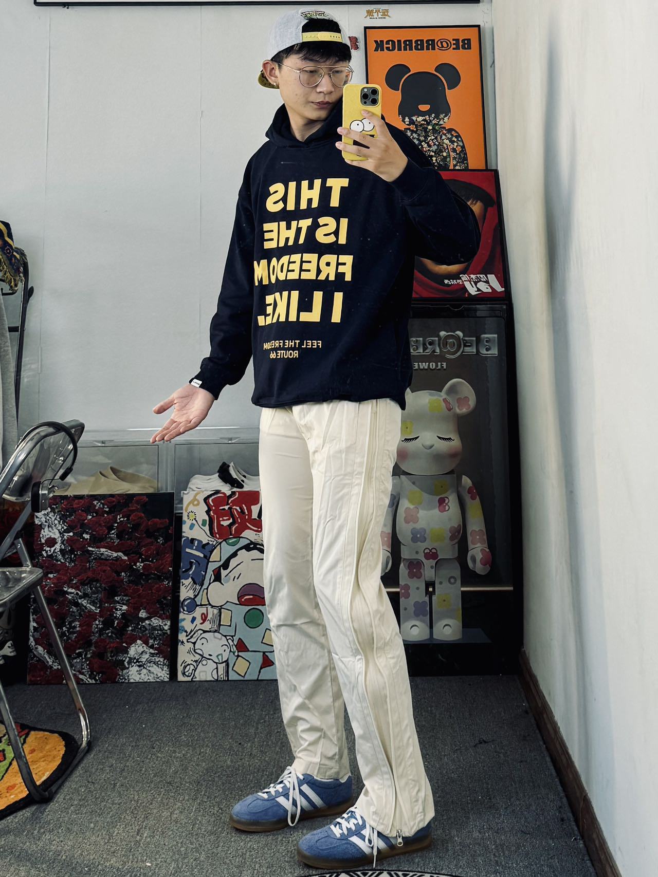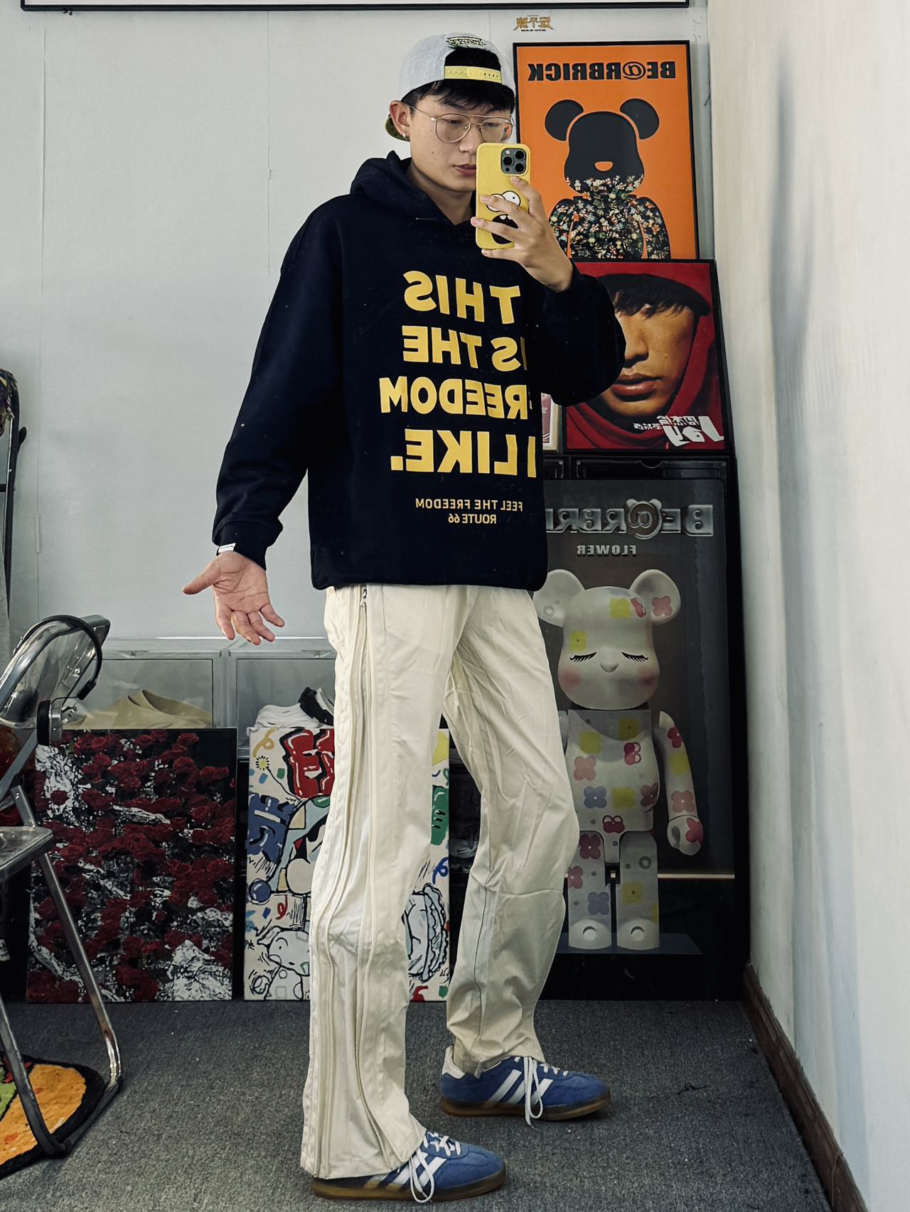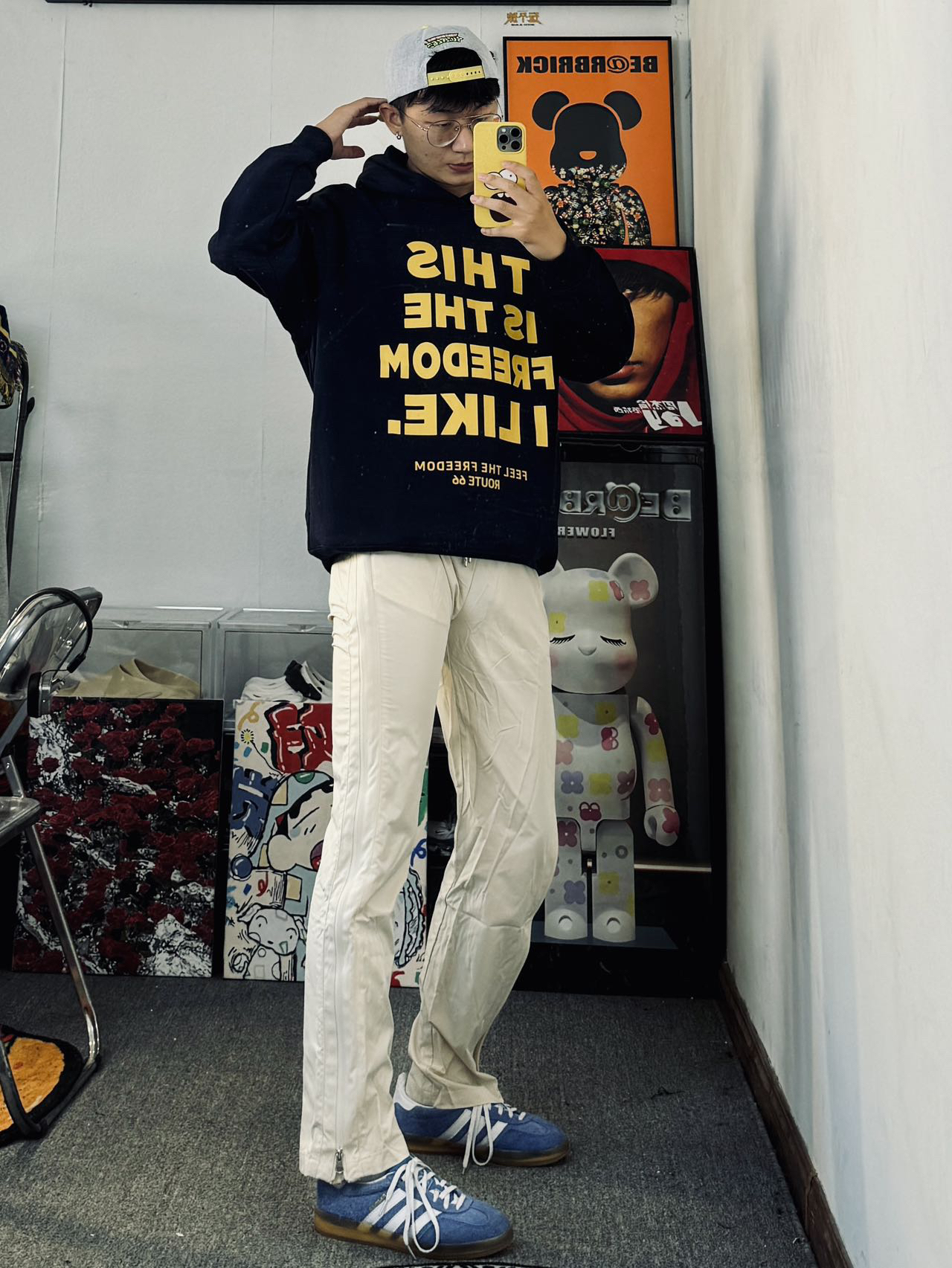 冰美式今日穿搭 👔上衣是我早秋第一件卫衣 藏青配色上身显白 加上黄色印花Logo的点缀 高级感十足 宽松款式✨ — 👖裤子搭配了一条设计感满满的休闲裤 侧面三拉链的设计个性十足 面料轻薄透气 四季都可以穿🔆 身高/体重:177/135 👔l👖xl