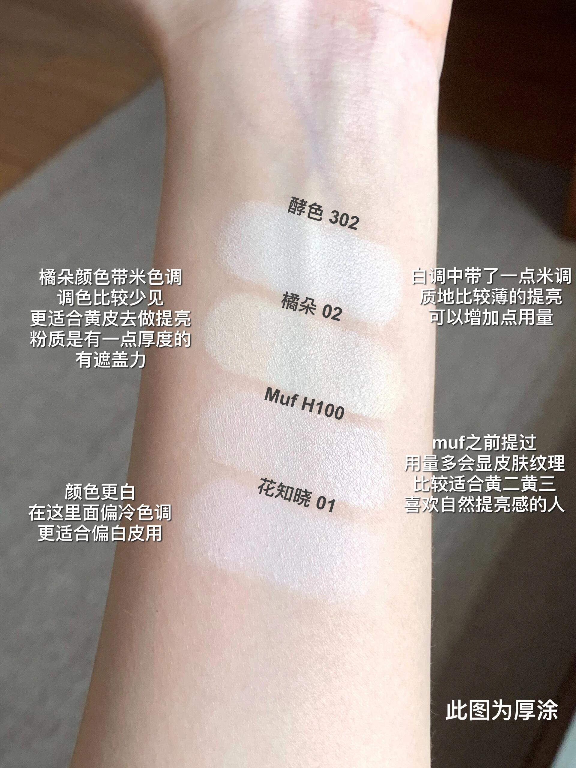 👩🏫热门哑光高光对比 🎨酵色 302 白调中带了一点米调,质地比较薄的提亮,可以适当增加用量 🎨橘朵 02树影盘 橘朵修容盘里的哑光高光 颜色带米色调,不太常见的调色,粉质有遮盖力 🎨muf h100 用量多会显皮肤纹理 适合喜欢自然提亮 🎨花知晓 01天鹅白雪 颜色更白 适合冷白皮