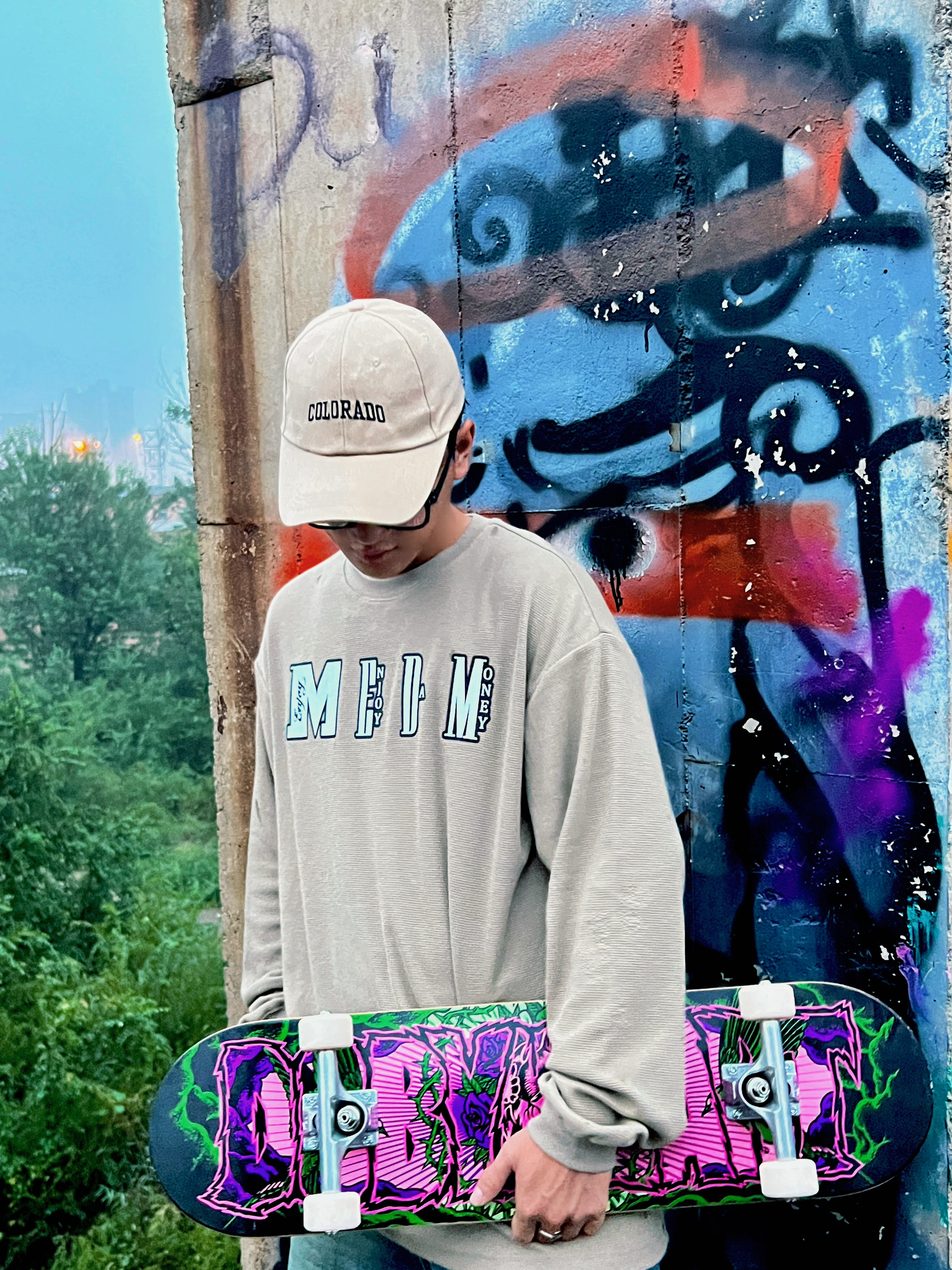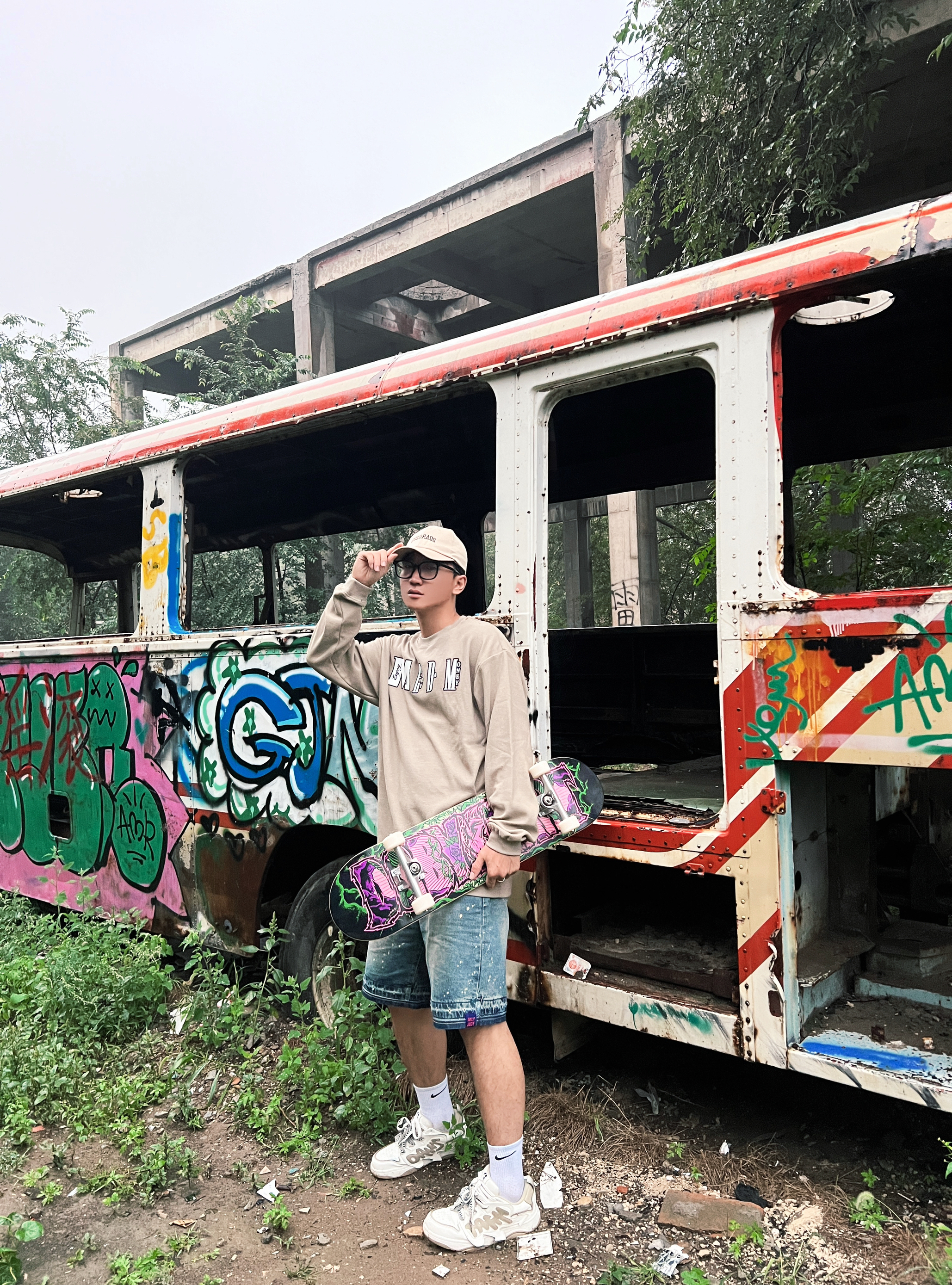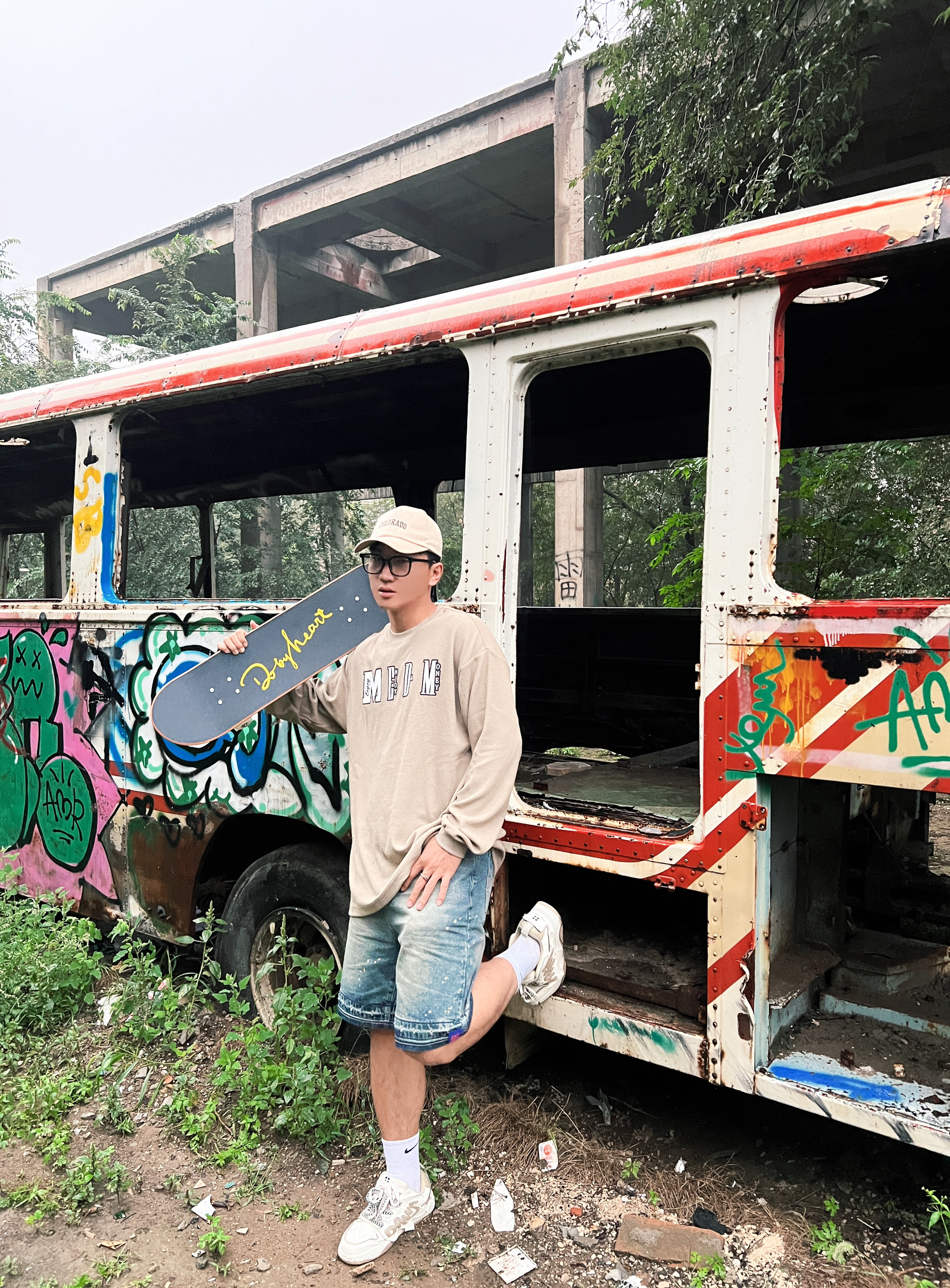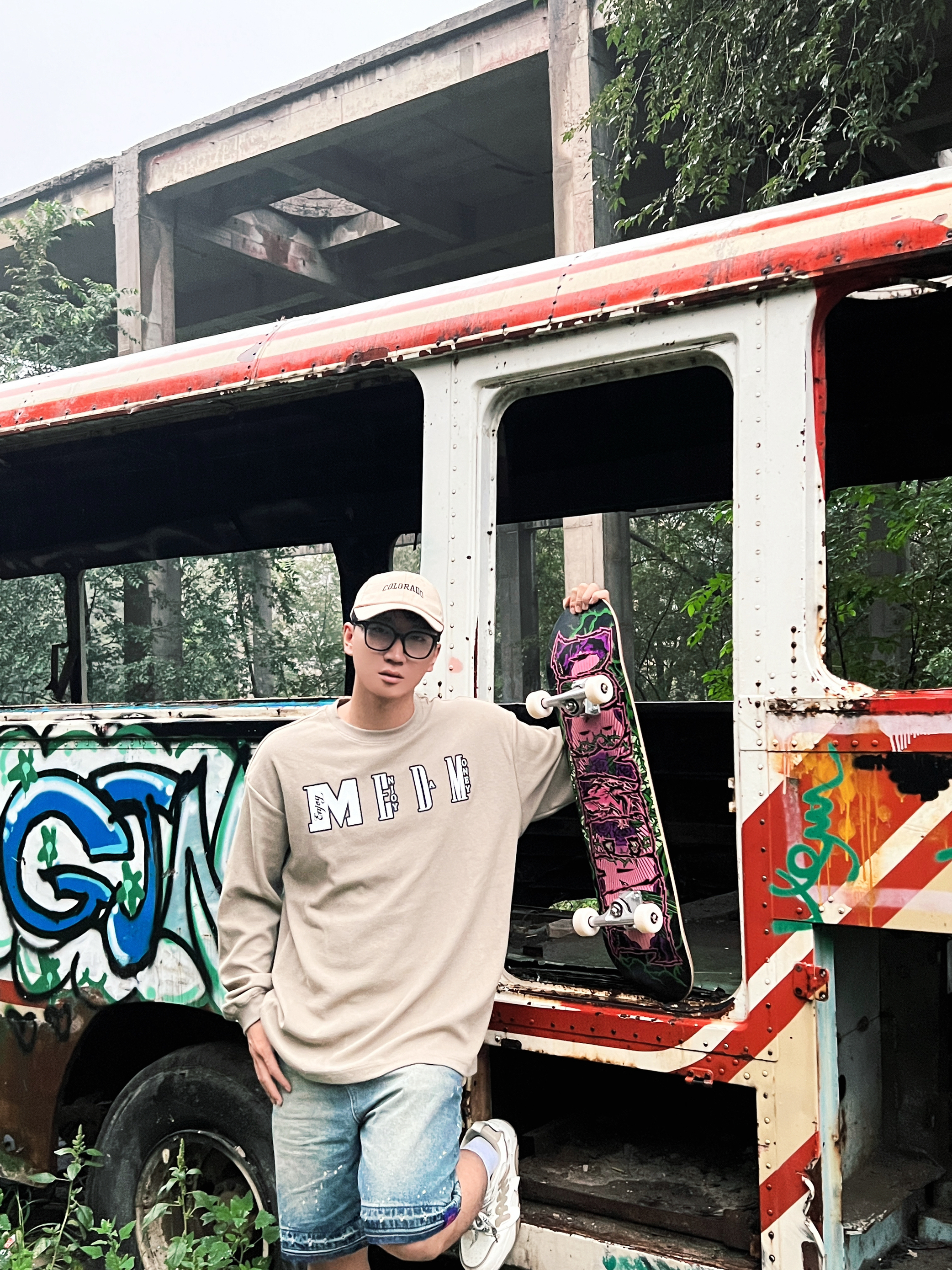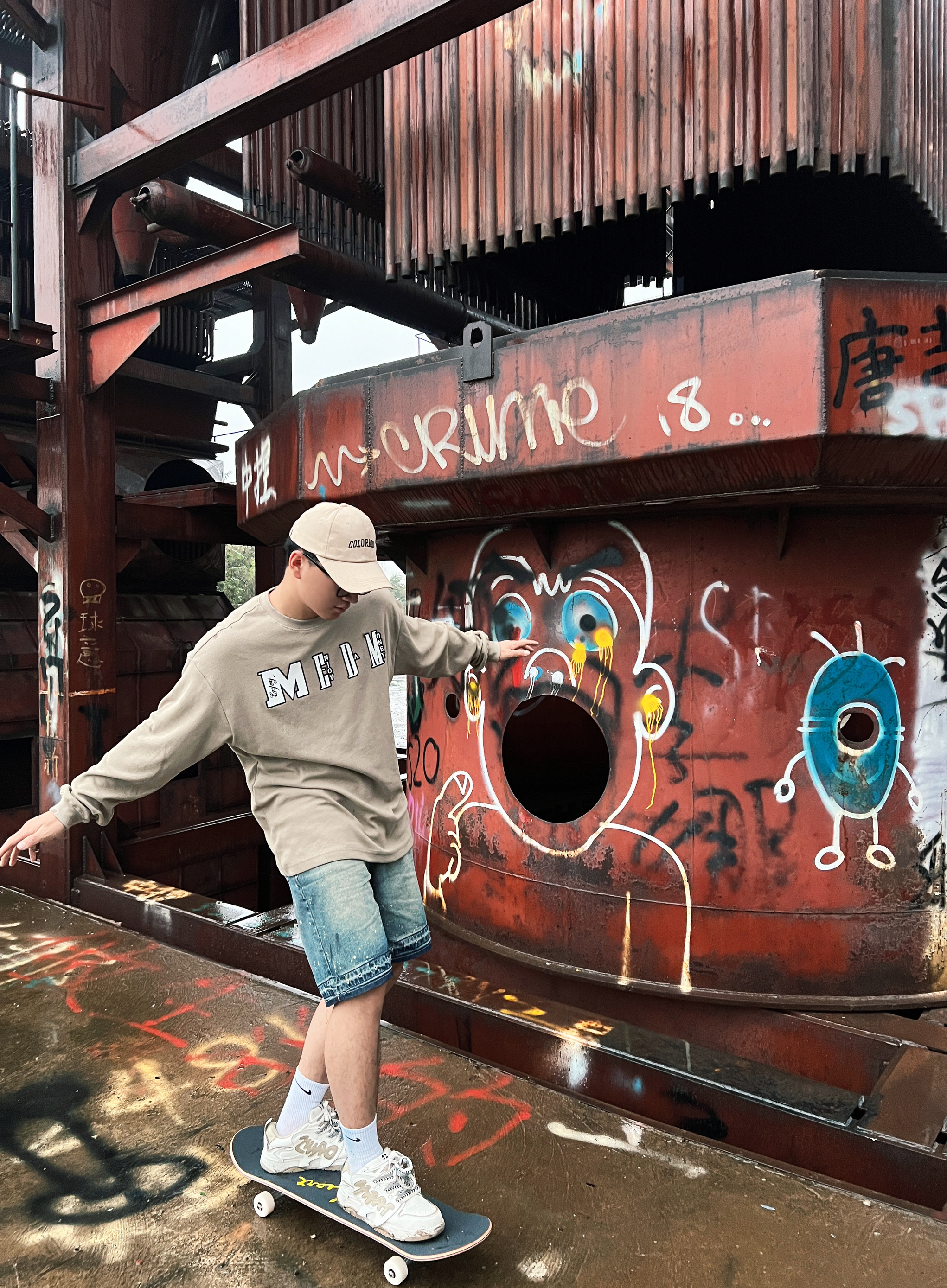 偶然找到一个涂鸦打卡地 带上DBH滑板去🛹~ 今天一身比较休闲搭配 上身华夫格家的简约长T恤 卡其色比较百搭 纯棉面料摸起来也hin舒服 搭配起来毫不费力 再来一条牛仔短裤🩳 简简单单比花哨的图案养眼不少