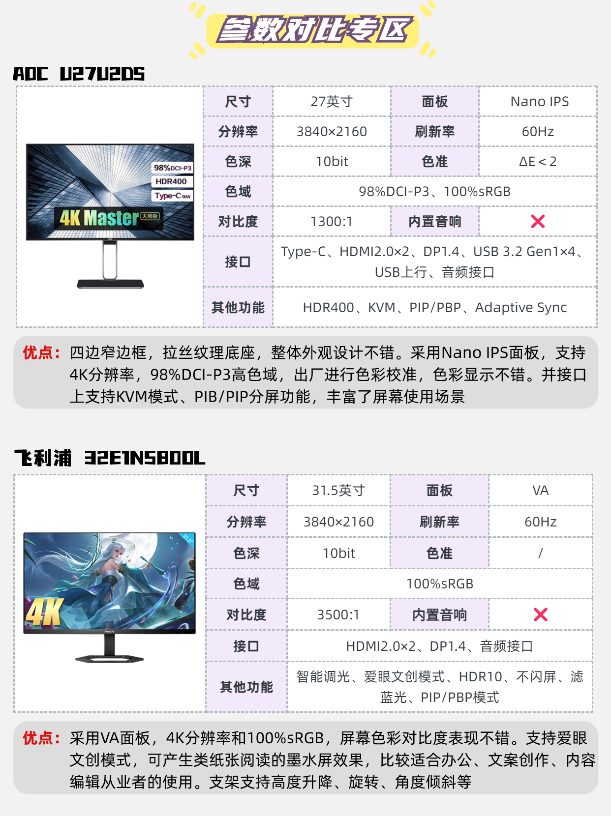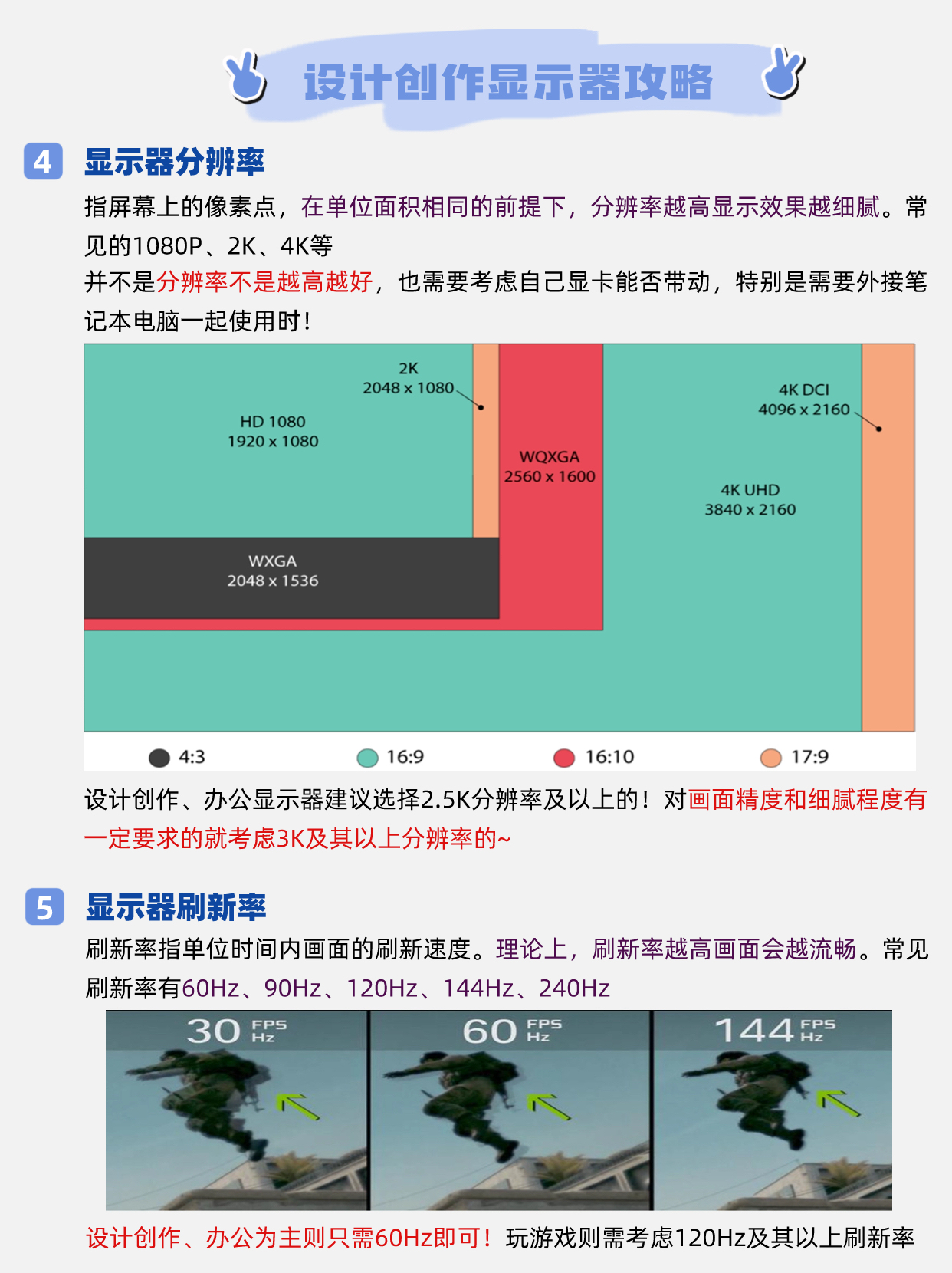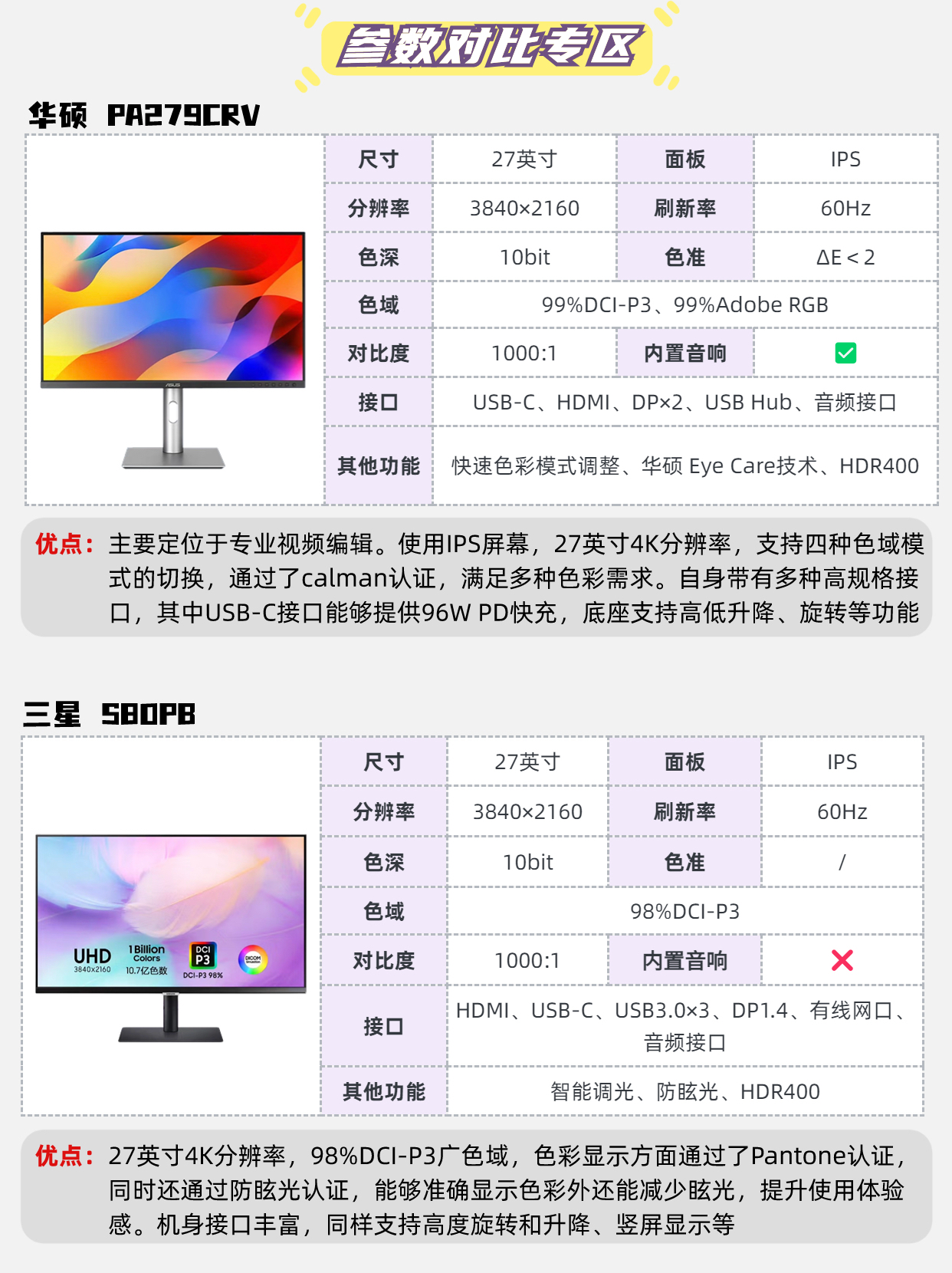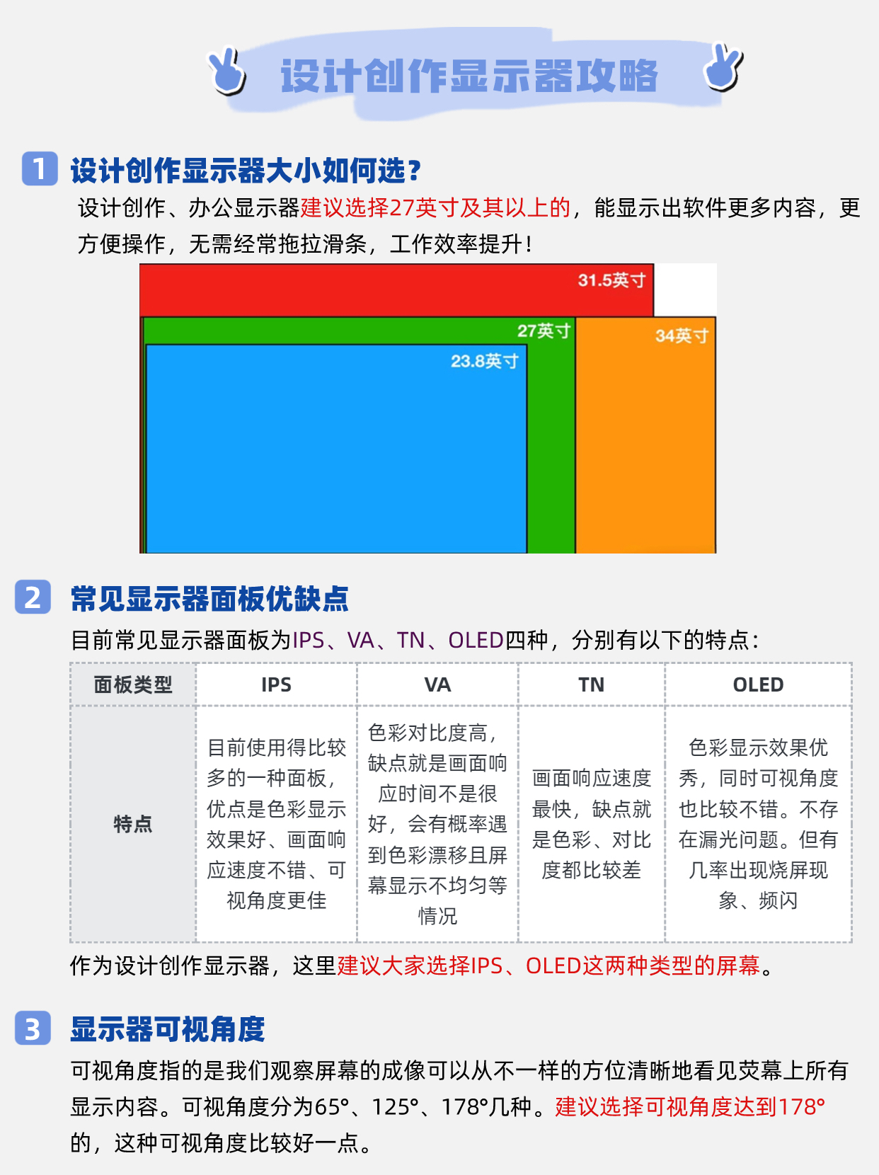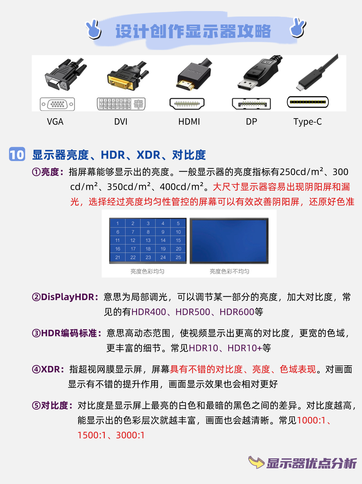 一台好用的显示器能大大提升办公、创作效率,那么专业显示器改怎么挑选呢❓已经给大家准备了详细选择攻略啦~ - ✅显示器主要考虑参数:(图二~图六) 主要考虑面板、可视角度、分辨率、刷新率、色域、色准、色深、亮度、HDR、XDR、对比度等参数🖥 如果是设计类人群则主要留意分辨率、色域、色准、色深❗有条件的话选择支持全链路色准的显示器。 设计专业性有需求的话,首选明基PD系列,是很多大厂设计师、设计大佬...