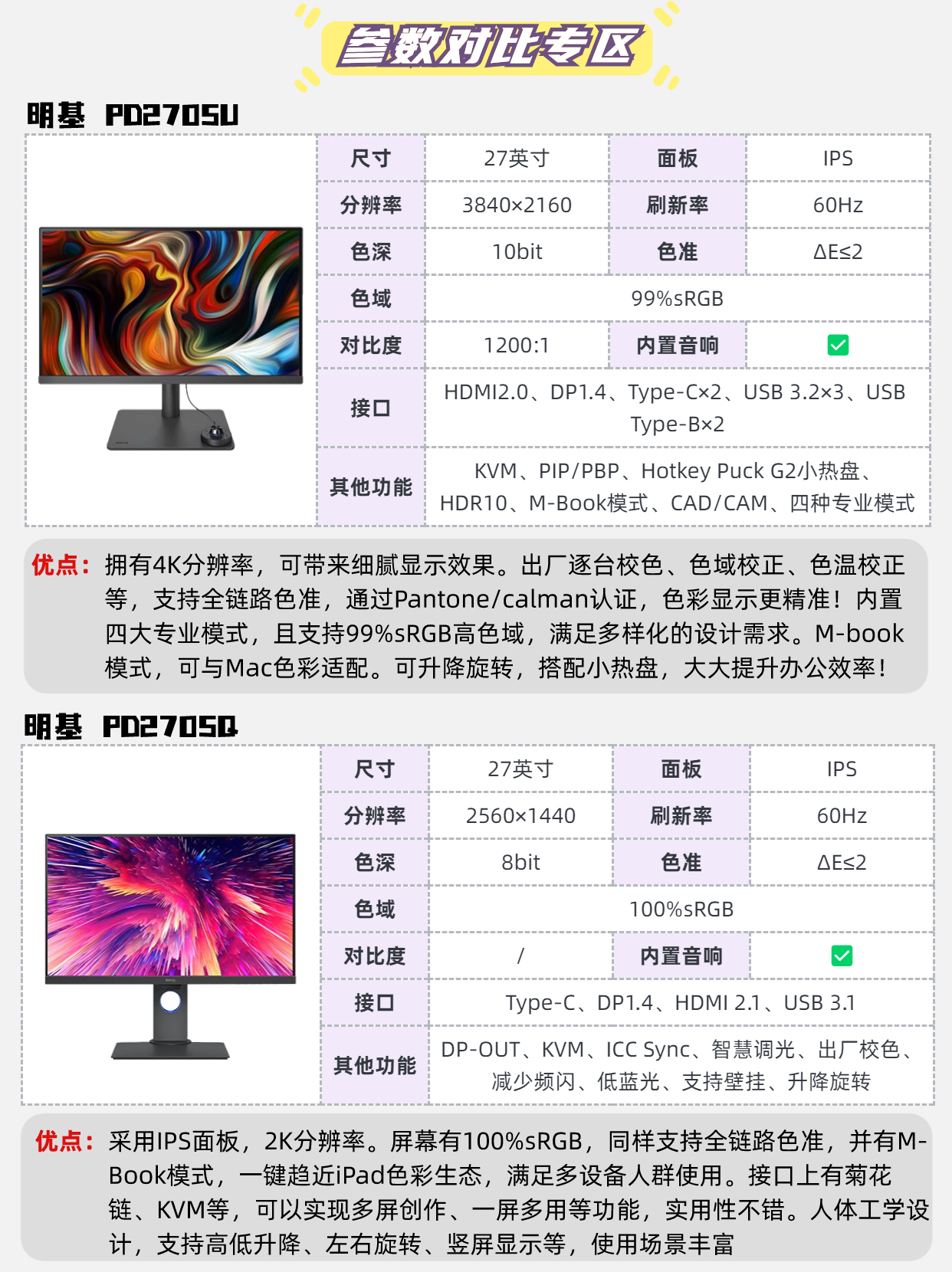 本篇笔记关联了BenQ/明基 PD系列 27英寸 潘通认证色彩显示器 PD2705U IPS/4K/10bit/TypeC/OSD控制器、Benq/明基 PD2705Q 27英寸2K平面显示器 黑等商品,为用户提供真实的使用体验和购买参考。
