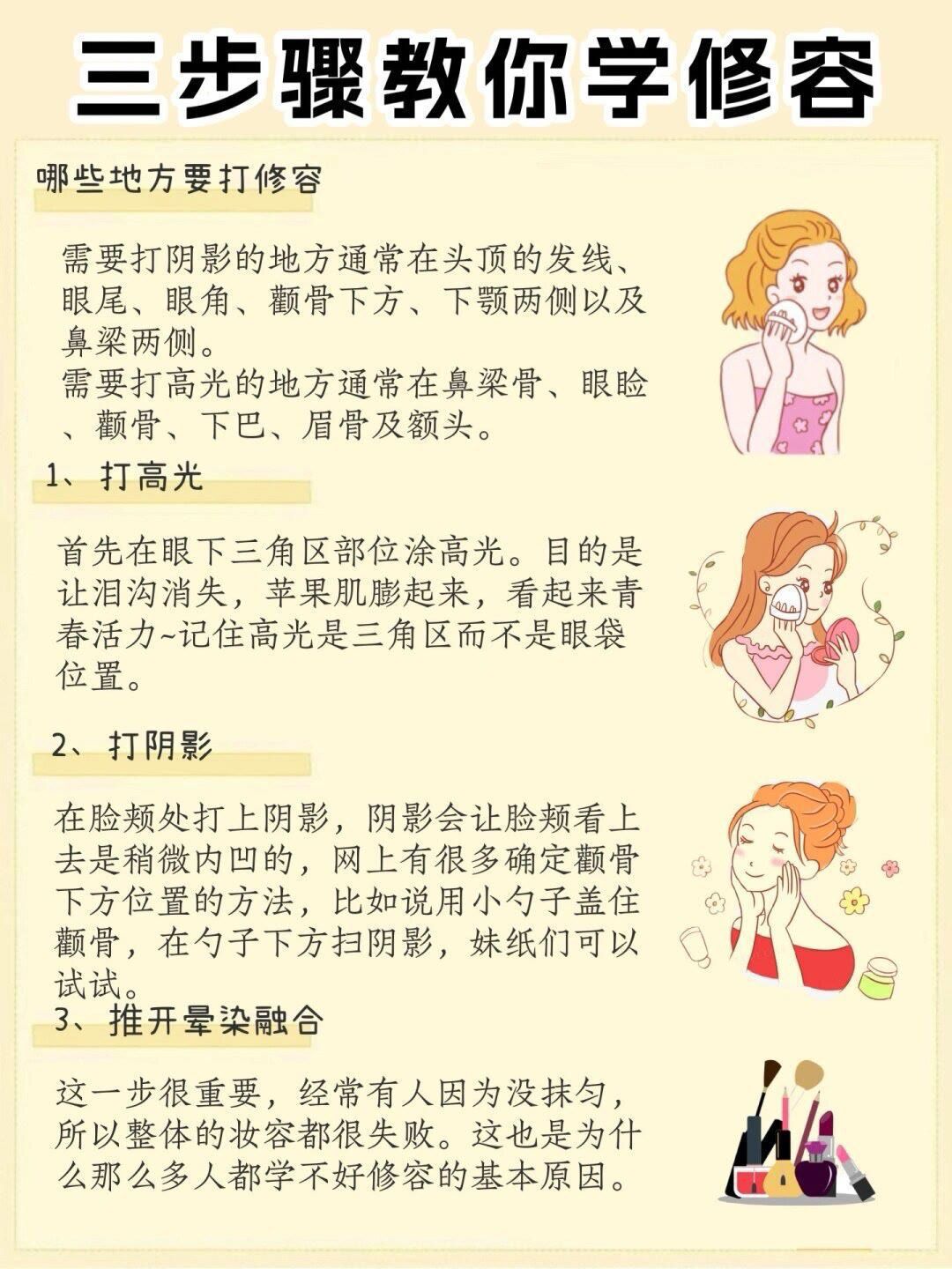 哪些地方要打修容 需要打阴影的地方通常在头顶的发线、眼尾、眼角、颧骨下方、下颚两侧以及鼻梁两侧。 需要打高光的地方通常在鼻梁骨、眼睑、颧骨、下巴、眉骨及额头。 1️⃣打高光 首先在眼下三角区部位涂高光。目的是让泪沟消失,苹果肌膨起来,看起来青春活力~记住高光是三角区而不是眼袋位置。 2️⃣打阴影 在脸颊处打上阴影,阴影会让脸颊看上去是稍微内凹的,网上有很多确定颧骨下方位置的方法,比如说用小勺子盖住...