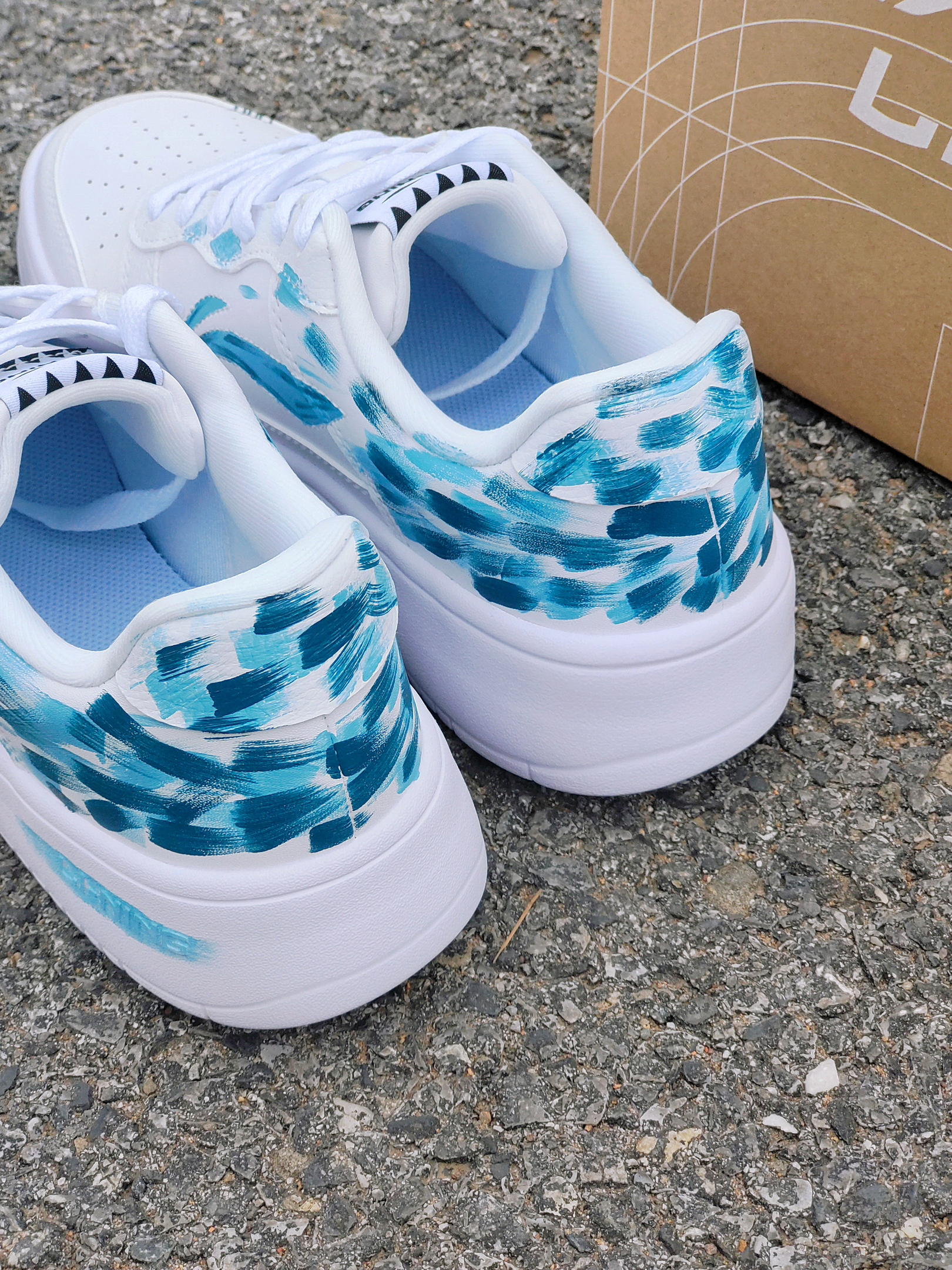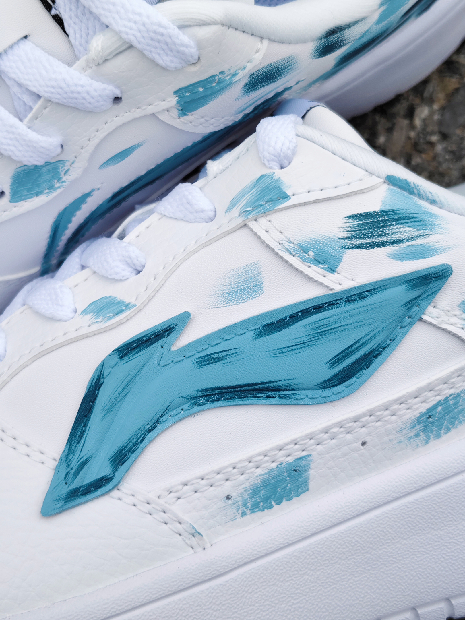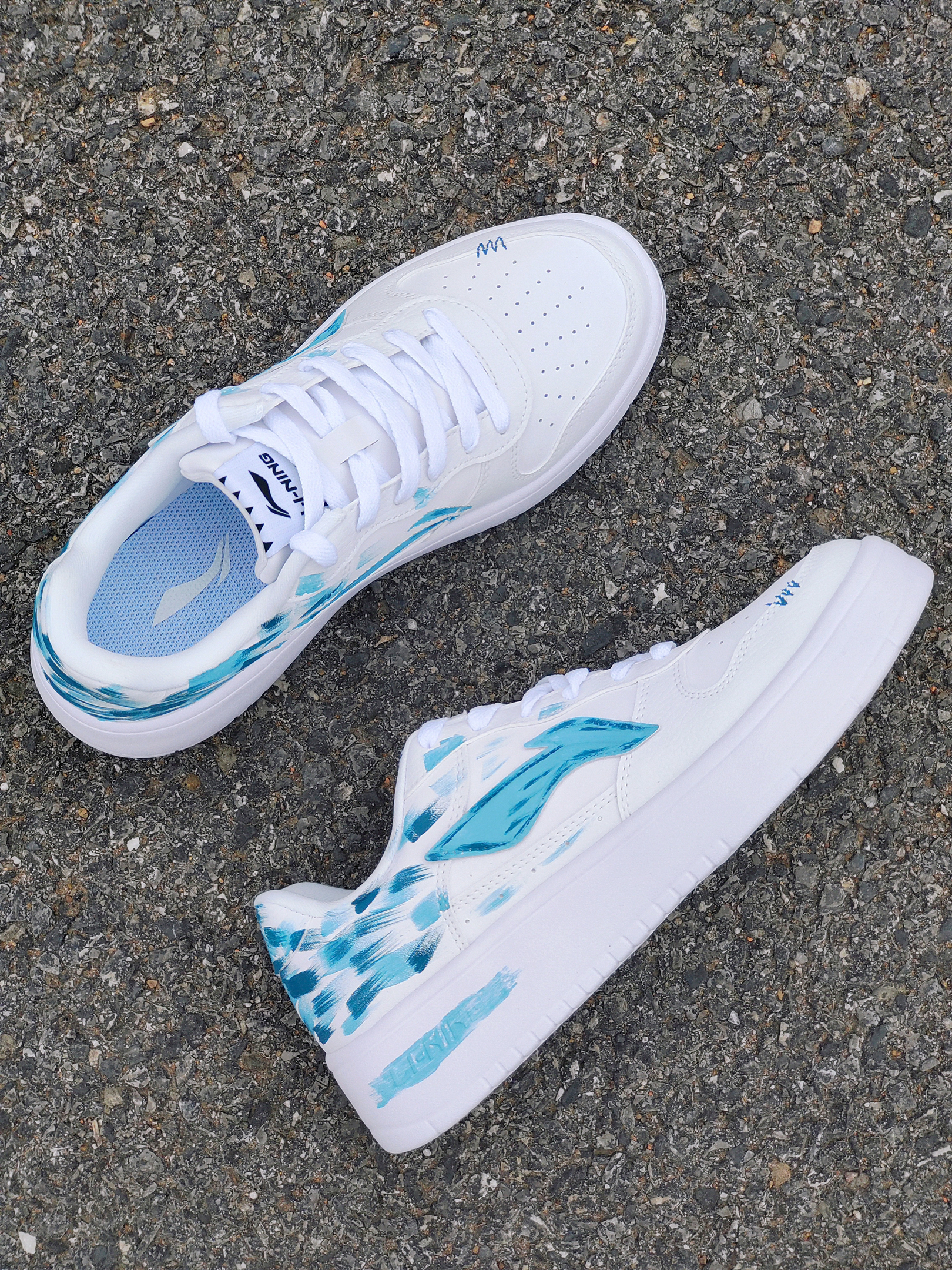 这还是我见过的那双小白鞋吗 蓝绿色的涂鸦,有一种看绿洲的感觉 鞋子侧面的logo也做了同样颜色的点缀,还挺有细节的~ 上脚脚感真嘟还不错,鞋子比较软弹,比较适合户外远足游玩
