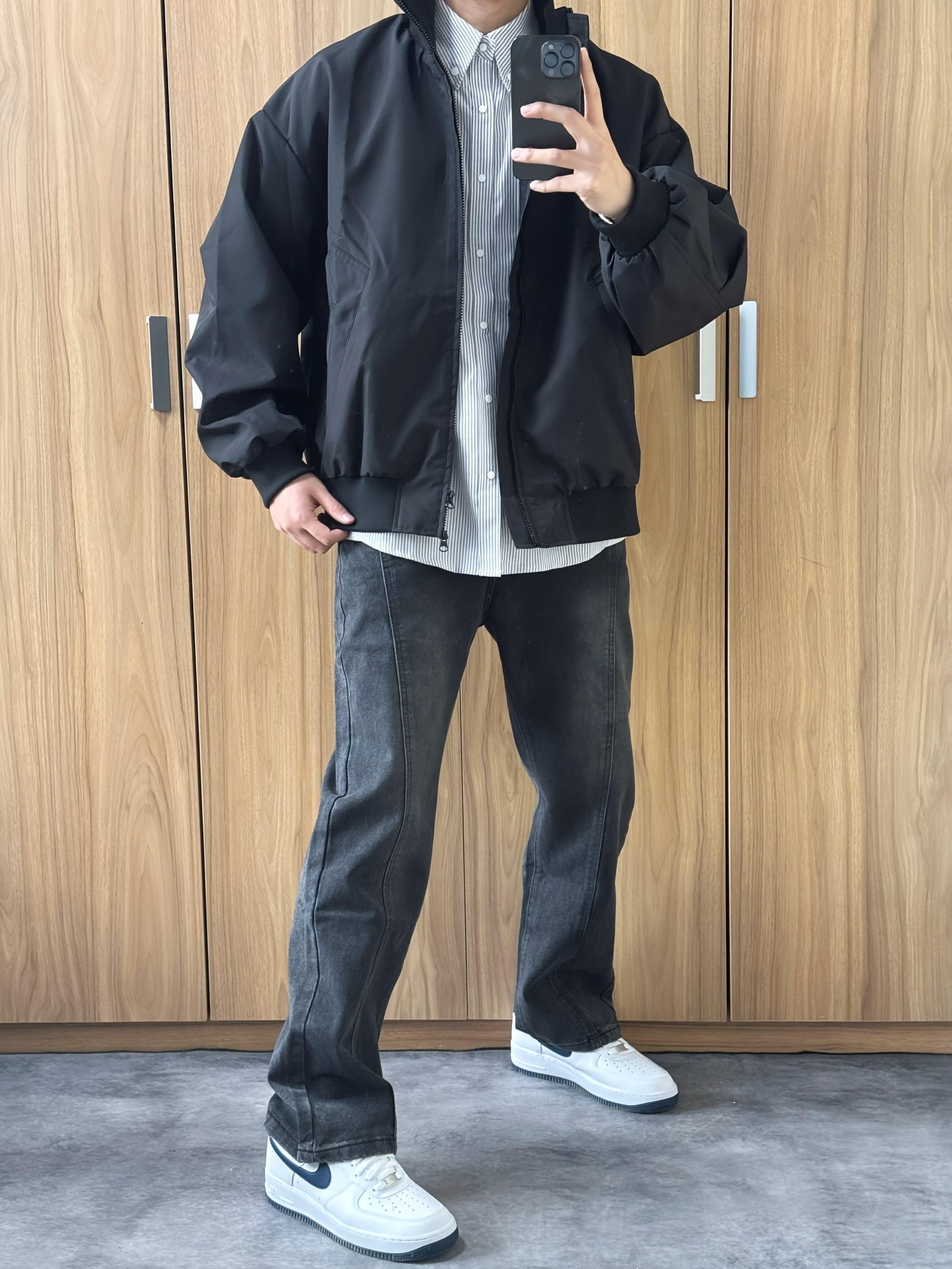 今日上身条纹休闲长袖复古运动立领夹克 搭配一条直筒宽松休闲牛仔裤 上脚的是一双黑白拼色低帮板鞋 早八人上课毫不费力穿搭 简单的黑白色系 百搭的牛仔裤 轻松搞定