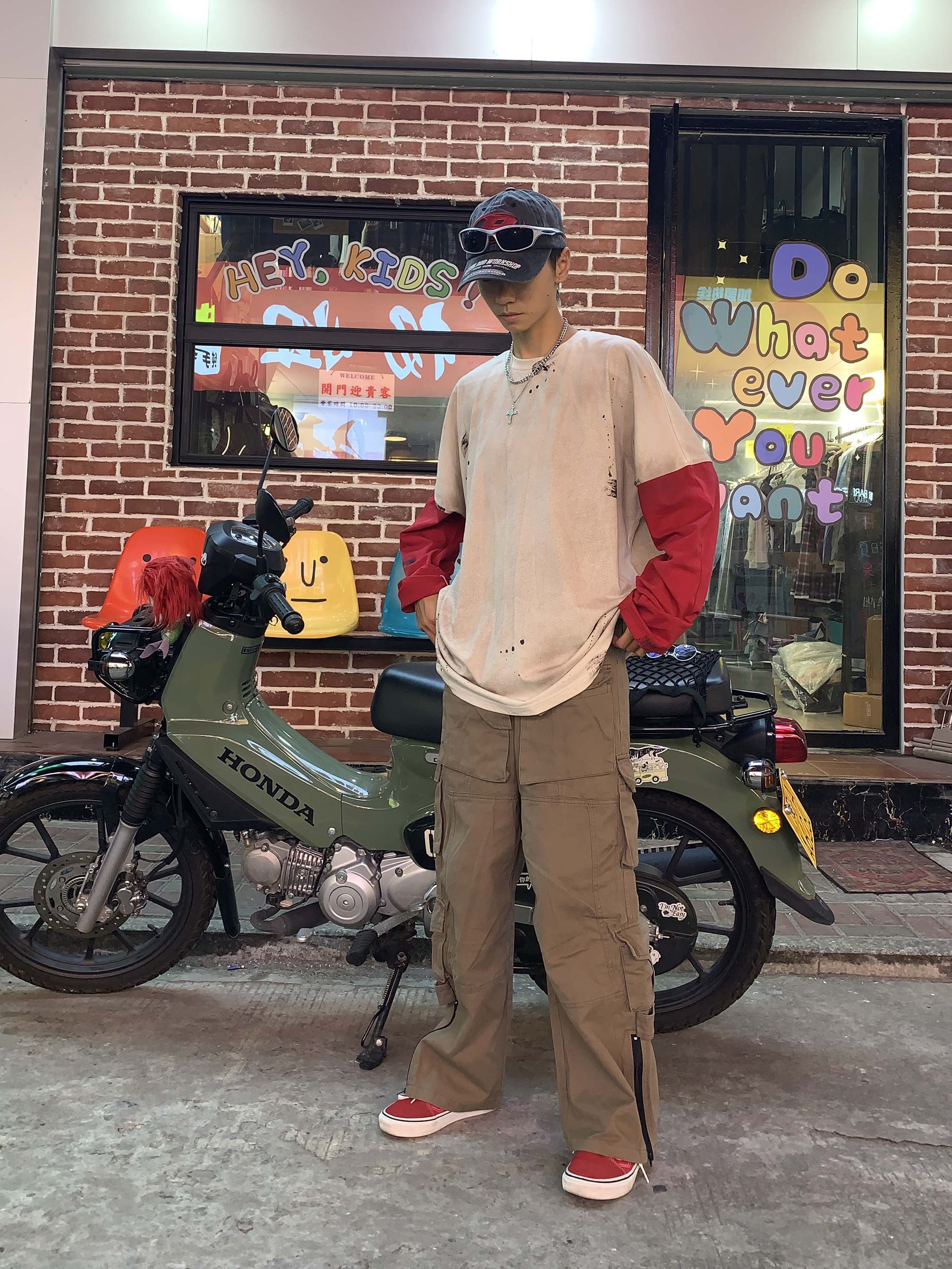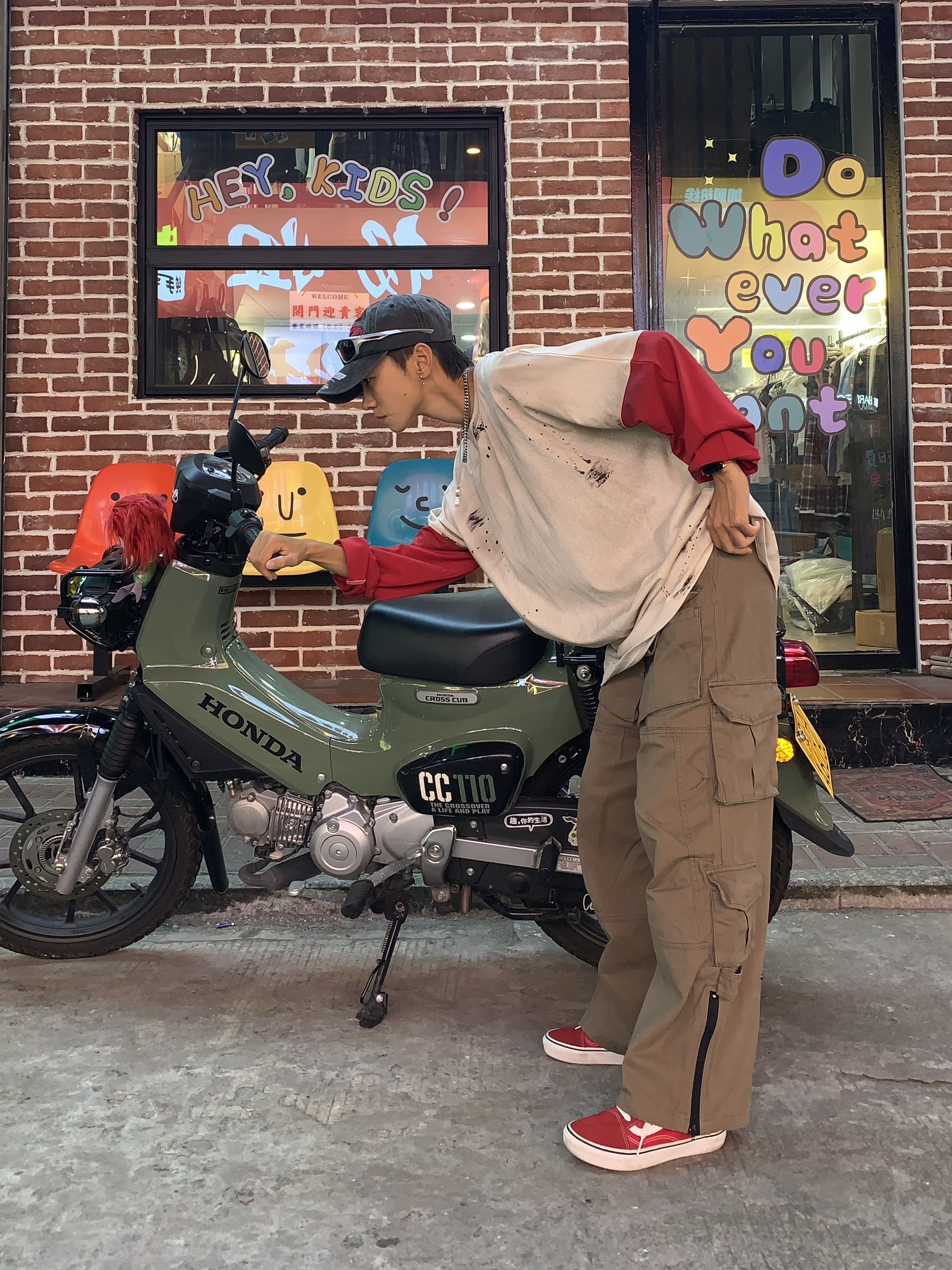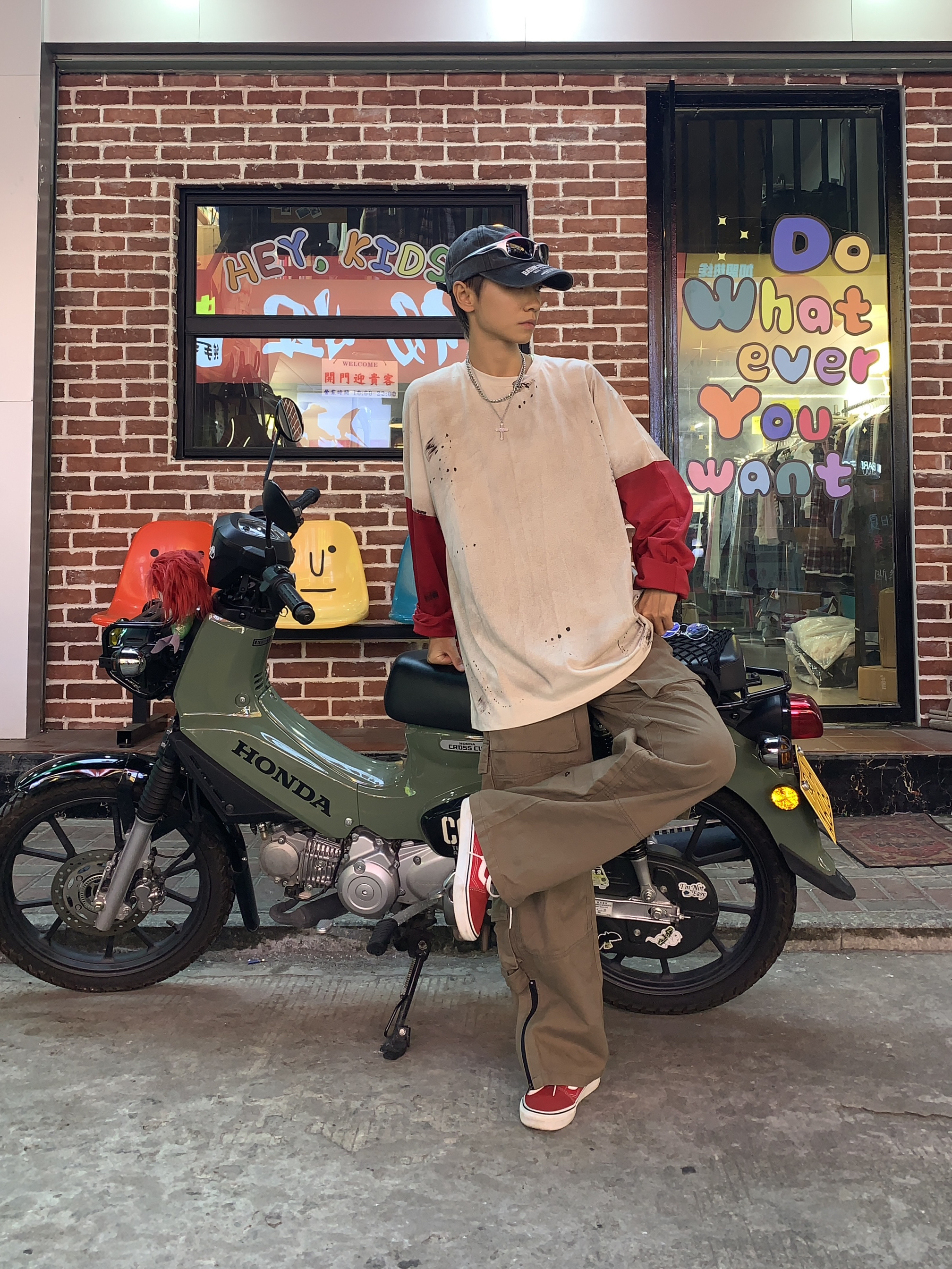 哈喽,欢迎来到哇哇哇穿搭分享频道! 168CM|45KG|👔:M 👖:m|👟:39码 穿上做旧红白拼接的长袖卫衣咯 衣服泼墨做旧细节 街头感满满 重工工装裤 秋日最爱 红色vans 经典不说 上下色调衔接 戴上帽子🧢摩托佬今日就穿这个!