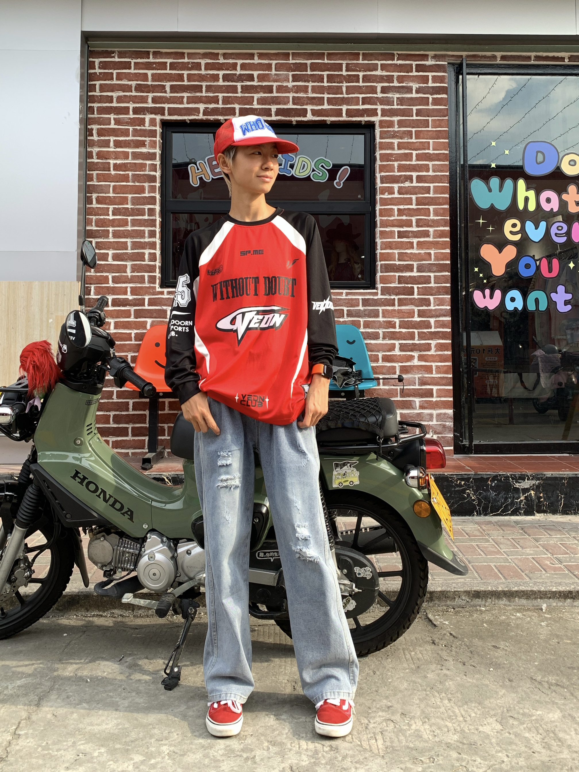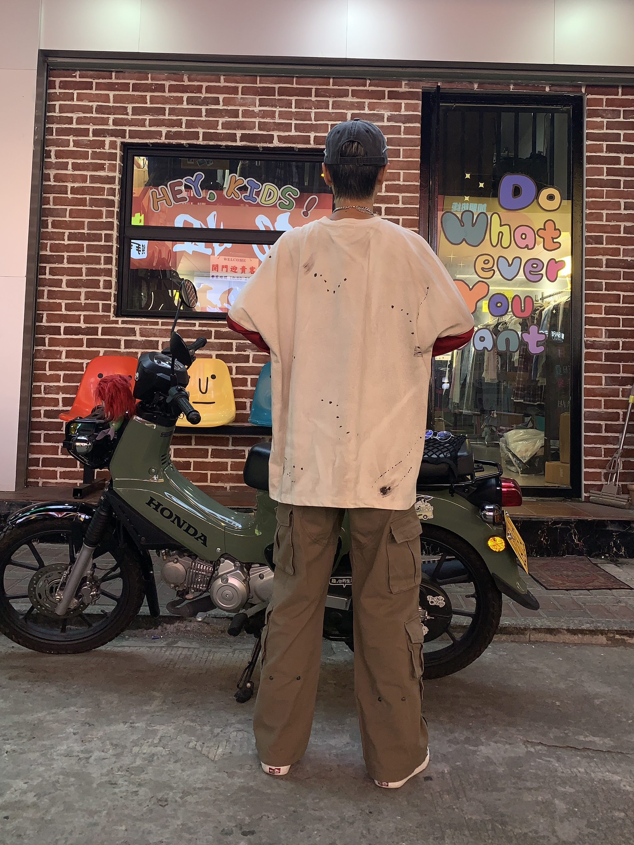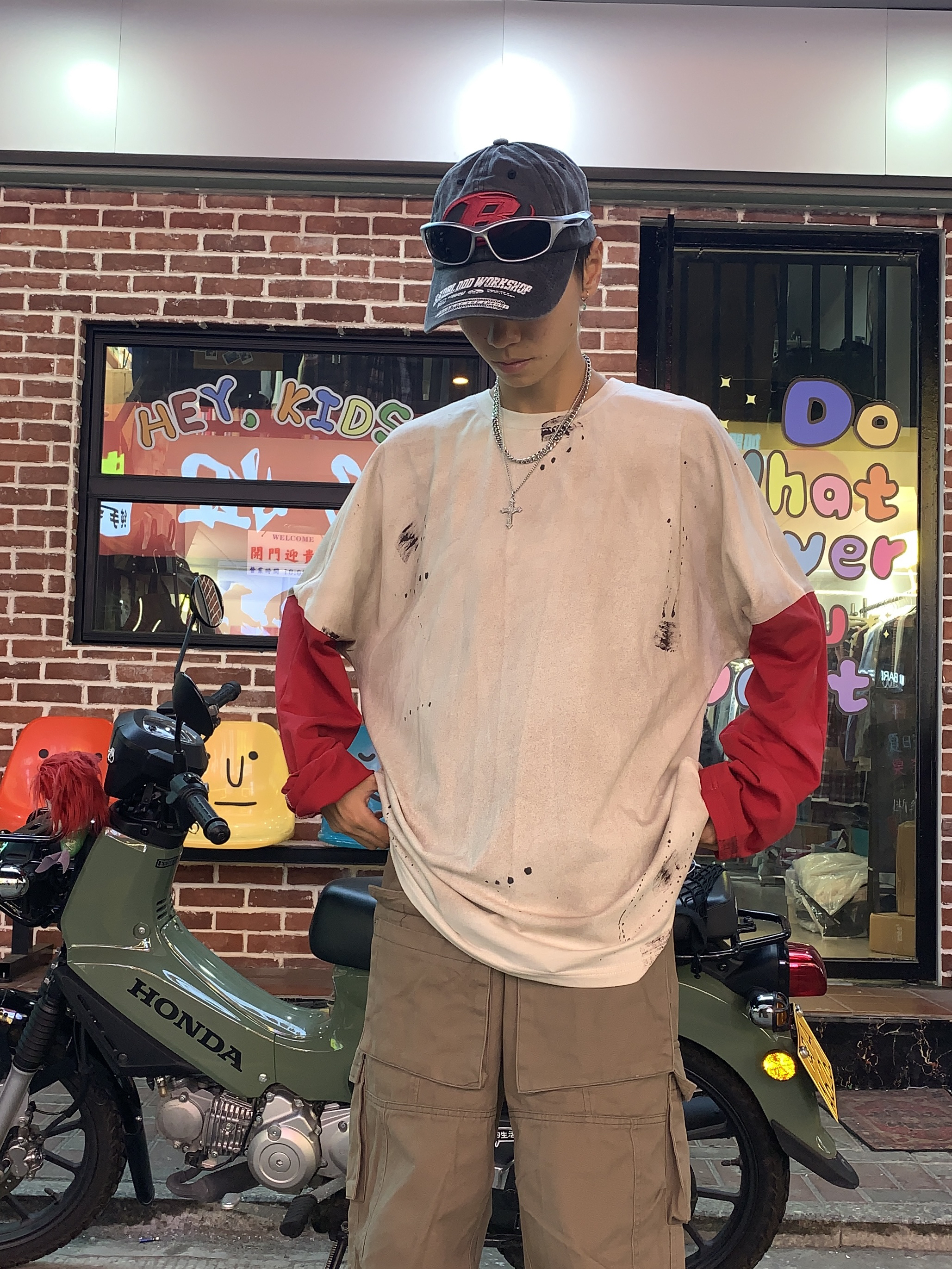 哈喽,欢迎来到哇哇哇穿搭分享频道! 168CM|45KG|👔:M 👖:m|👟:39码 穿上做旧红白拼接的长袖卫衣咯 衣服泼墨做旧细节 街头感满满 重工工装裤 秋日最爱 红色vans 经典不说 上下色调衔接 戴上帽子🧢摩托佬今日就穿这个!