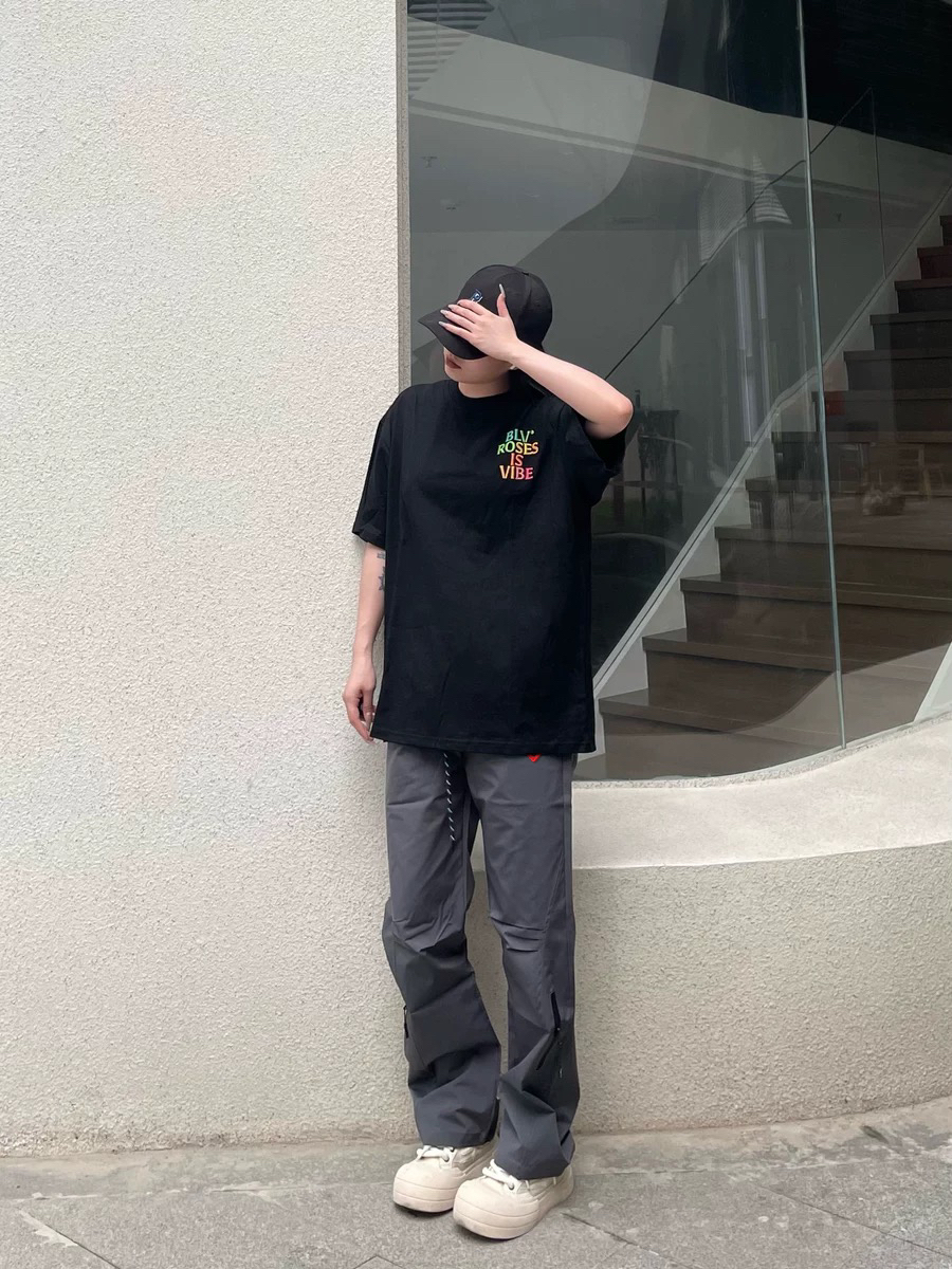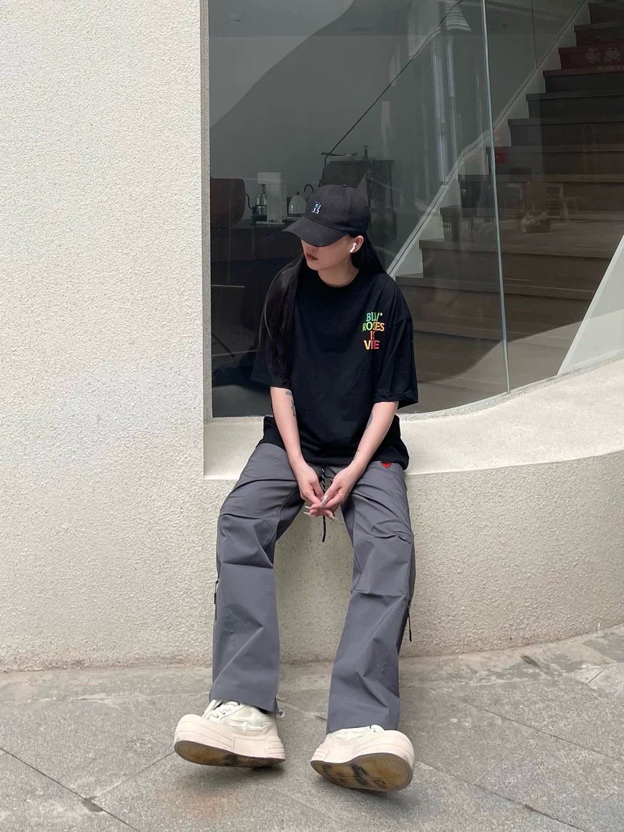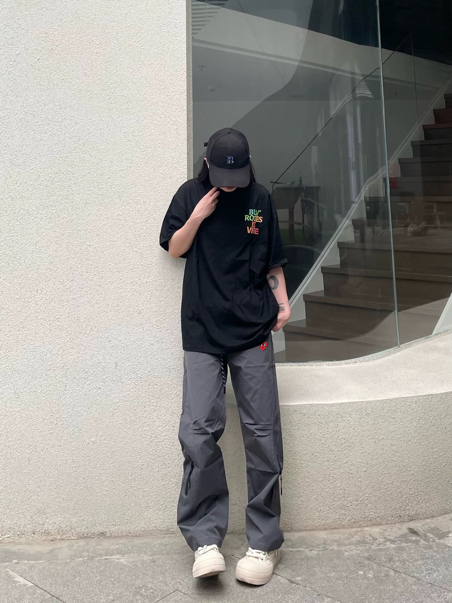 今天穿了一件黑色短袖,搭配一条灰色的工装裤,裤子的版型还挺好看的,能遮肉修饰腿型,而且也很百搭!