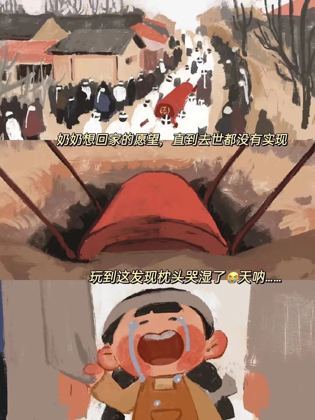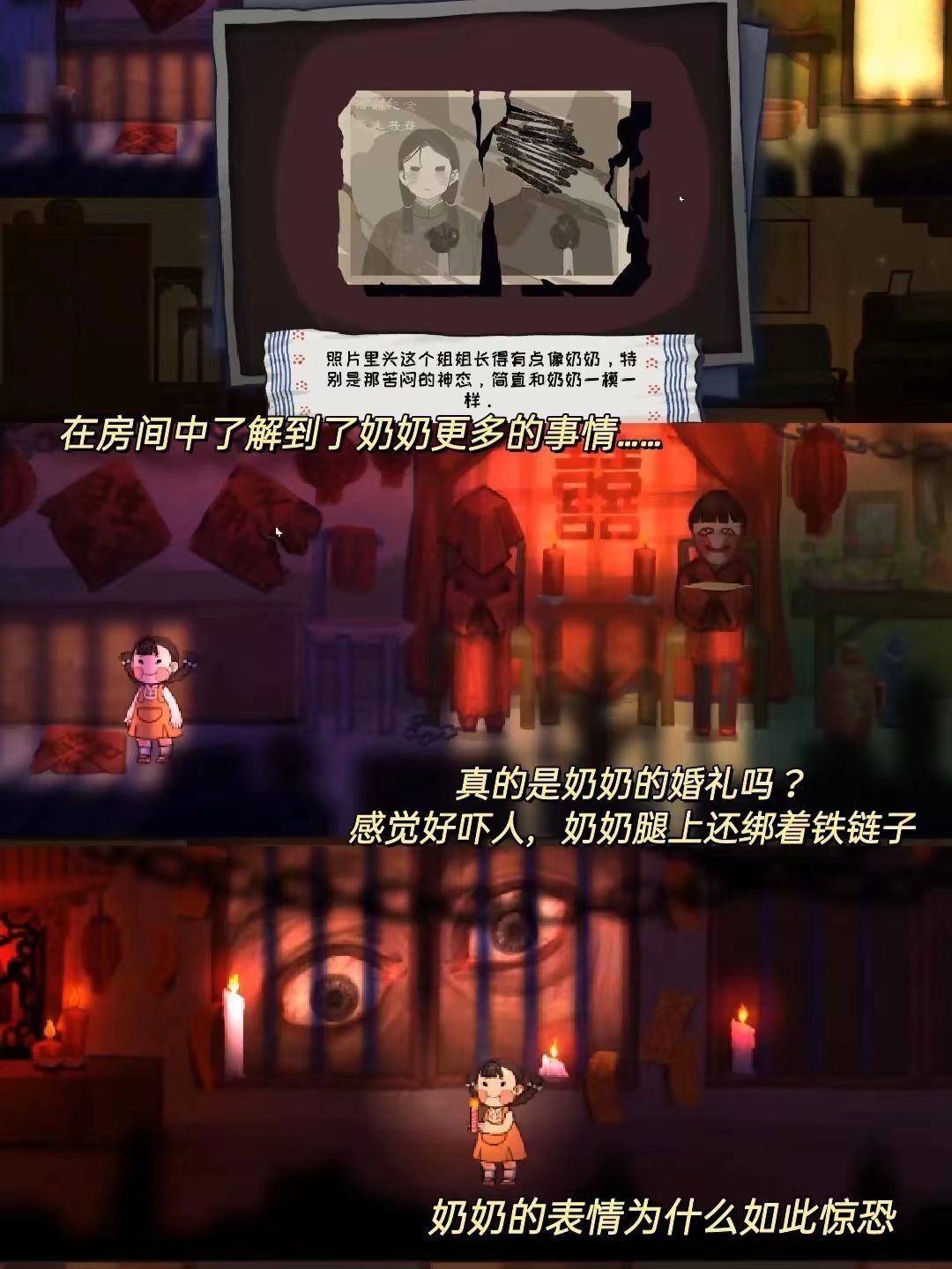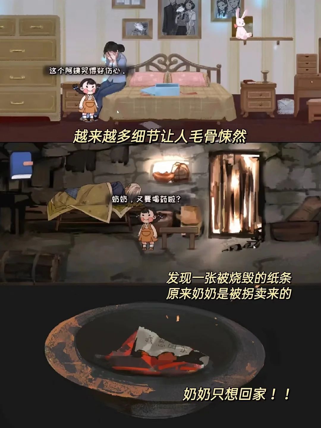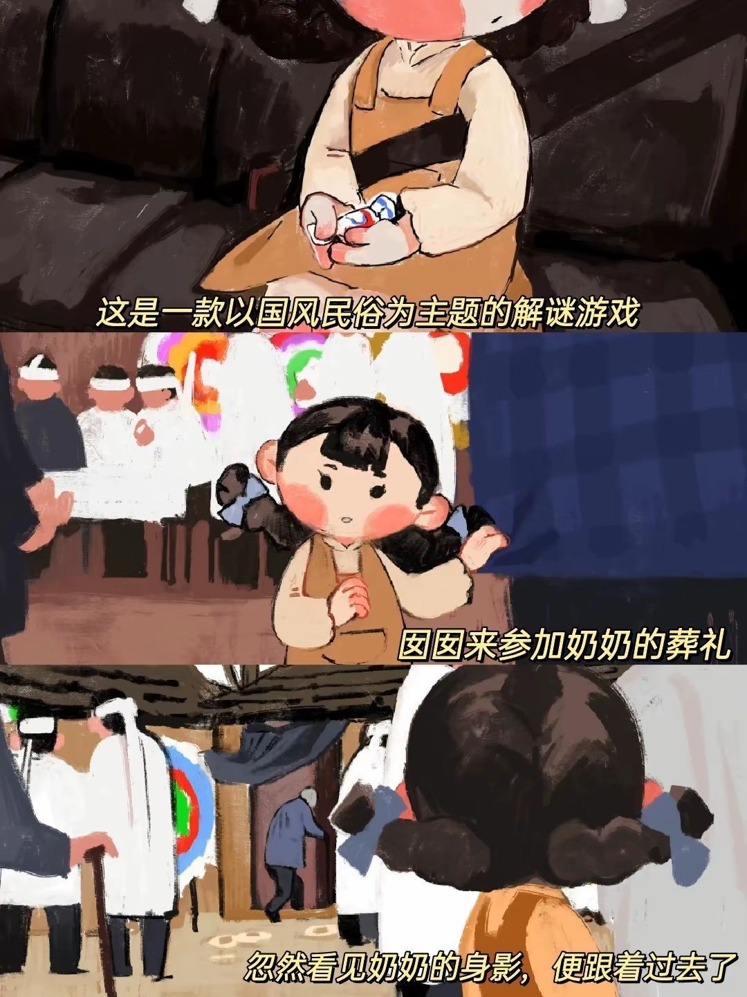 🎮 游戏名 喜丧 📱设备 安卓 Steam 💡游戏体验 《喜丧》是个剧情解密小游戏,玩家是一个小女孩来参加奶奶的葬礼,来到奶奶的房间后通过各种线索和互动来了解奶奶的身世背景和故事……. 真的好揪心,在被窝里忍不住哭,奶奶是被人贩子卖到这里来的,最大的愿望就是回家,但直到去世都没有实现。玩起来有点头皮发麻,心情久久无法平复🥺🥺