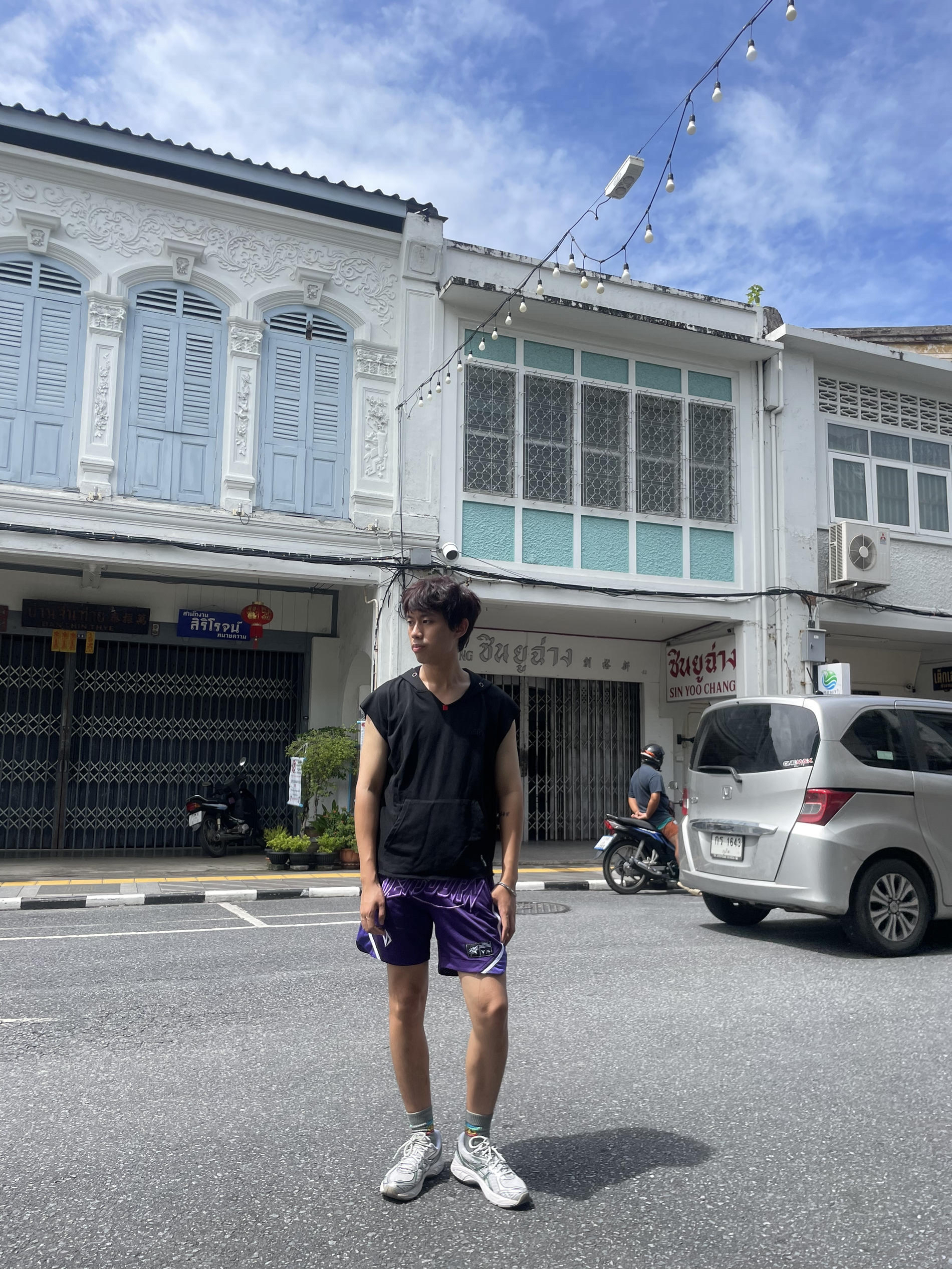 我漫步在普吉古镇的街头,仿佛置身于《以爱》泰剧中的场景,分享下BKPP同款打卡地。我漫步到德的家,这里充满了古老的气息和神秘的魅力。 我上身搭配宽肩的背心,下身是紫色刺绣运动短裤,很有青春活力,鞋子选的是银色运动鞋。 我站在回元堂、中文学校前,感受着这里的历史与文化的交融,仿佛自己也成为了这部泰剧中的角色。这一刻,我仿佛与主角们同呼吸、共命运,感受着他们之间的情感纠葛与青春热血。 这样的穿搭,让我...