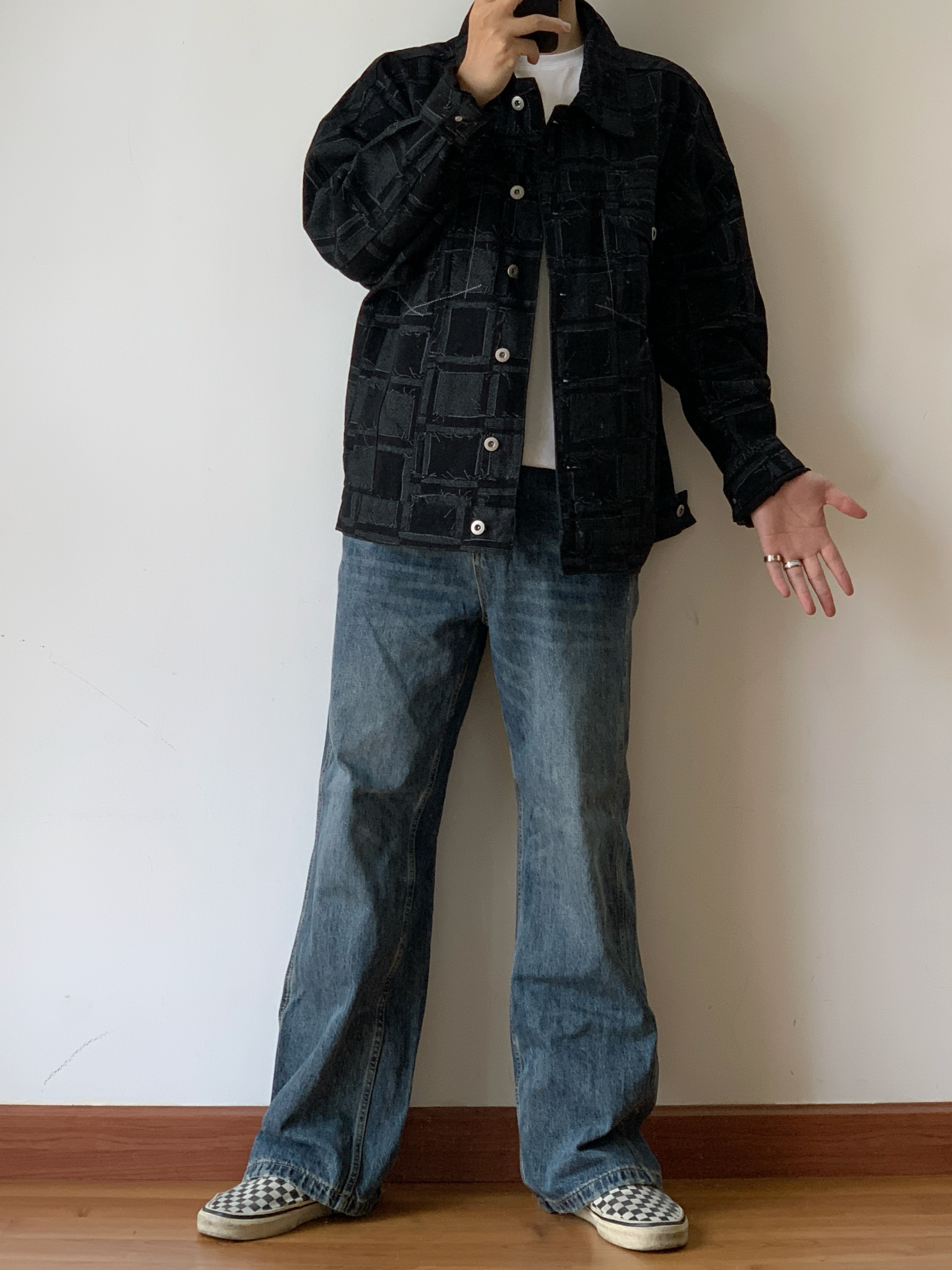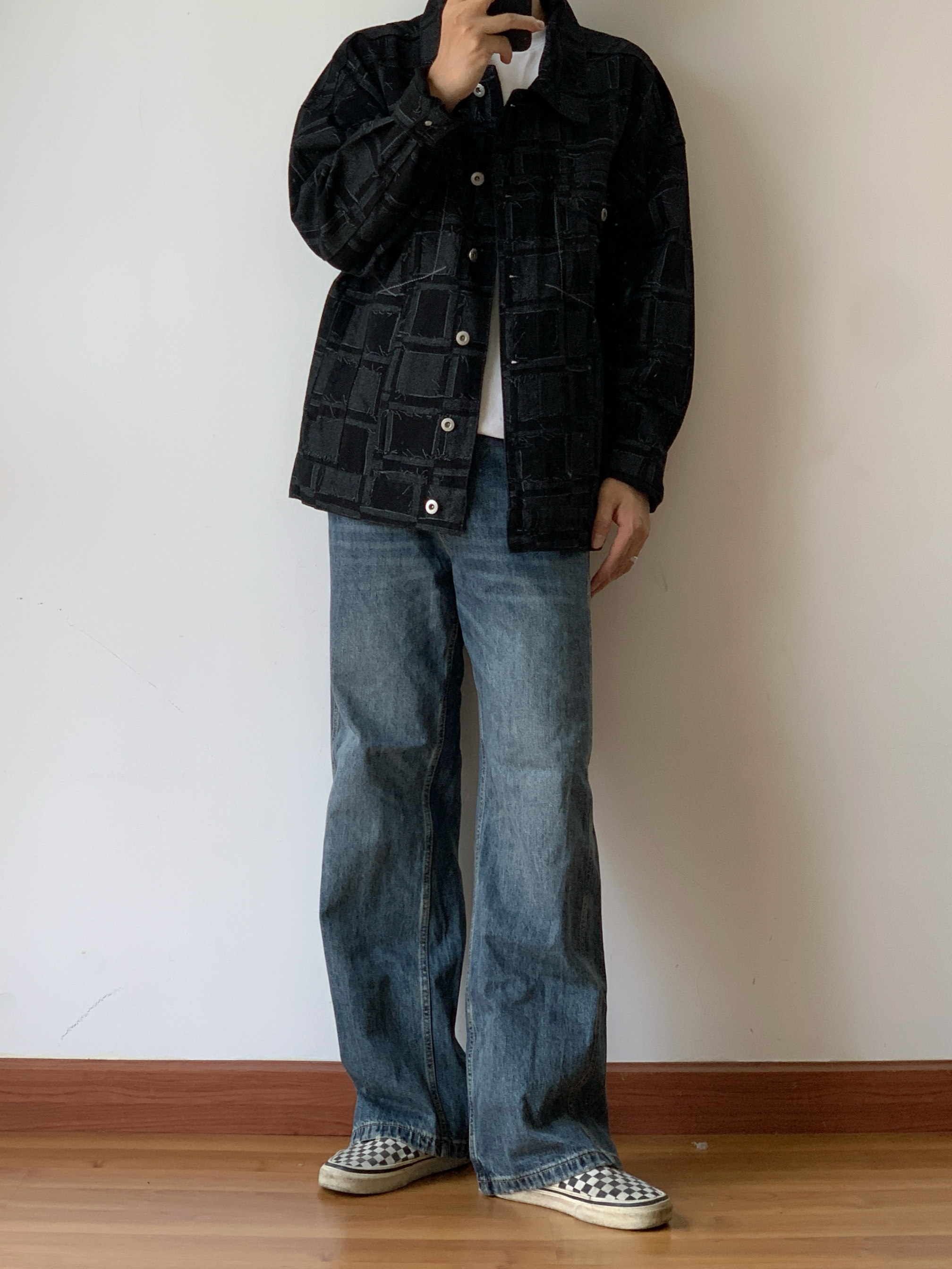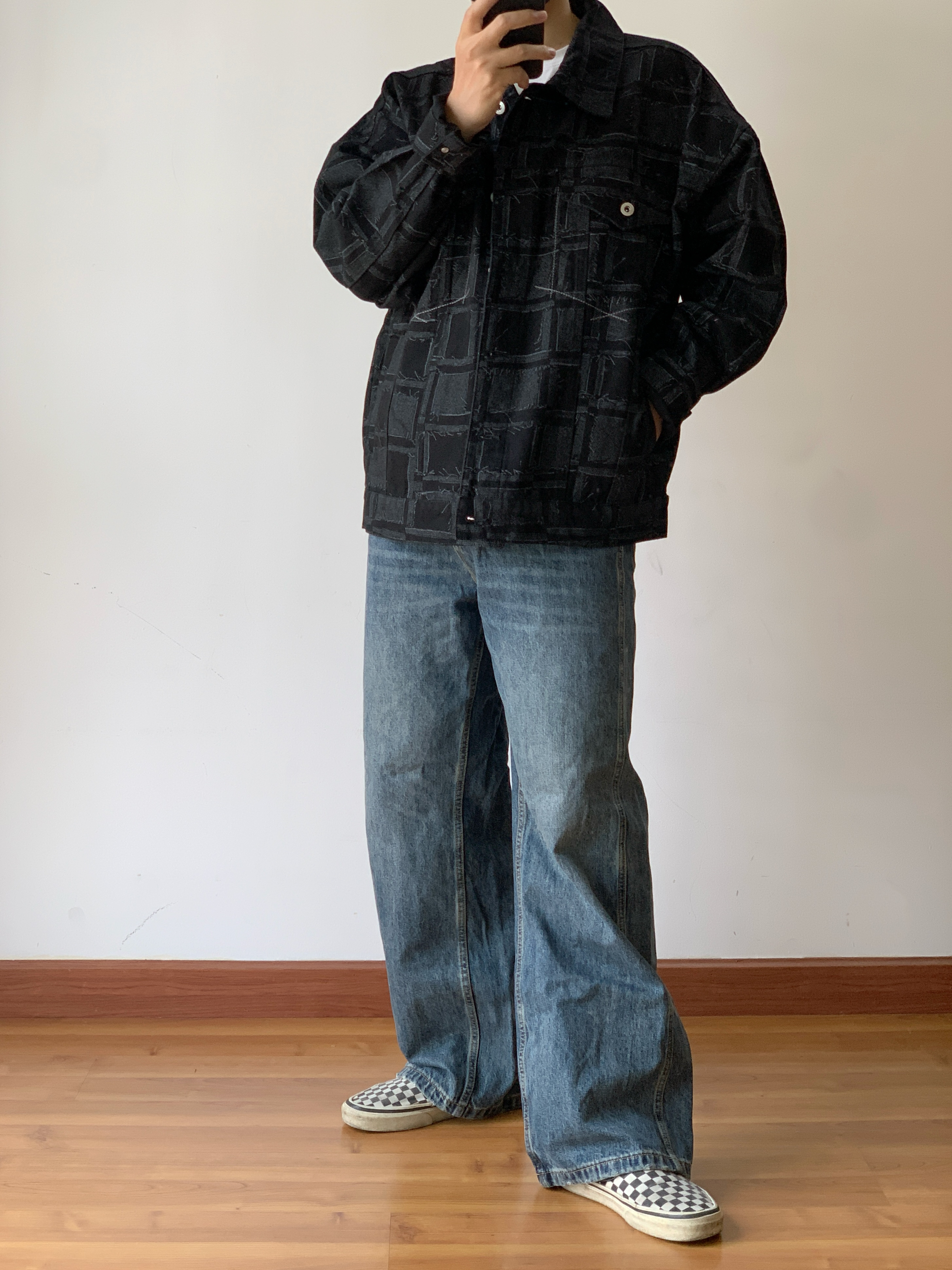 👋家人们,今天来给大家分享一下我的今日穿搭😎。 上衣我穿了一件超酷的黑色棋盘格外套🧥, 里面叠穿了一件白色 T 恤👕, 简单又有层次感。 这个黑色棋盘格真的是经典又百搭, 穿上它瞬间感觉自己时尚感爆棚💥。 再说说我的裤子, 是一条复古 baggy 风阔腿牛仔裤👖。 这种宽松的版型简直太舒服了, 而且还很有个性。 走在路上, 感觉自己就是最靓的仔😏。 最后是我的鞋子, VANS 安纳海姆棋盘格👟...