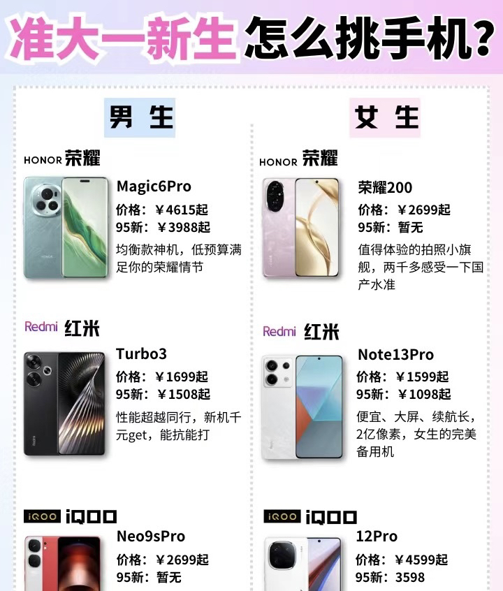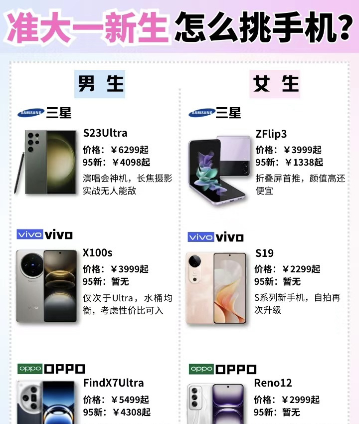 高考党友友们,开始享受自己的假期了吗?高考后数码产品,尤其是手机这不得马上备上😎 · 今天教准大一新生们如何挑手机,男女生各一份!!更多详细内容都在图里💥 · 苹果 男生选14ProMax、15Pro、13Pro 女生选15ProMax、15、xSMax 小米 男生选14Ultra、14Pro、13Pro 女生选civi3、14、13(小屏旗舰) 华为 男生选Mate40Pro、Mate60Pro...