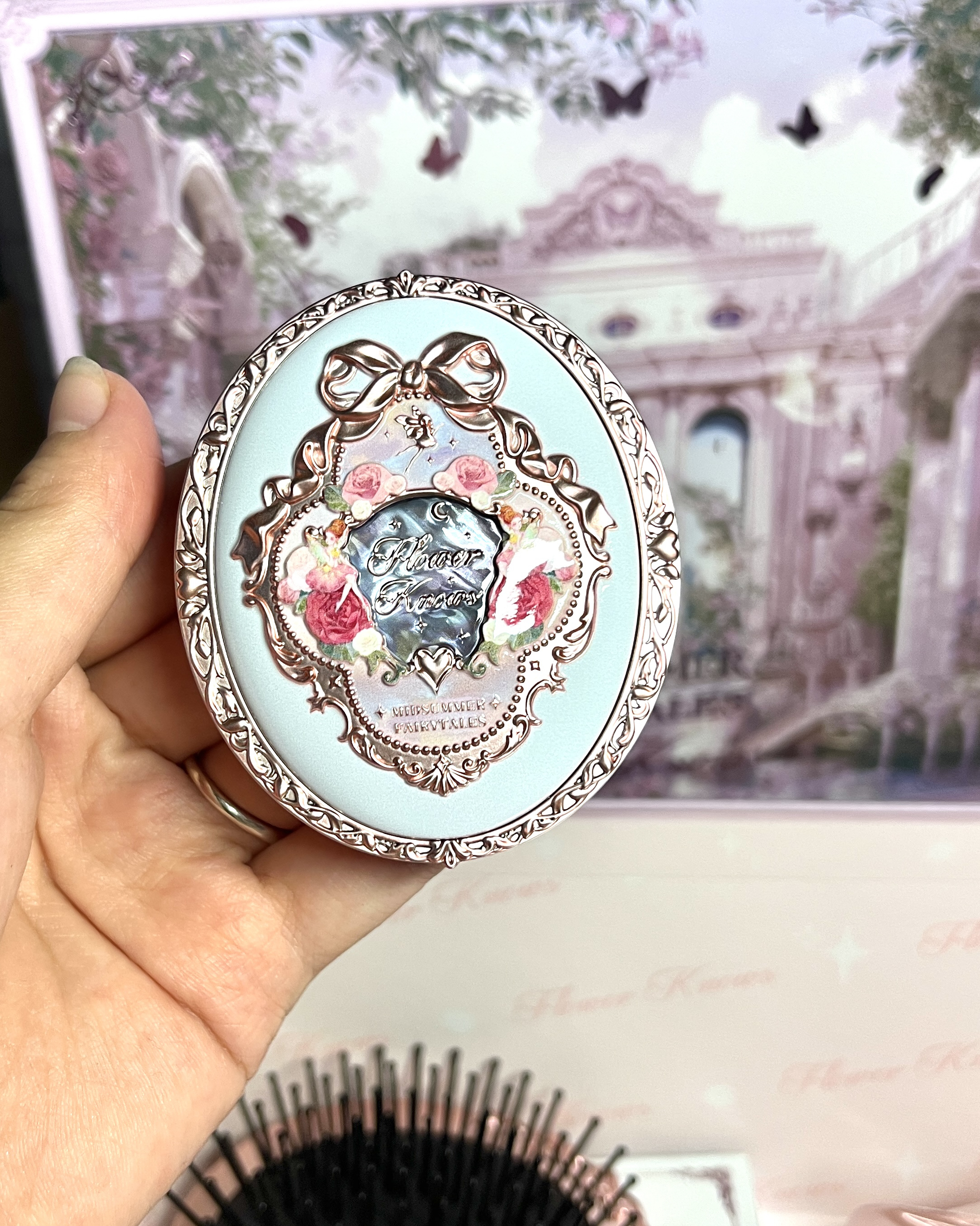 花知晓你别太会了 呜呜呜好朋友太懂我了吧 这是公主用的化妆品吧 不光是颜值在线! 实力更是没话说!爱爱爱! 最爱遮瑕提亮液,粉色的融合得很自然 上脸粉粉嫩嫩,提亮自然,还有遮瑕效果!💗 唇釉上嘴很水润,秒变嘟嘟唇👄 眼影盘入的是烟粉色,适合新手! 就连赠品气垫梳和手持镜和发夹都是超精致的!