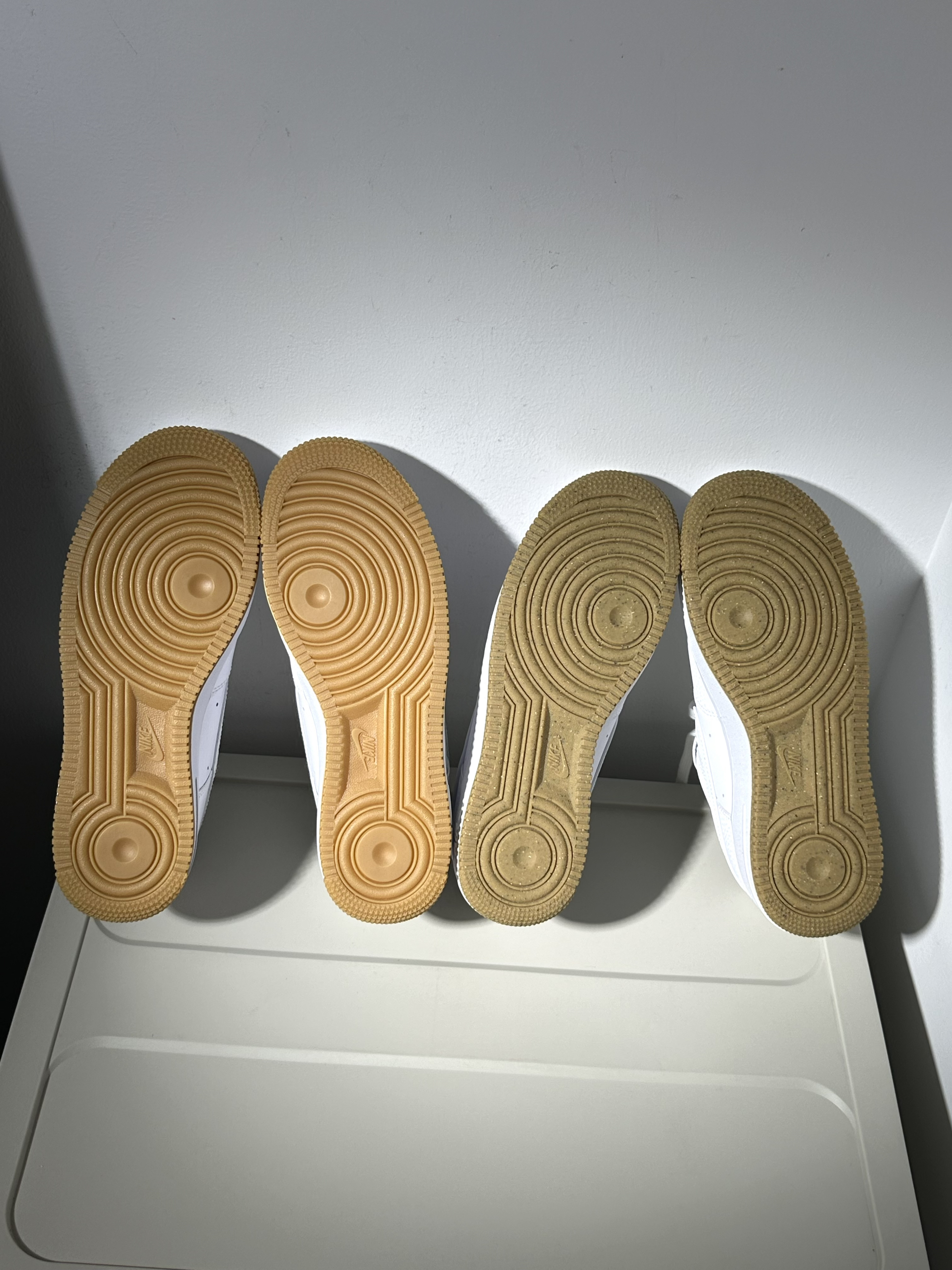 纯白款 🆚 波点款‼️ 1️⃣尺码区别:纯白款生胶af1是男款,最小尺码38.5,波点款是女款,最大是44.5~ 2️⃣外形&材质区别:两双鞋鞋面皮革用料纹理质感都不同,纯白款是牛皮革材质,不过做的偏硬,质感不错,全部是光面皮革。波点款是牛剖层革,鞋面更软,也做了很多波点让鞋面更有特色💫 3️⃣价格区别:纯白生胶💰500+可以拿下,波点款大部分尺码💰400~500可以拿下✅