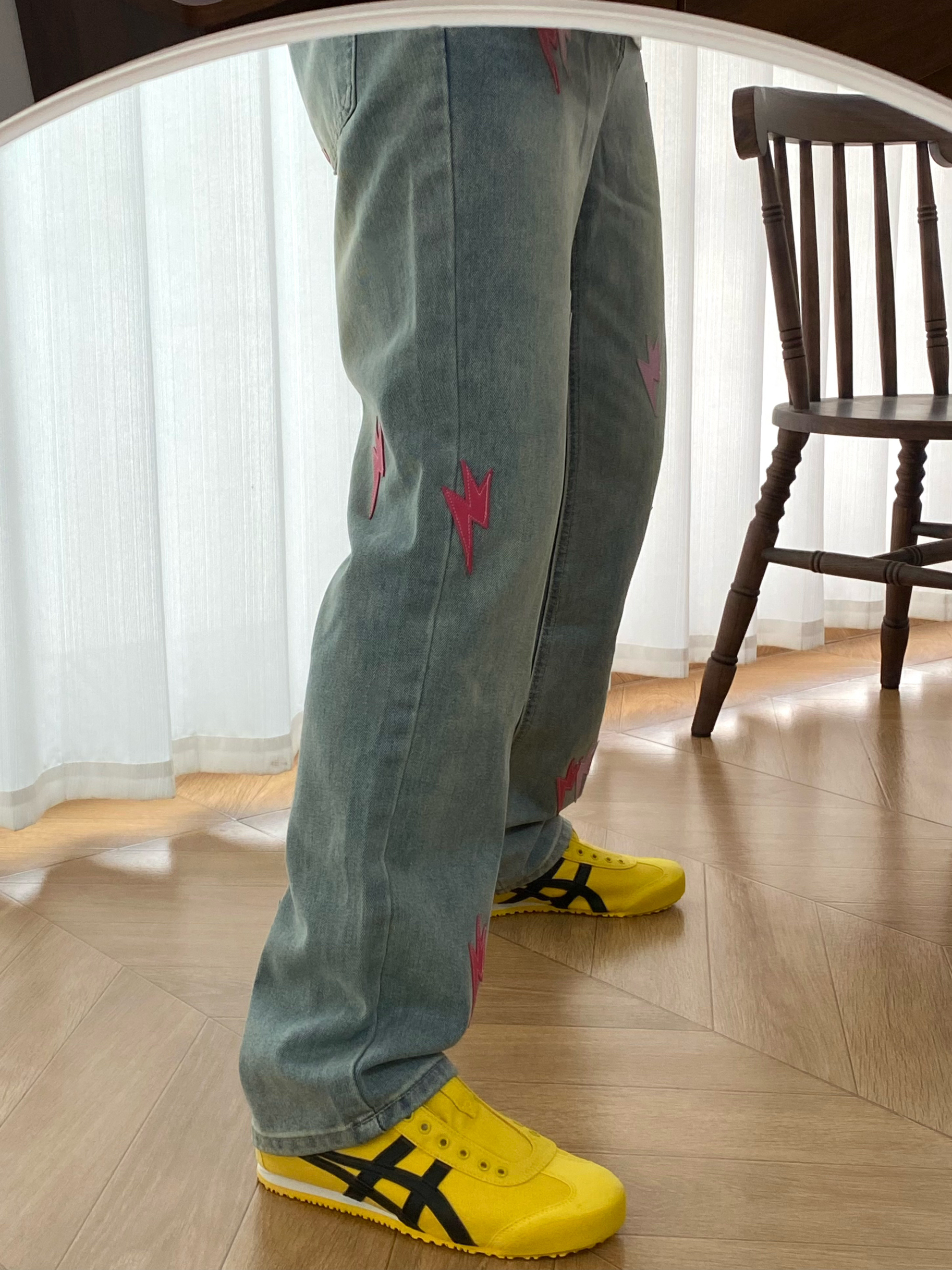 它的蓝色与闪电风暴的图案结合,创造出了一种独特的视觉冲击。复古水洗、破坏破洞和做旧的工艺使其具有了浓厚的艺术氛围和时尚感!