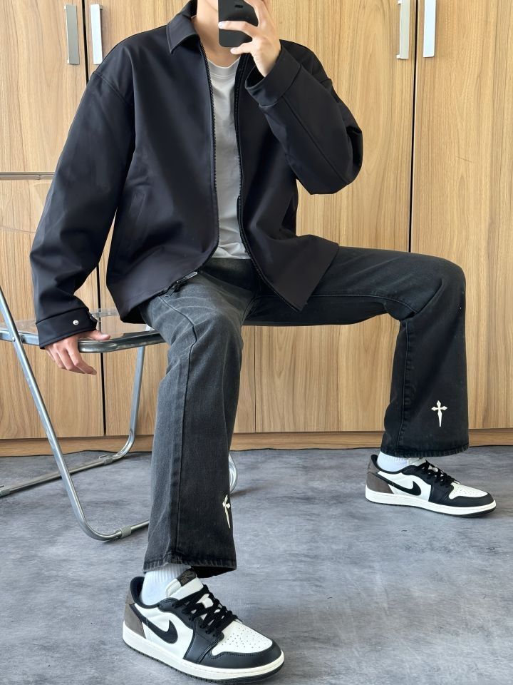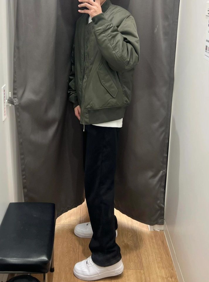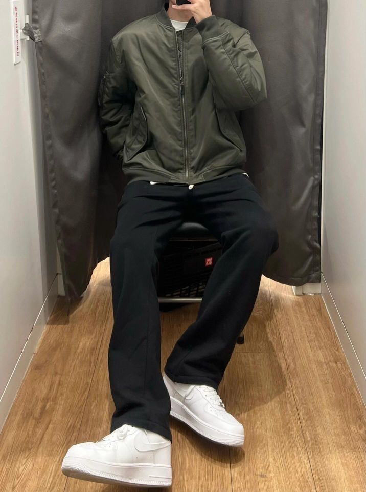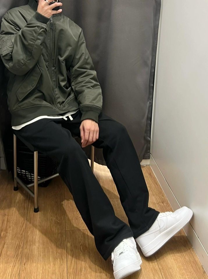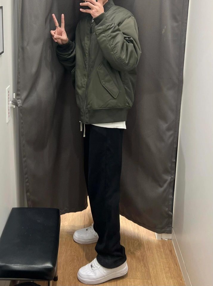 🎈飞行员夹克 算是比较百搭的一个单品了 防风拉链的设计 内里夹棉 保暖没问题 上身也不会臃肿 男女都能穿 短版的设计 显腿长 内搭t恤或者连帽卫衣都可以 🎈下身选择一条黑色带有垂坠感的休闲长裤 宽松直筒的版型 修饰腿型好驾驭 松紧的腰带 面料比较厚实 冬天穿也不会冷 🎈178cm/65kg 飞行员夹克xl 裤子l (图源网络侵删)