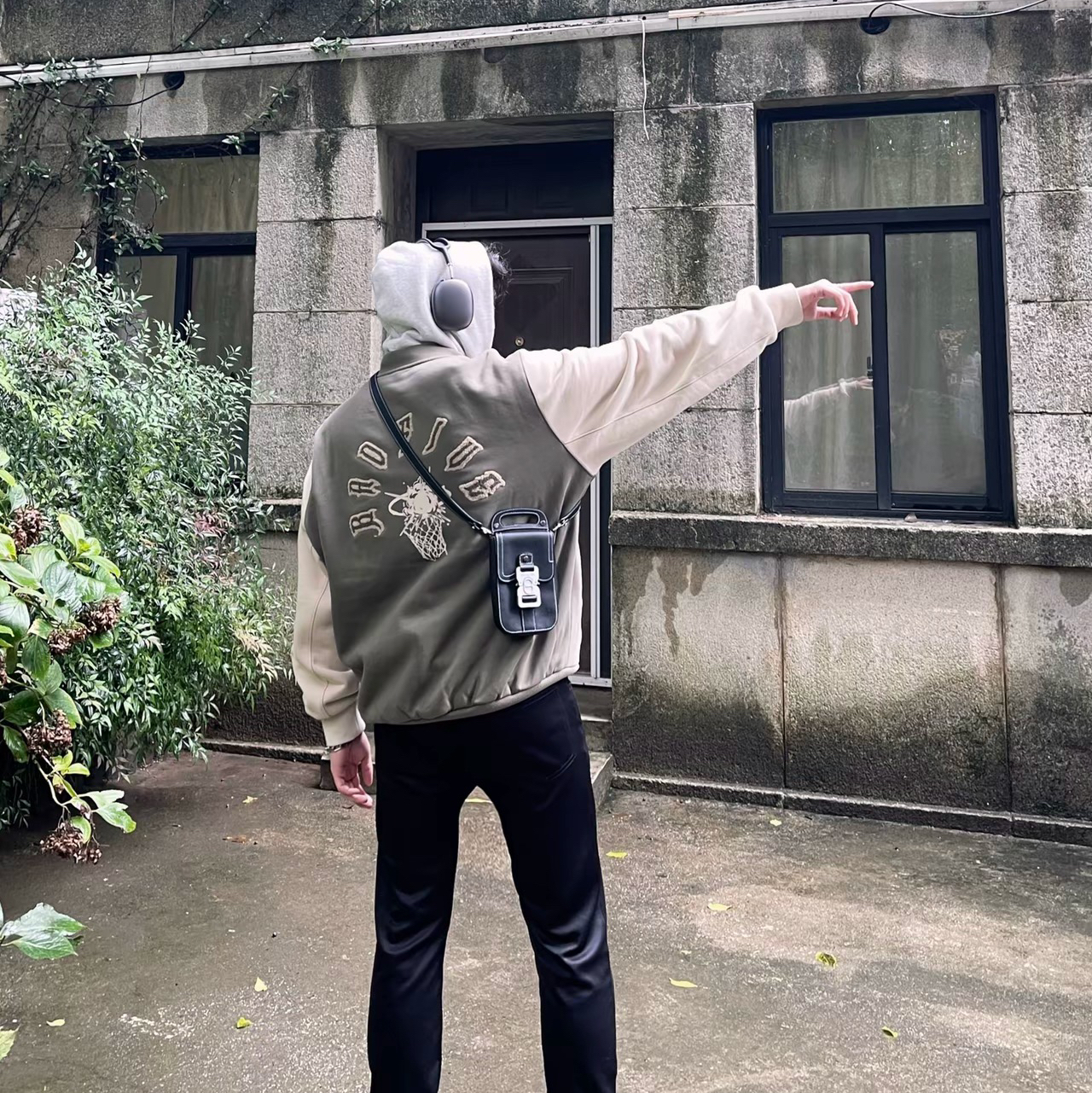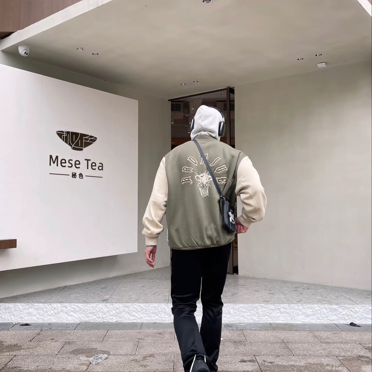➖棒球服十连帽卫衣+偏修身长裤 vibe穿搭公式安排得明明白白了 棒球服主体橄榄绿拼接米白袖子▪️低饱和配色显高级 背面设计有反伍系列刺绣标语和篮球入框图案加绒保暖又舒适 很适合秋冬季节🍂 图片来源于@JLokkc陈洛克