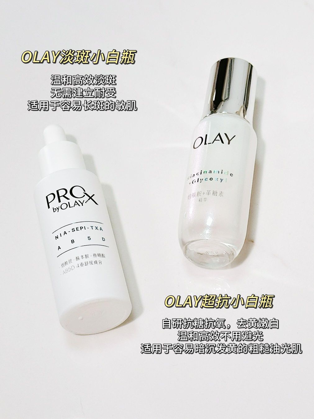 一生在追求美白的我,用了很多美白精华🍒 最后还是被OLAY家的美白双子星征服了 身边的黑黄皮都在用! 搭配起来就是去黄焕白、美白淡斑 不管是爱熬夜吃甜食的黄黑皮姐妹, 还是易晒黑脸上有半点的瑕疵皮真的快去用! ☑️OLAY超抗小白瓶-去黄焕白,细腻肌肤🎀 这瓶主打一个抗糖抗氧去黄美白,润而不油, 适用于任何肤质,油皮简直爱惨了! ☑️OLAY淡斑小白瓶-根源淡斑,温和清透💕 脸上有瑕疵容易敏敏的姐...
