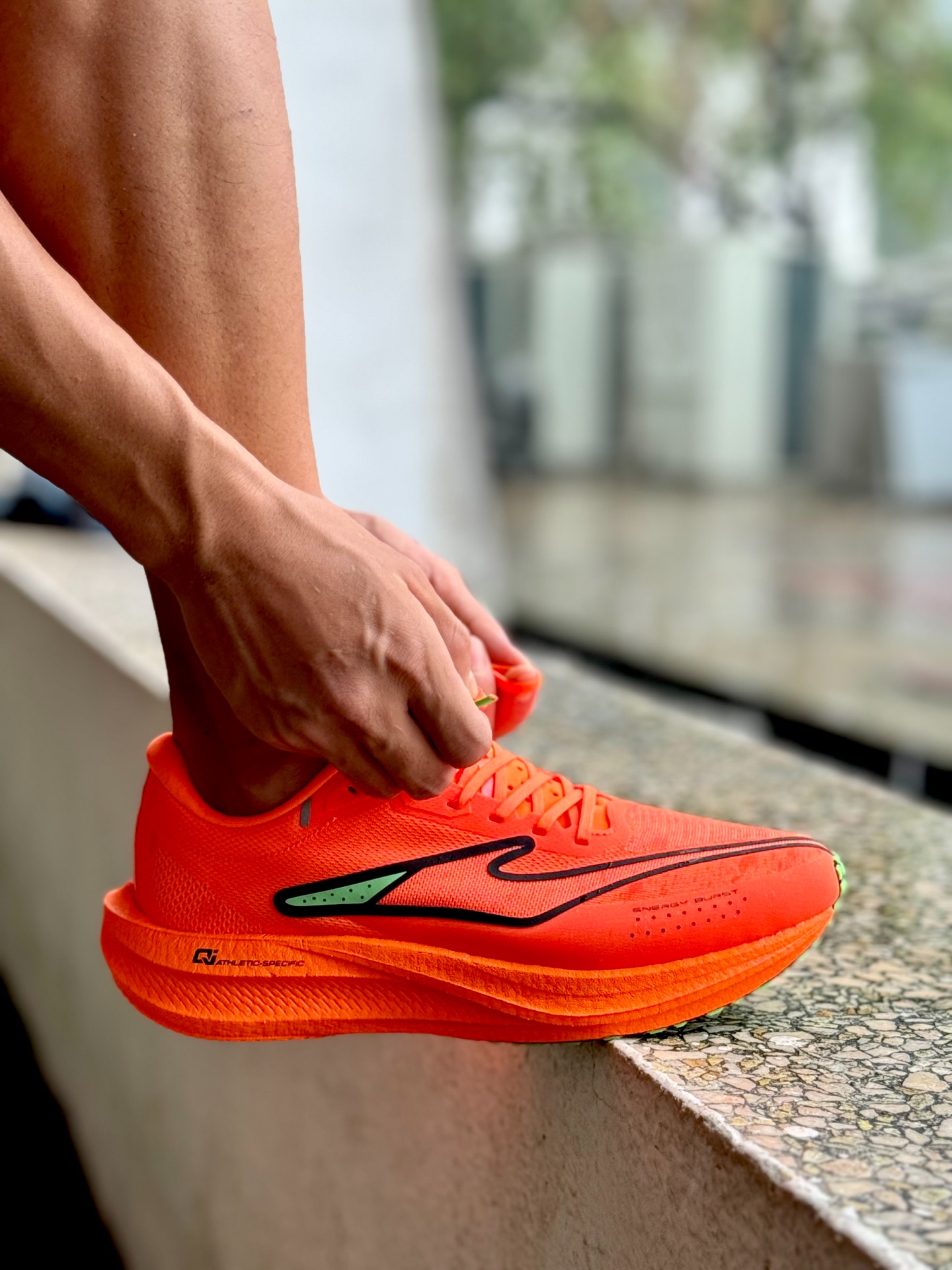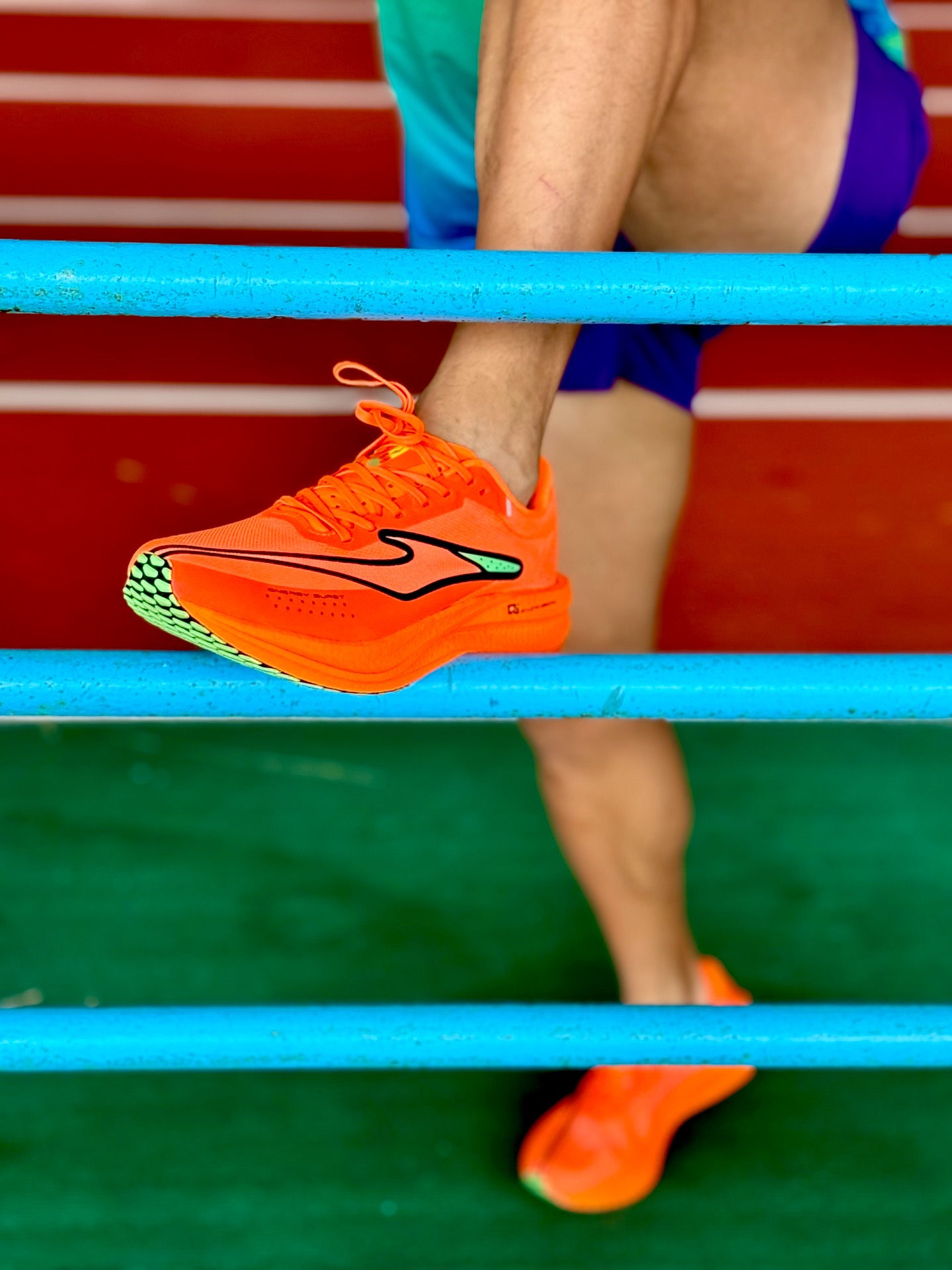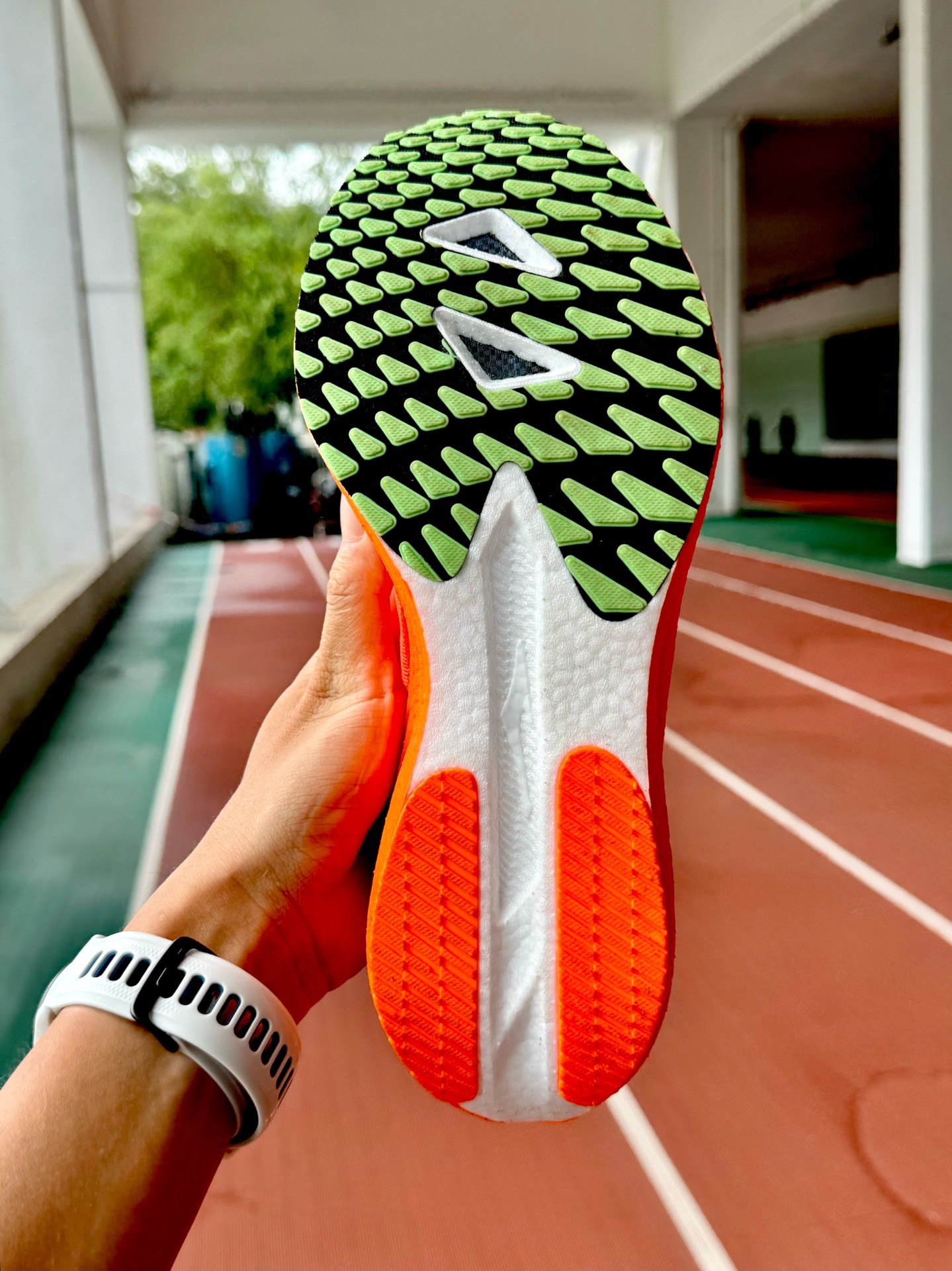 全掌铲形碳板的设计,是极风SP的一大亮点。它的刚度适中,在竞速和稳定保护上,取得了良好的平衡,快慢节奏下都能稳定推进。 缓震性效果也不错,中底泡棉柔软,碳板的推力适中,不会太激进也不会感觉动力不足。 CPU橡胶大底和箭头状纹路的组合提供了出色的抓地力,防滑耐磨。跑田径场还是柏油路,水泥路都可以驾驭。 要提醒一下,这款鞋子尺码会有点偏大,建议初次购买时选择小一码的尺码,会有更高的贴合度喔。#鸿...