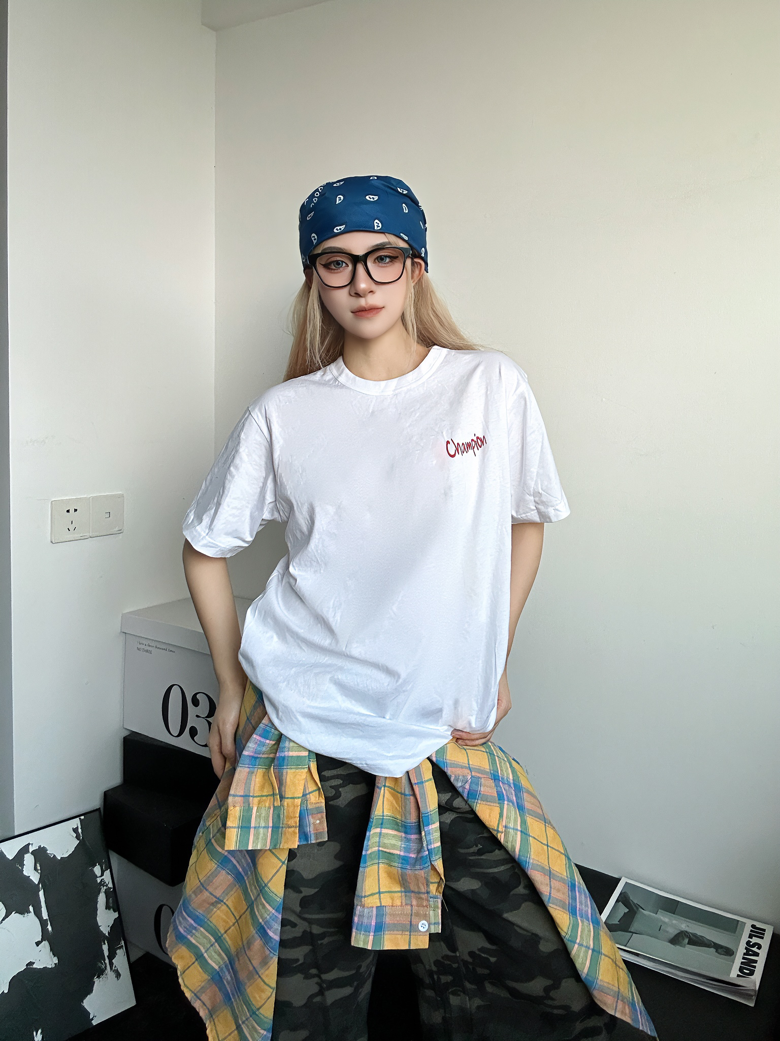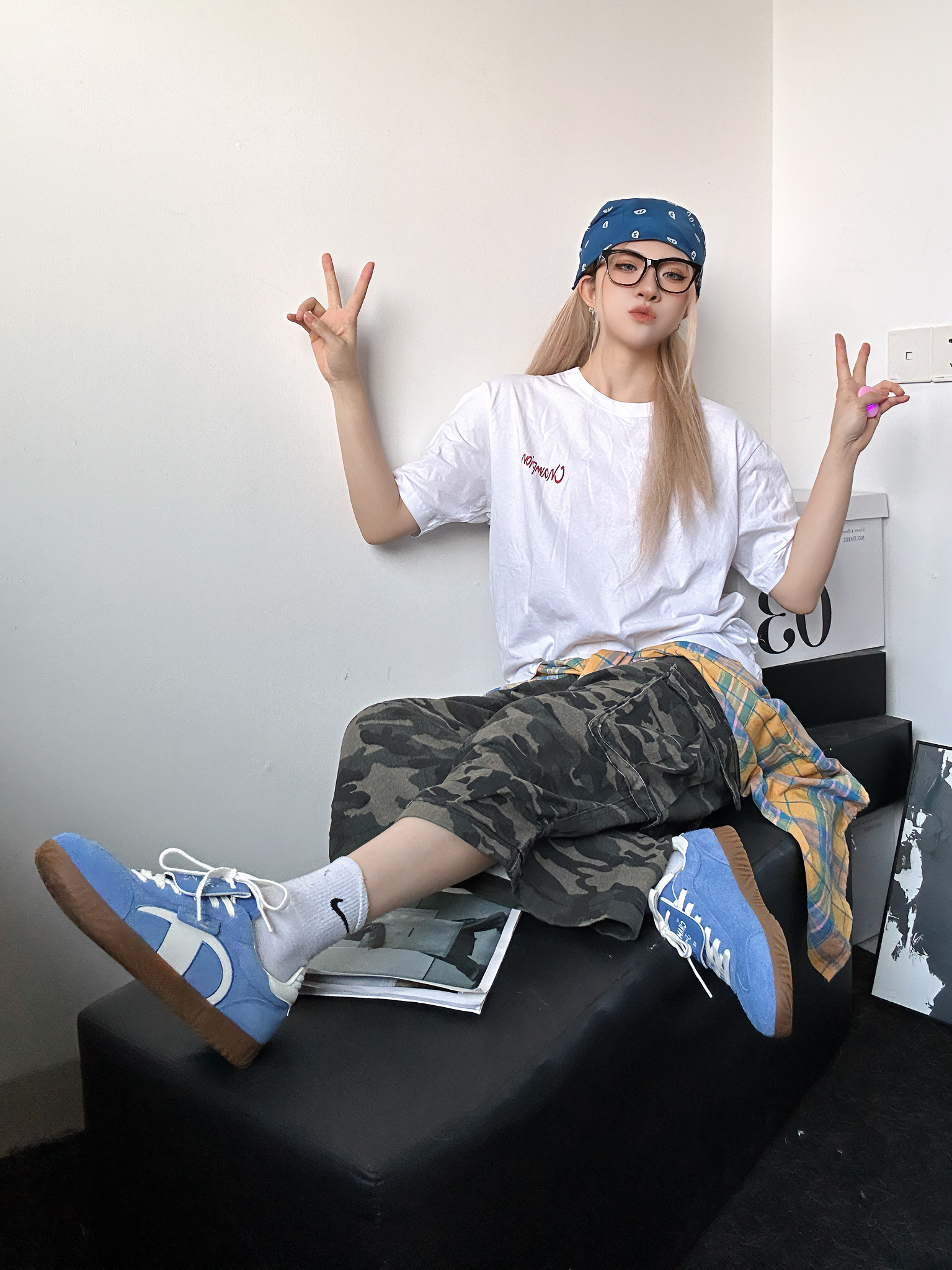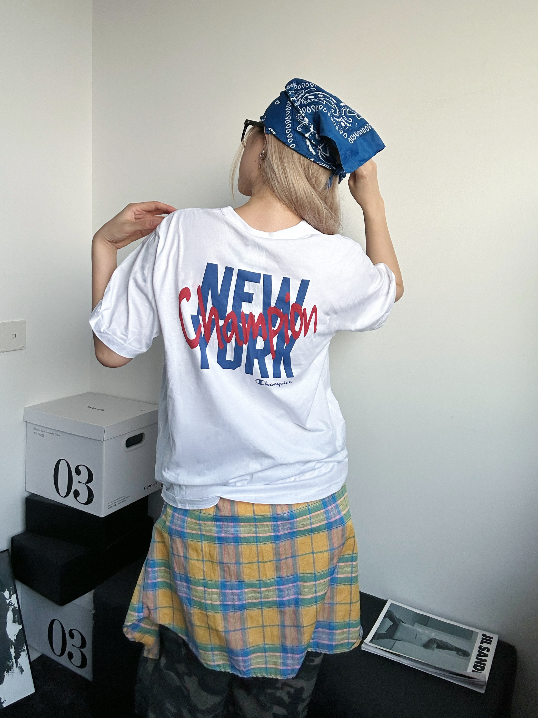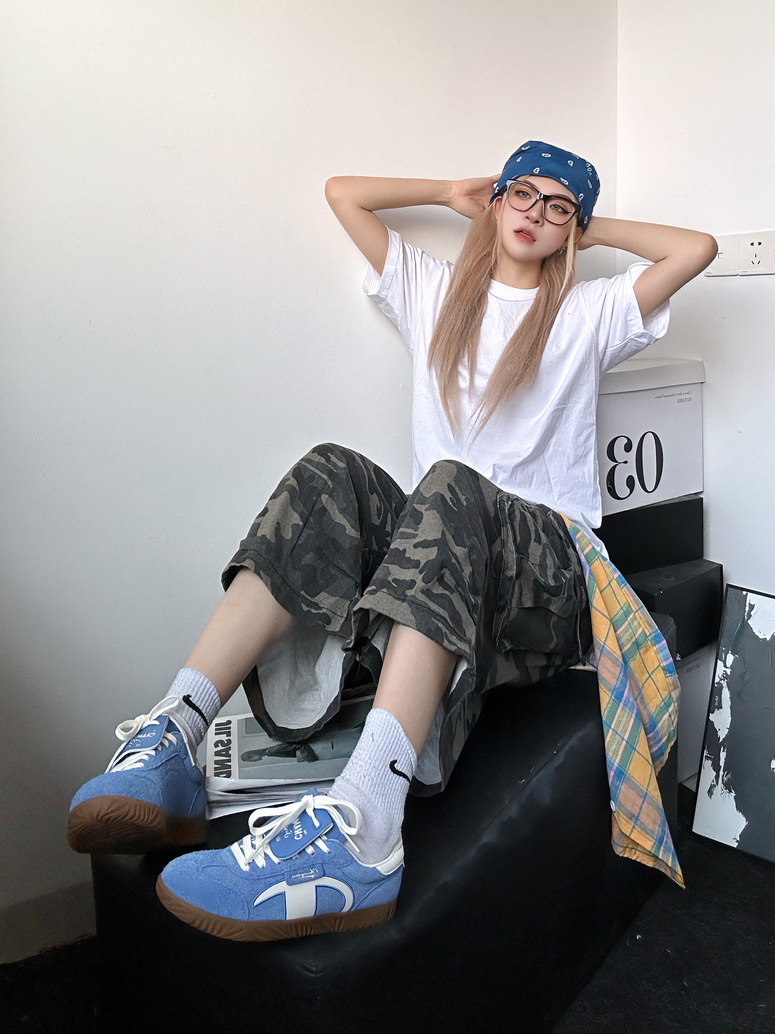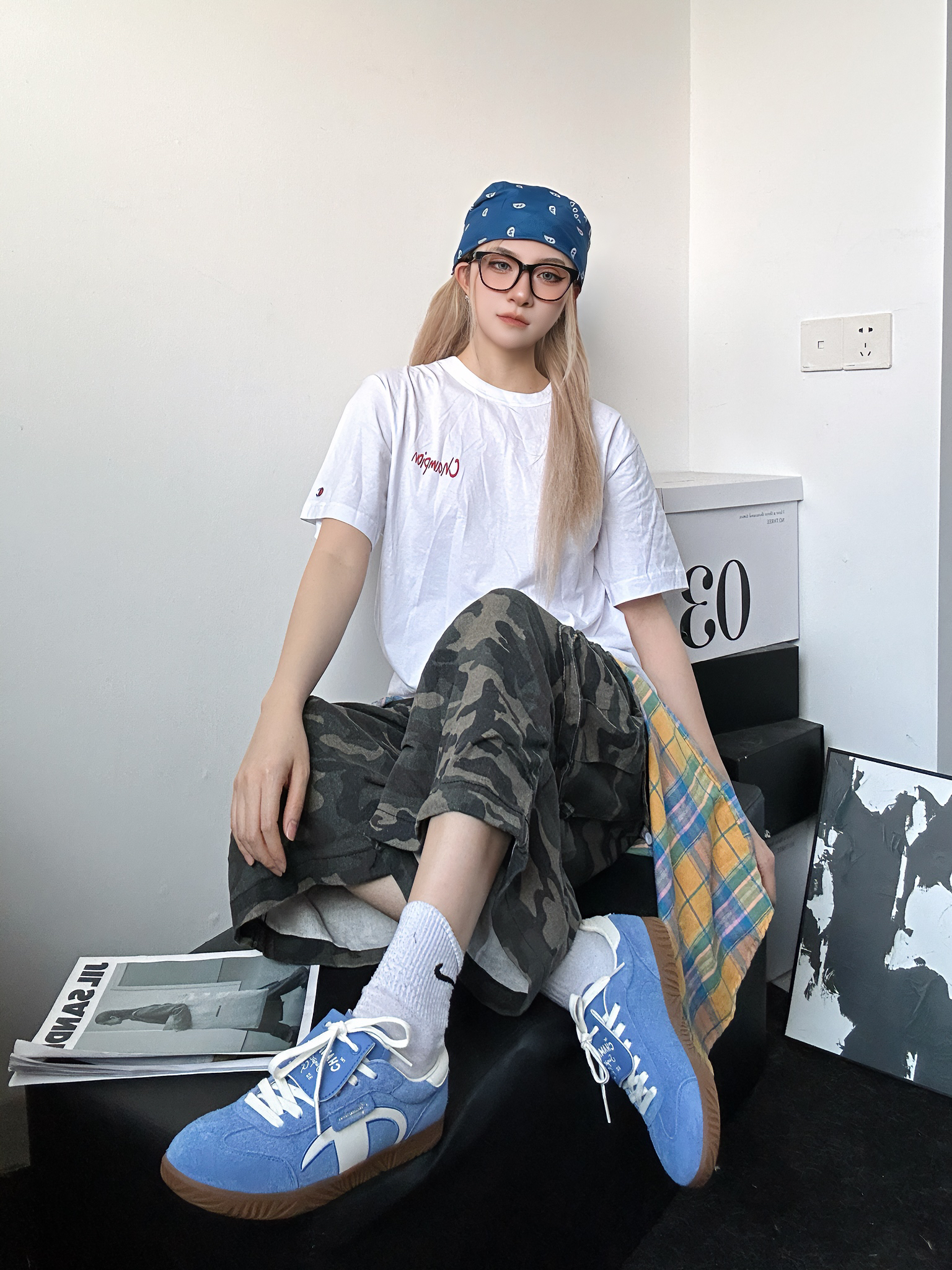 今日穿搭分享 上身白色短袖来自冠军champion 超舒服柔软的面料 背后大面积印花涂鸦十分休闲 胸口简约小标设计也不会太复杂 搭配迷彩阔腿七分裤 鞋子选择的同样是来自冠军的德训鞋 德训有多火不用多说了吧 蓝色又是超级百搭的颜色 还在犹豫什么!