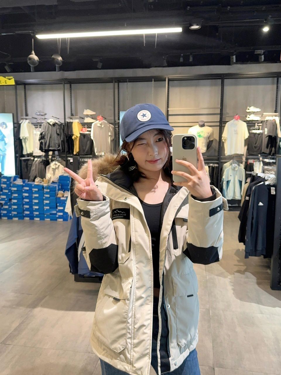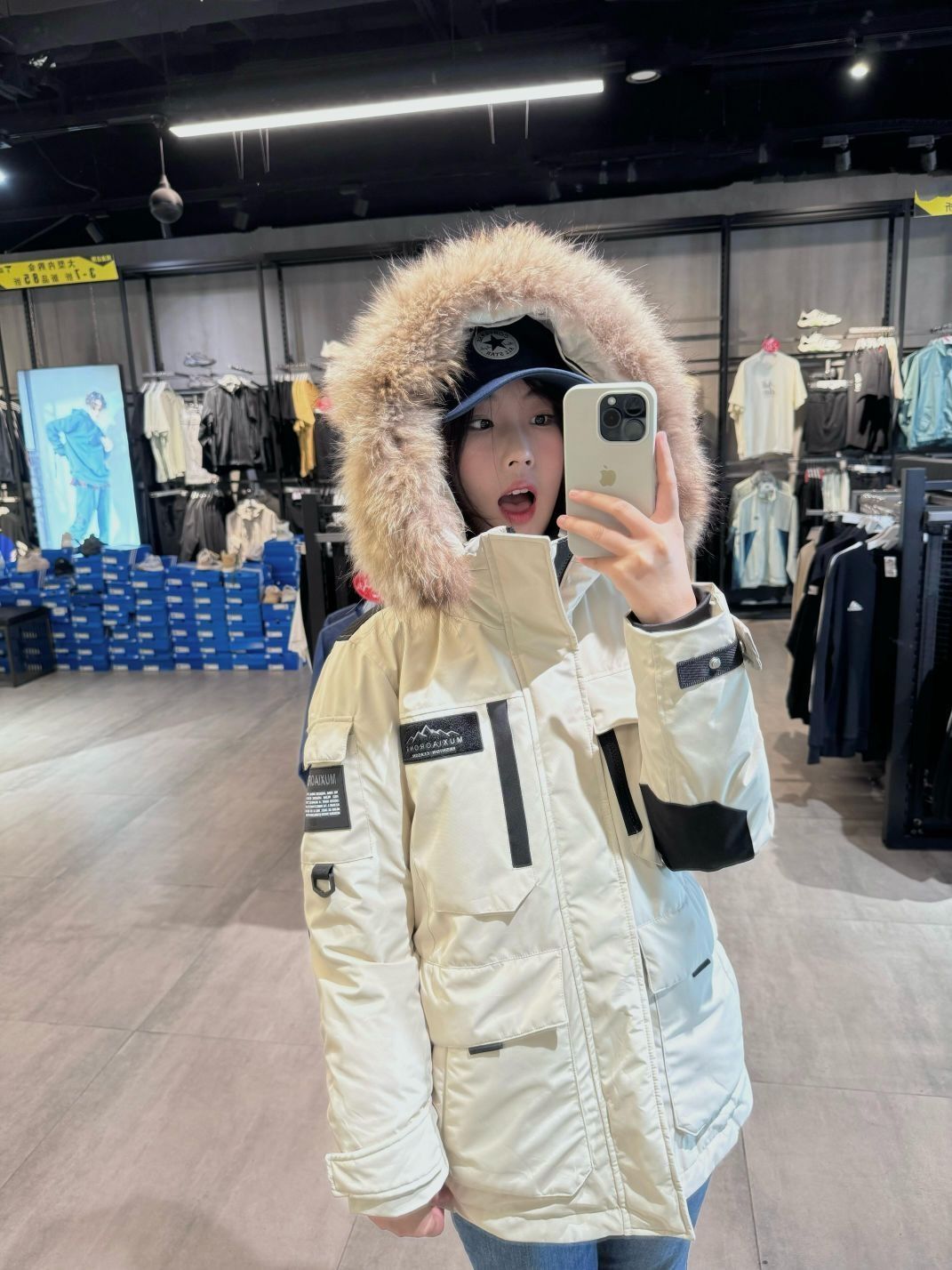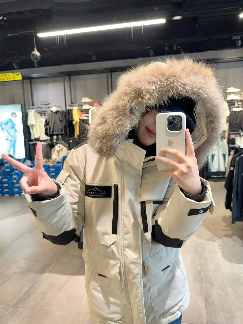 我来啦看我这件羽绒服怎么样哈哈哈哈 真的敲暖和!💨✨ 质量比较厚实 感觉东北的bb穿也没有问题耶👀✌🏻 颜色是奶白色滴 好喜欢哈哈哈哈!👋🏻✨