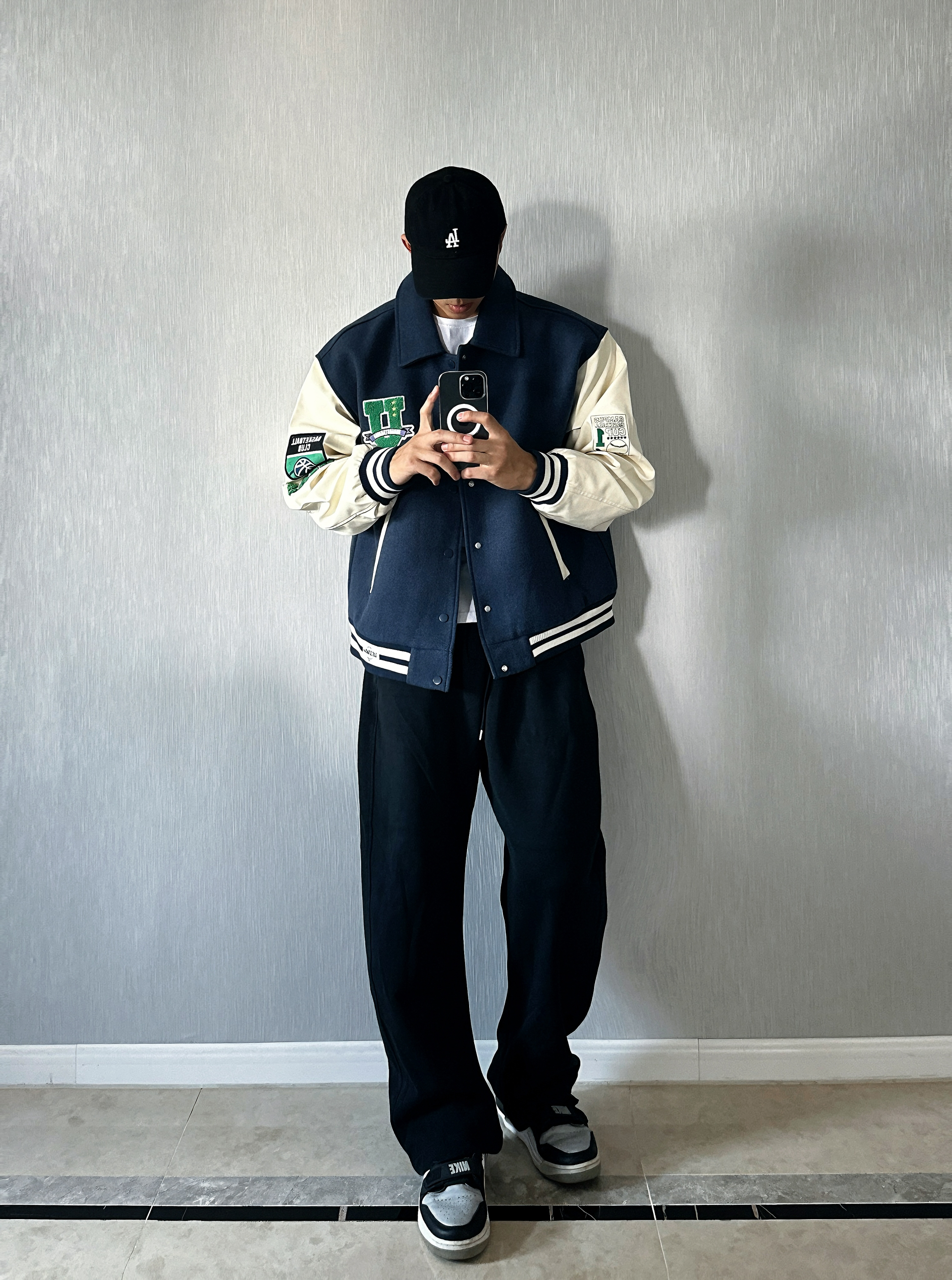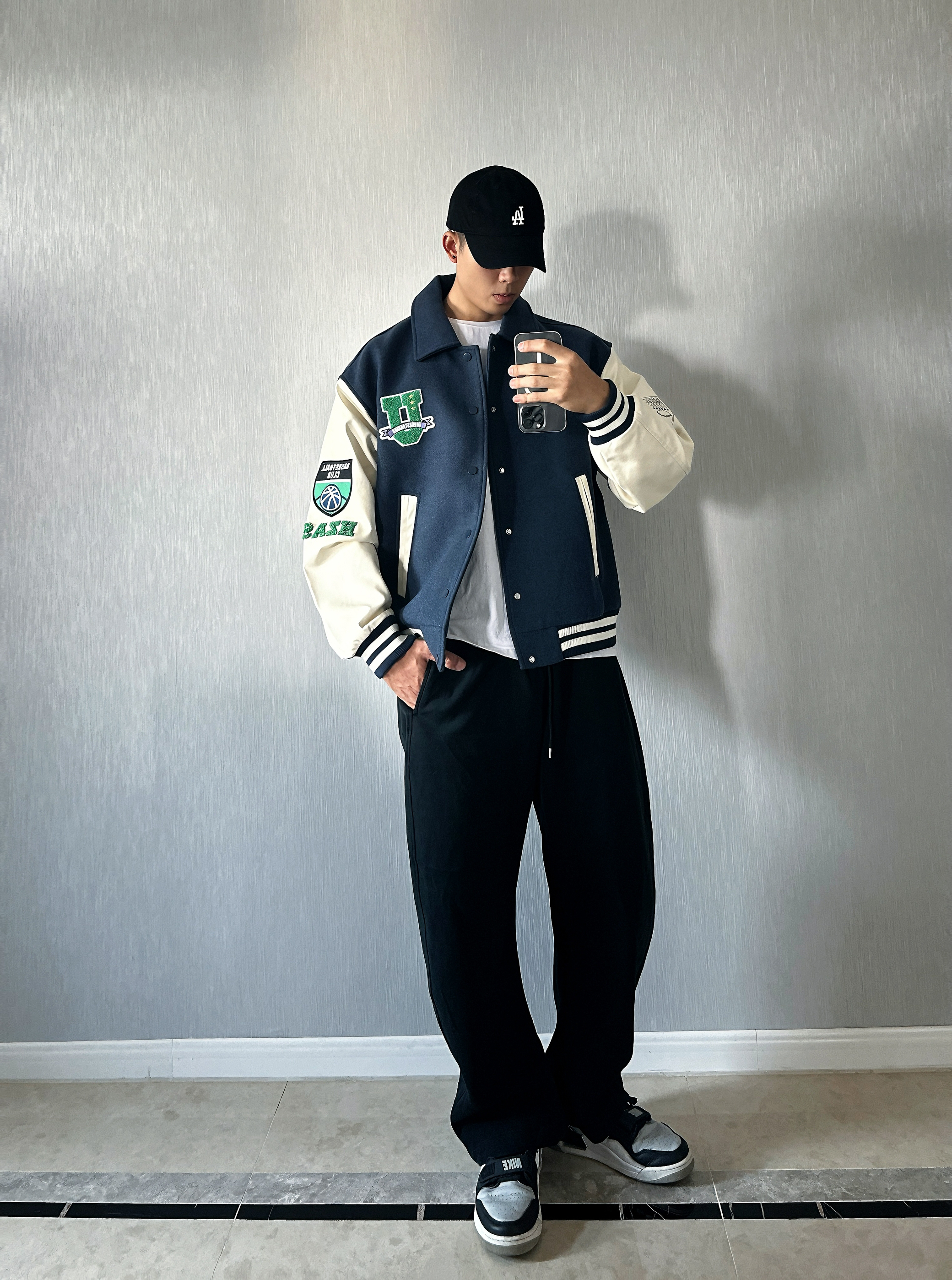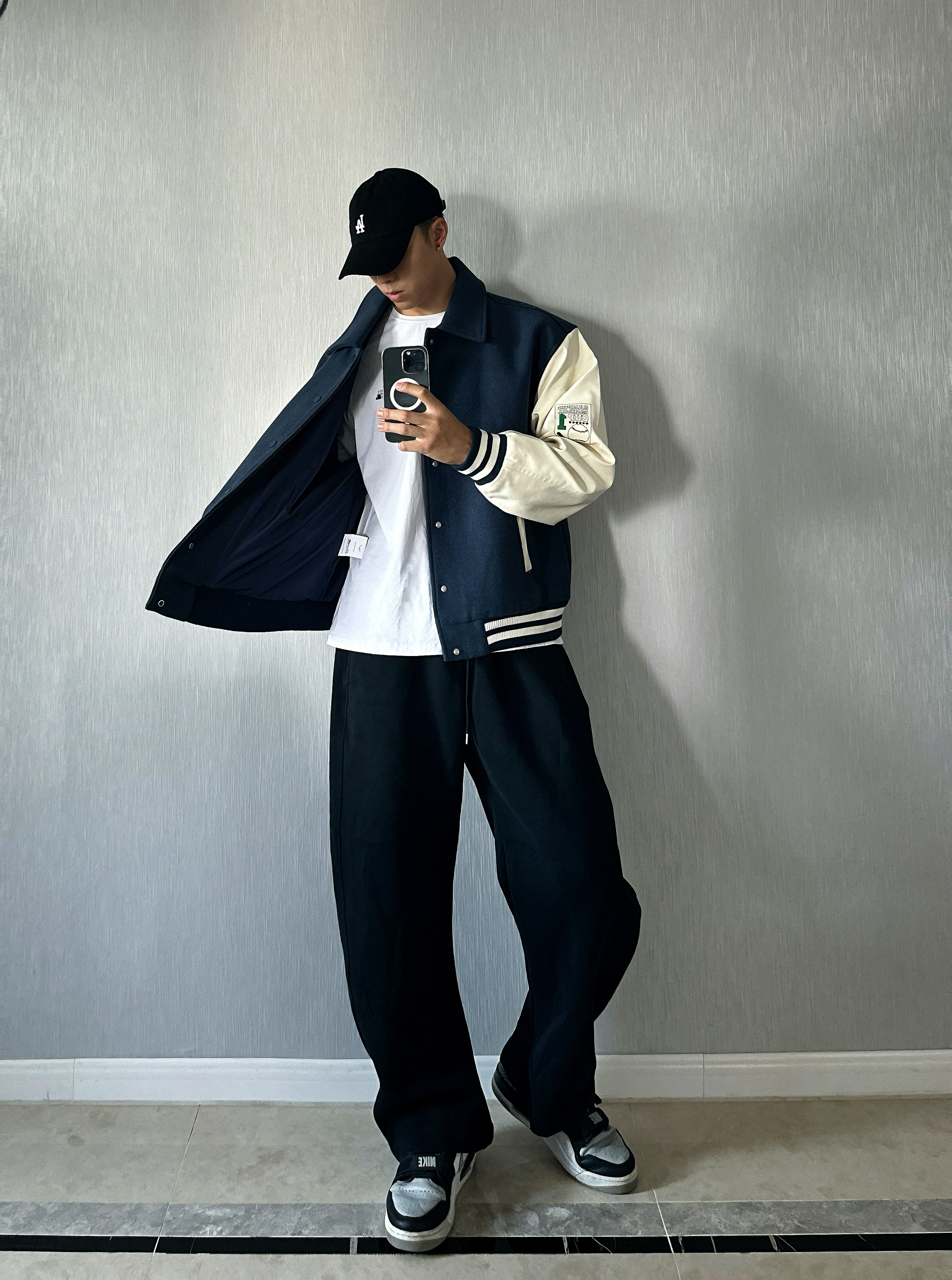 🧍♂️ :今日cleanfit 少年感穿搭! 🧢:logo印花 黑色鸭舌帽 👔:内搭一件纯白色衣服,外套是一件。老白配色棒球服,袖套是pu材质。 👖:搭配一条纯黑色阔腿裤 👟: 一双烟灰色AJ312平底鞋