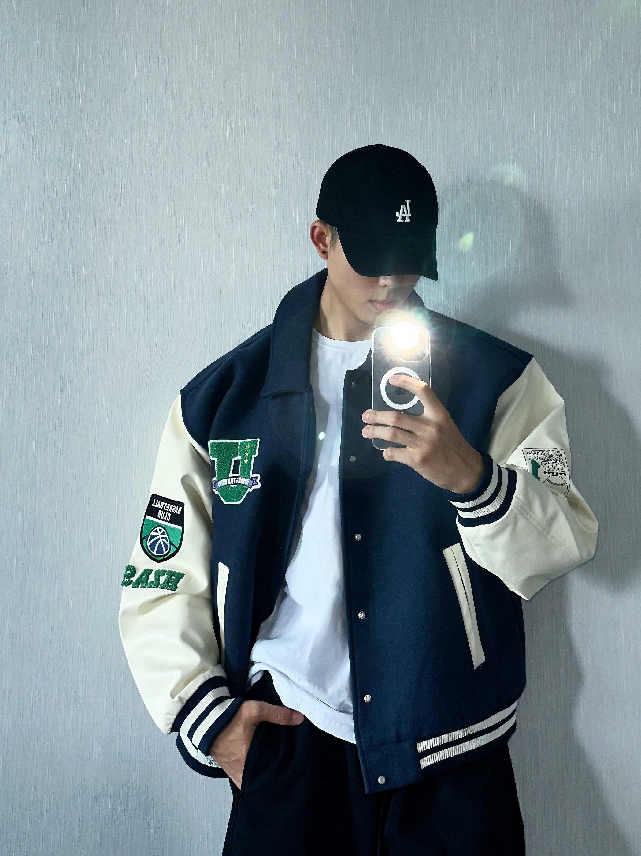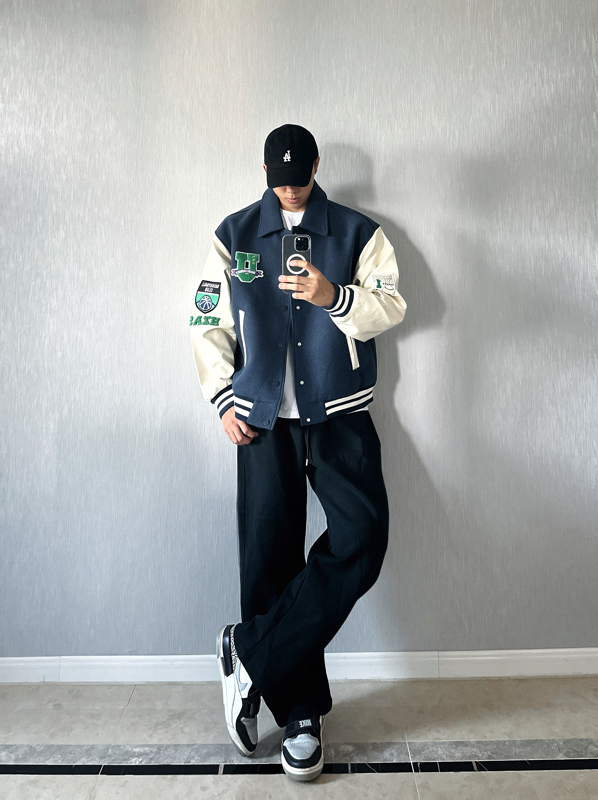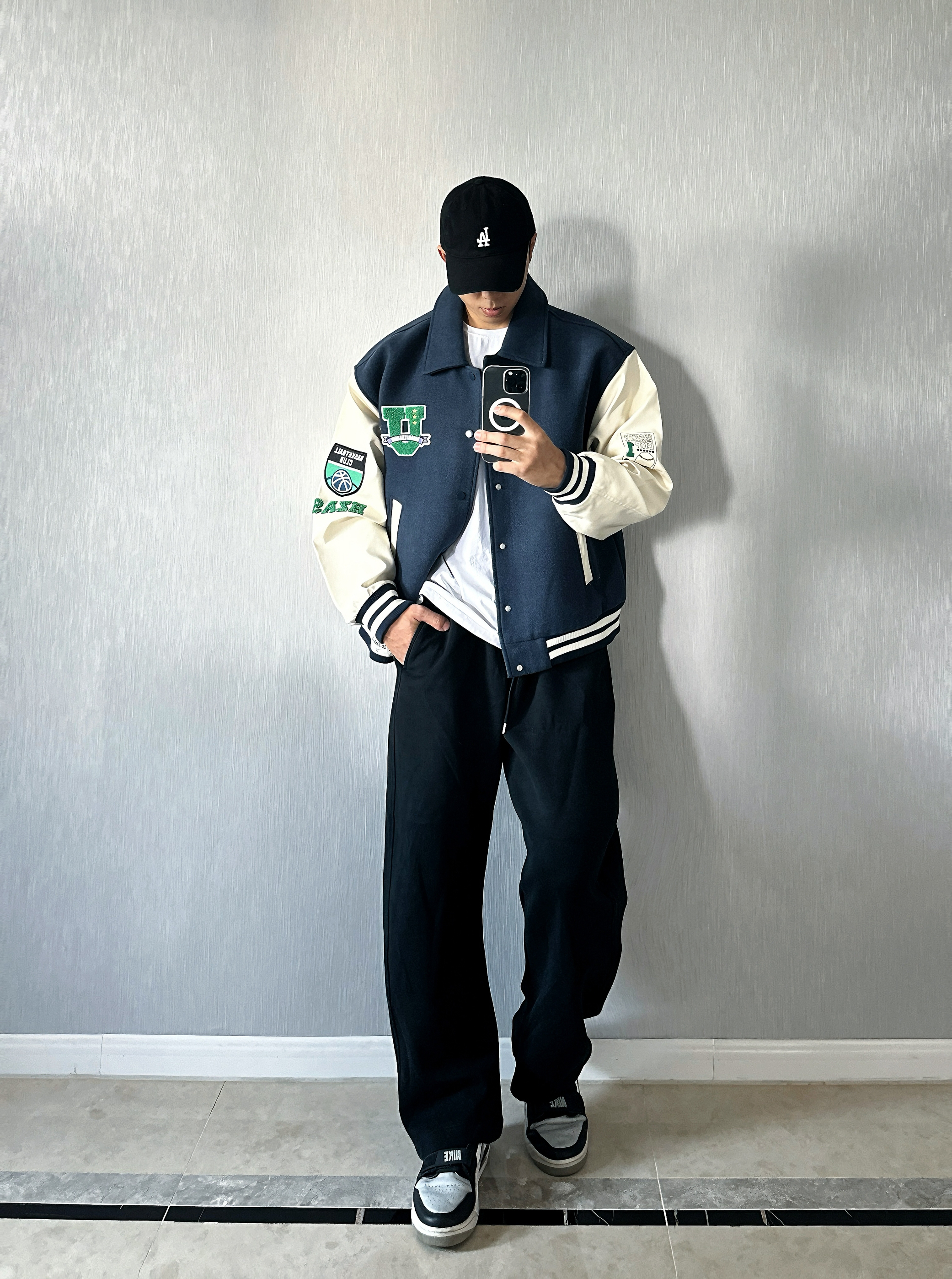 🧍♂️ :今日cleanfit 少年感穿搭! 🧢:logo印花 黑色鸭舌帽 👔:内搭一件纯白色衣服,外套是一件。老白配色棒球服,袖套是pu材质。 👖:搭配一条纯黑色阔腿裤 👟: 一双烟灰色AJ312平底鞋