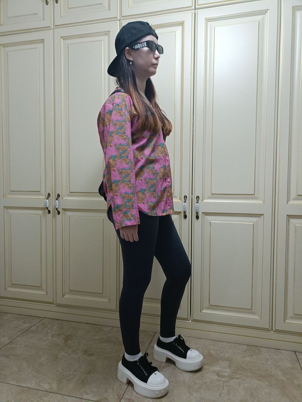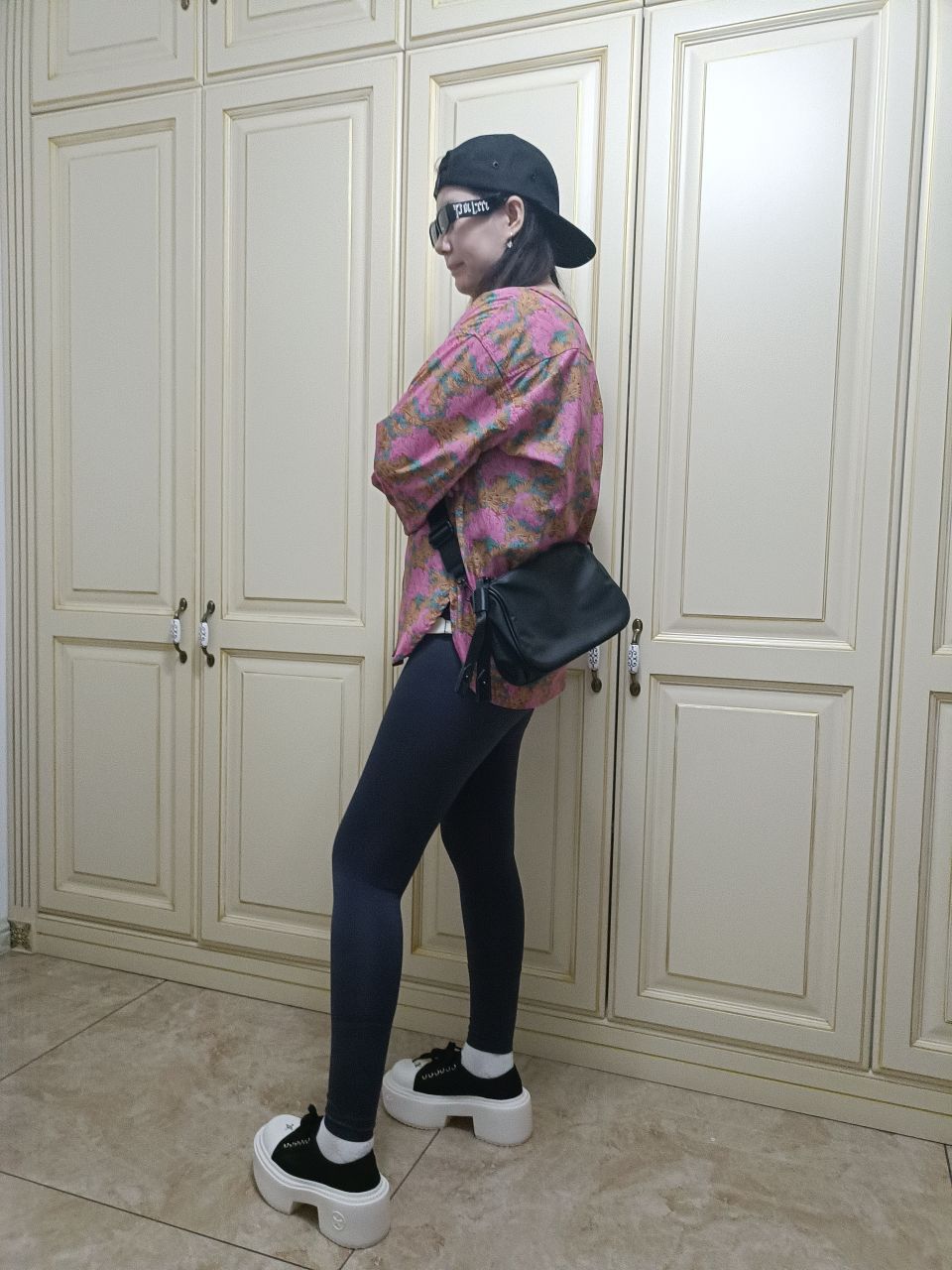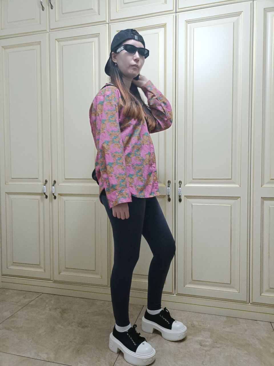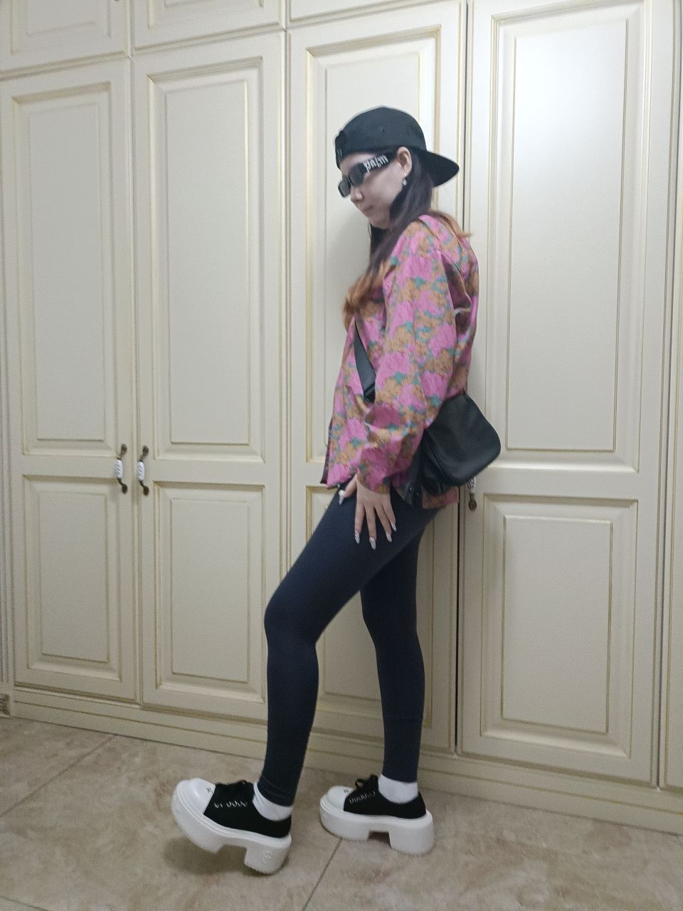 身高|体重:165|105 🧍♂️ 穿搭风格:街头风 👔 上衣:jnby衬衫 👖 下装:瑜伽裤 👟 鞋子:smfk松糕厚底板鞋 🎒配饰:黑色卡哈特棒球帽,黑色斜挎包