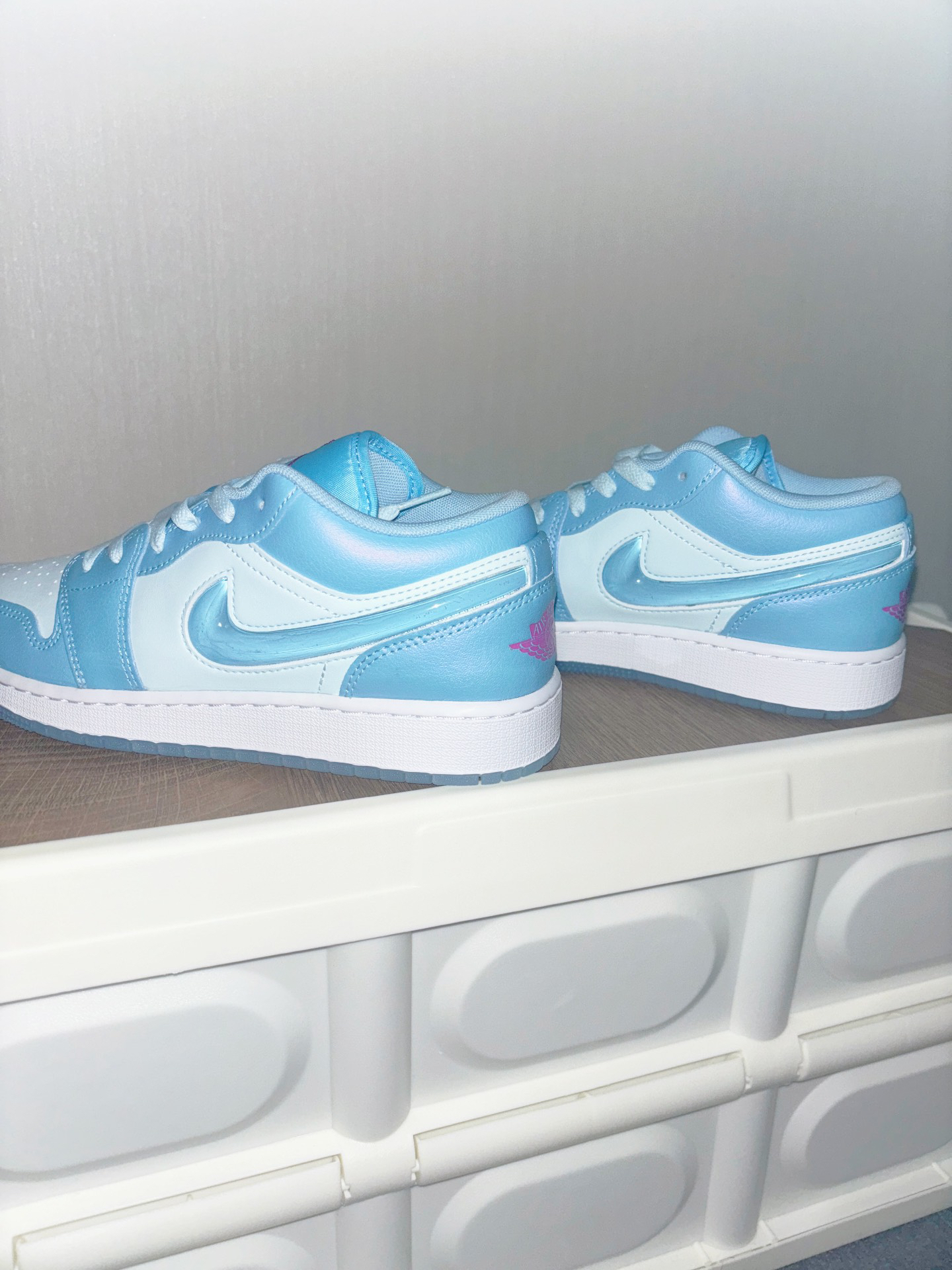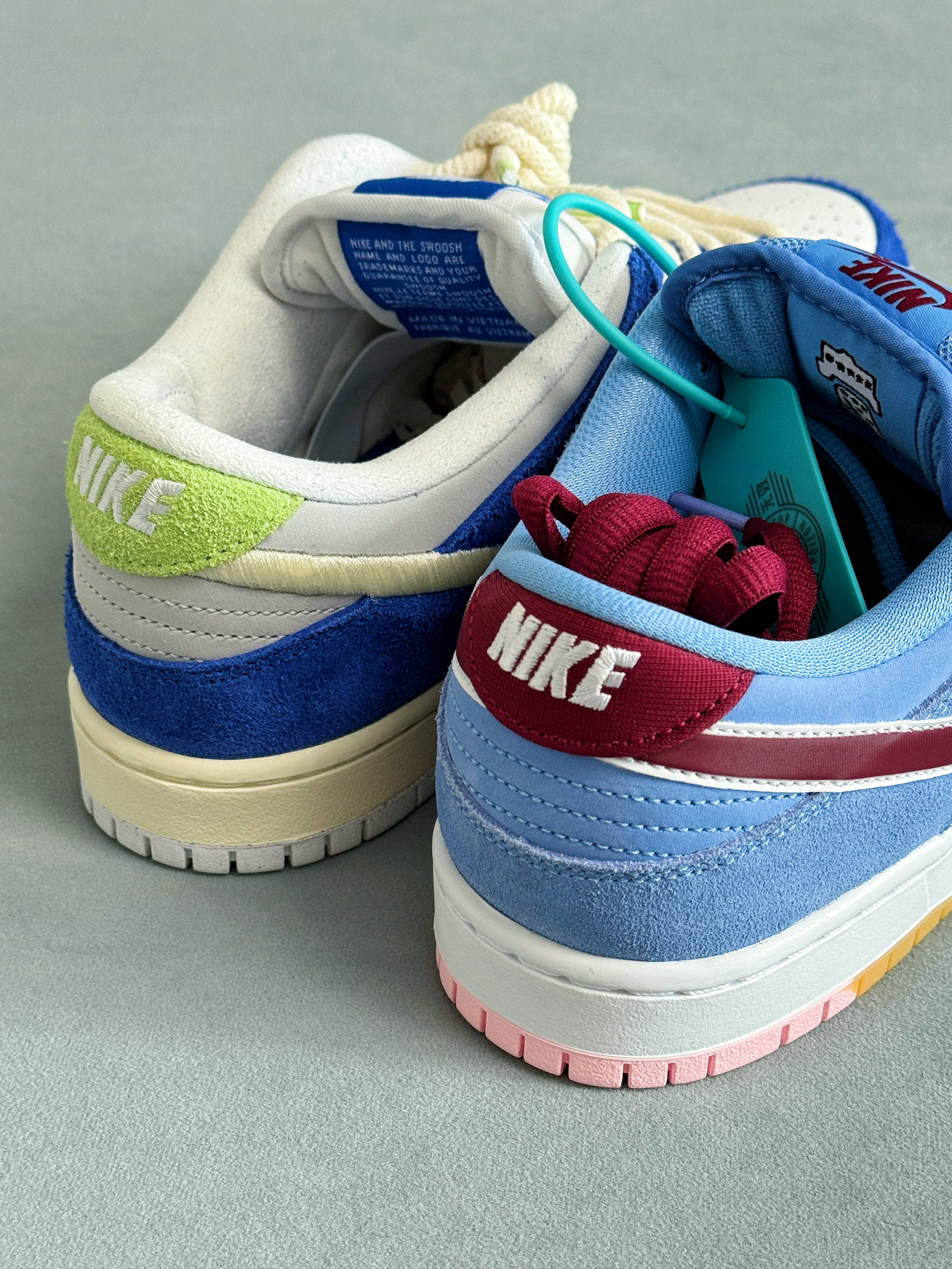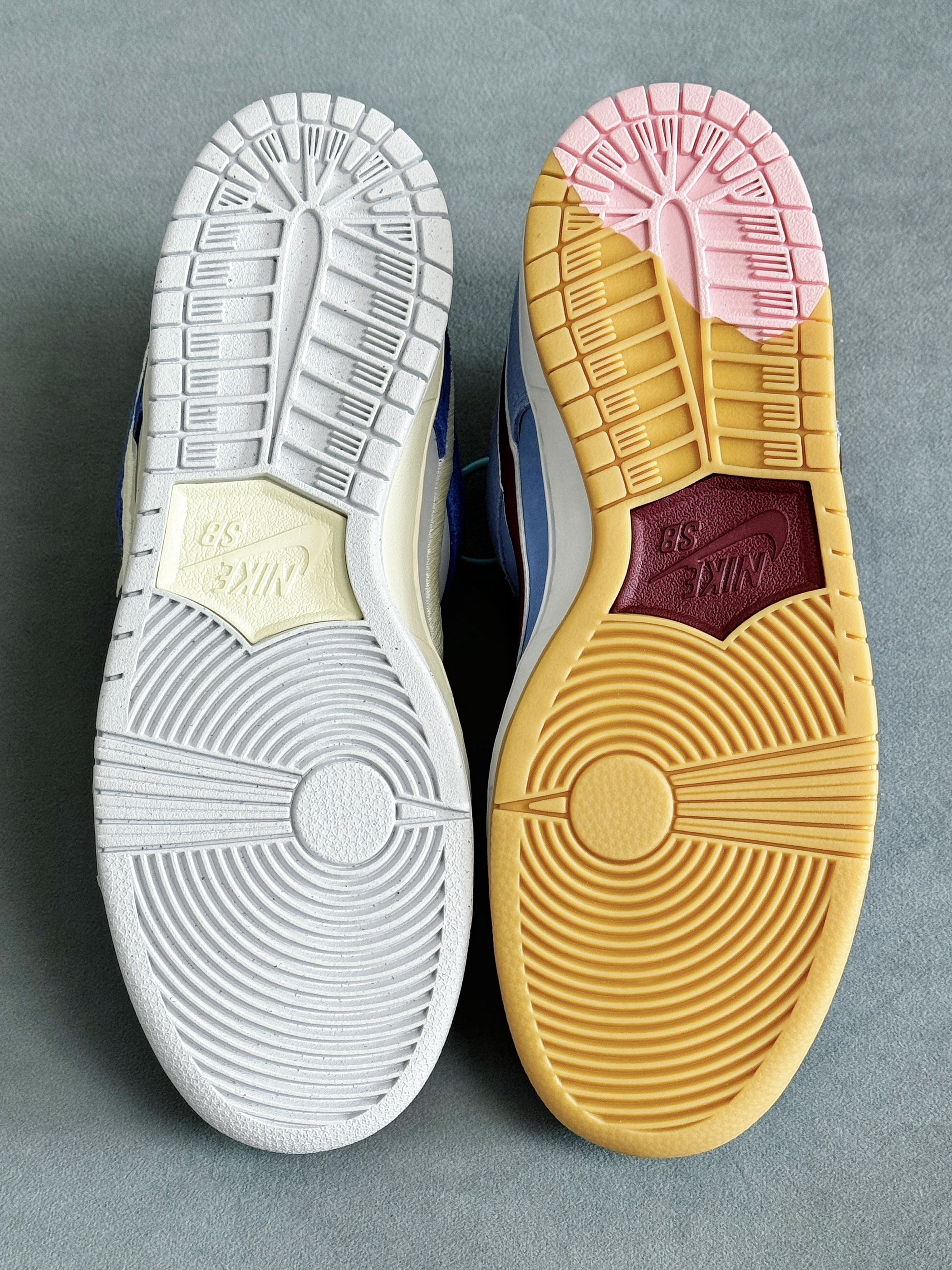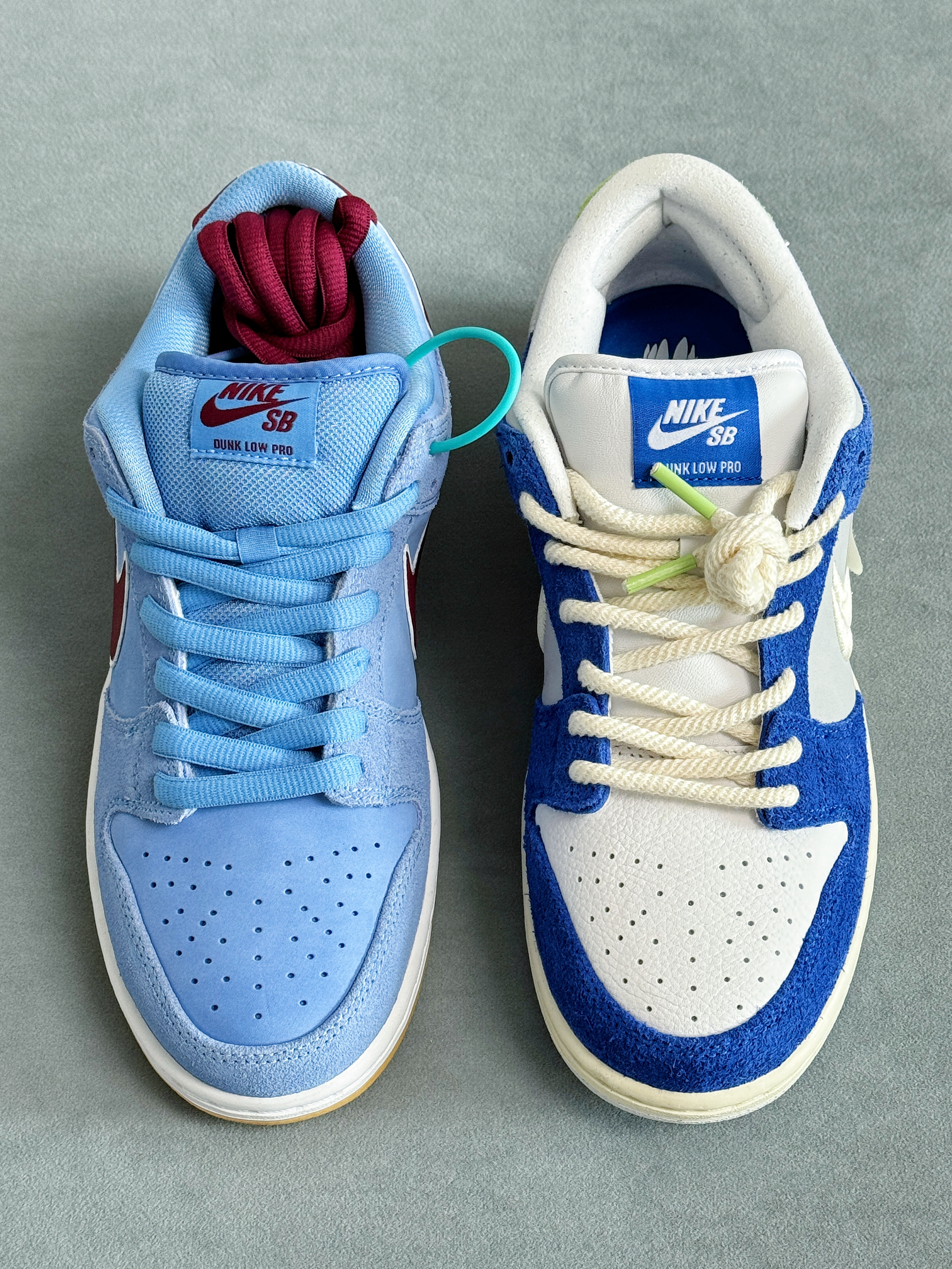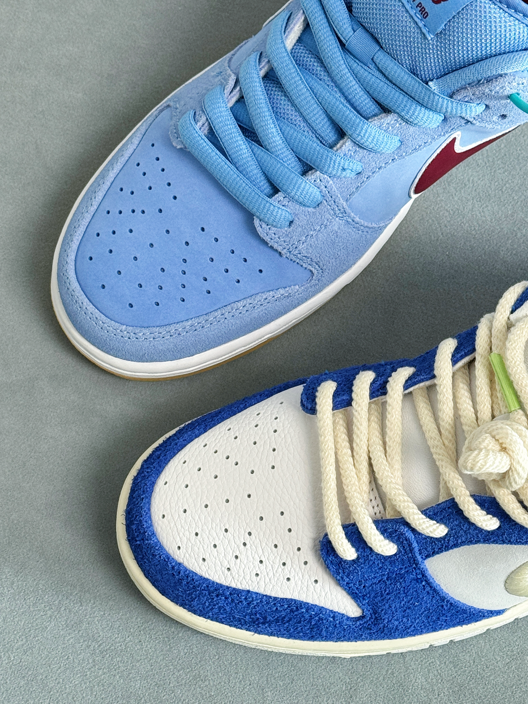 实物质感都蛮惊艳的两双DunkSB 都是蓝色系配色,很清新百搭 1️⃣DunkSB白兰花 采用白蓝配色,材质用到了翻毛皮和荔枝皮拼接,主题非常鲜明,侧边的Swoosh还做成了花朵效果,设计造型都很棒,就是翻毛皮也是蛮难打理的! 2️⃣DunkSB费城人 全鞋都是采用了蓝色调,搭配了酒红色进行点缀,麂皮材质很有质感,但是打理难度很高,生胶大底增加了层次感,右脚鞋底还有粉色泡泡糖设计! 两双颜值都不错...
