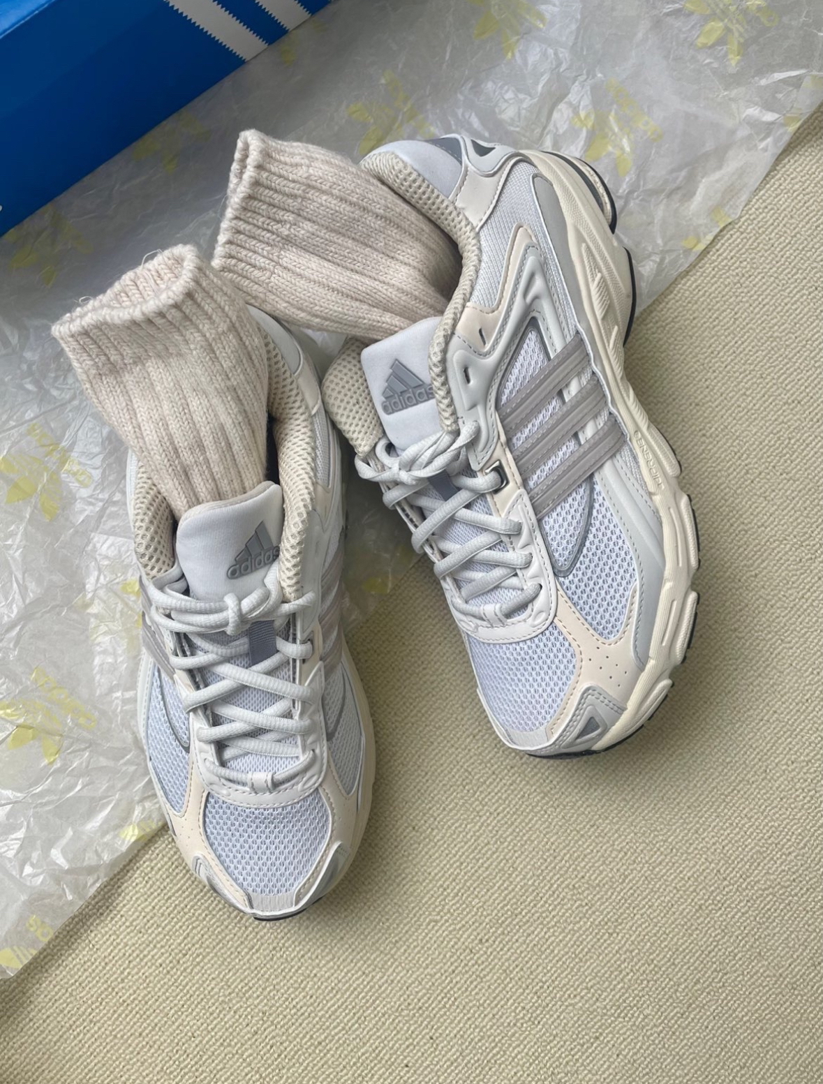 奶呼呼阿迪达斯复古圆头跑鞋 苹果原相机实拍 钟爱这种圆头鞋型 脚感可有一定的增高 透气冬天厚袜子可以穿 颜色多可做情侣款