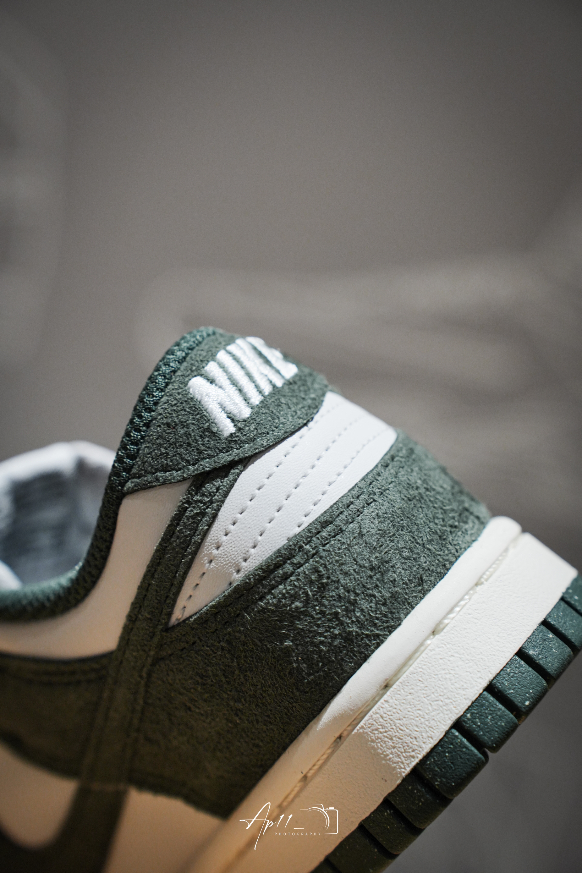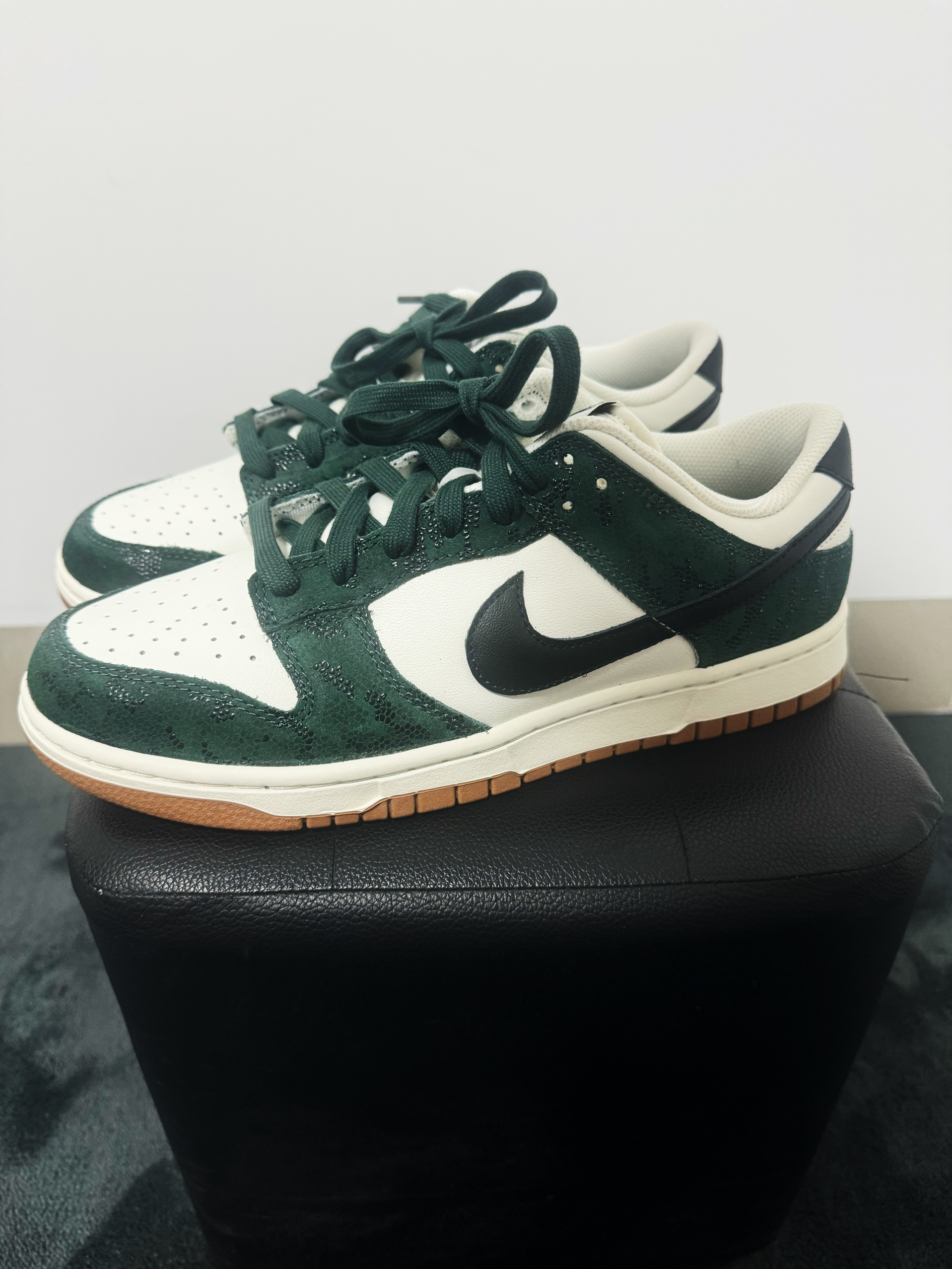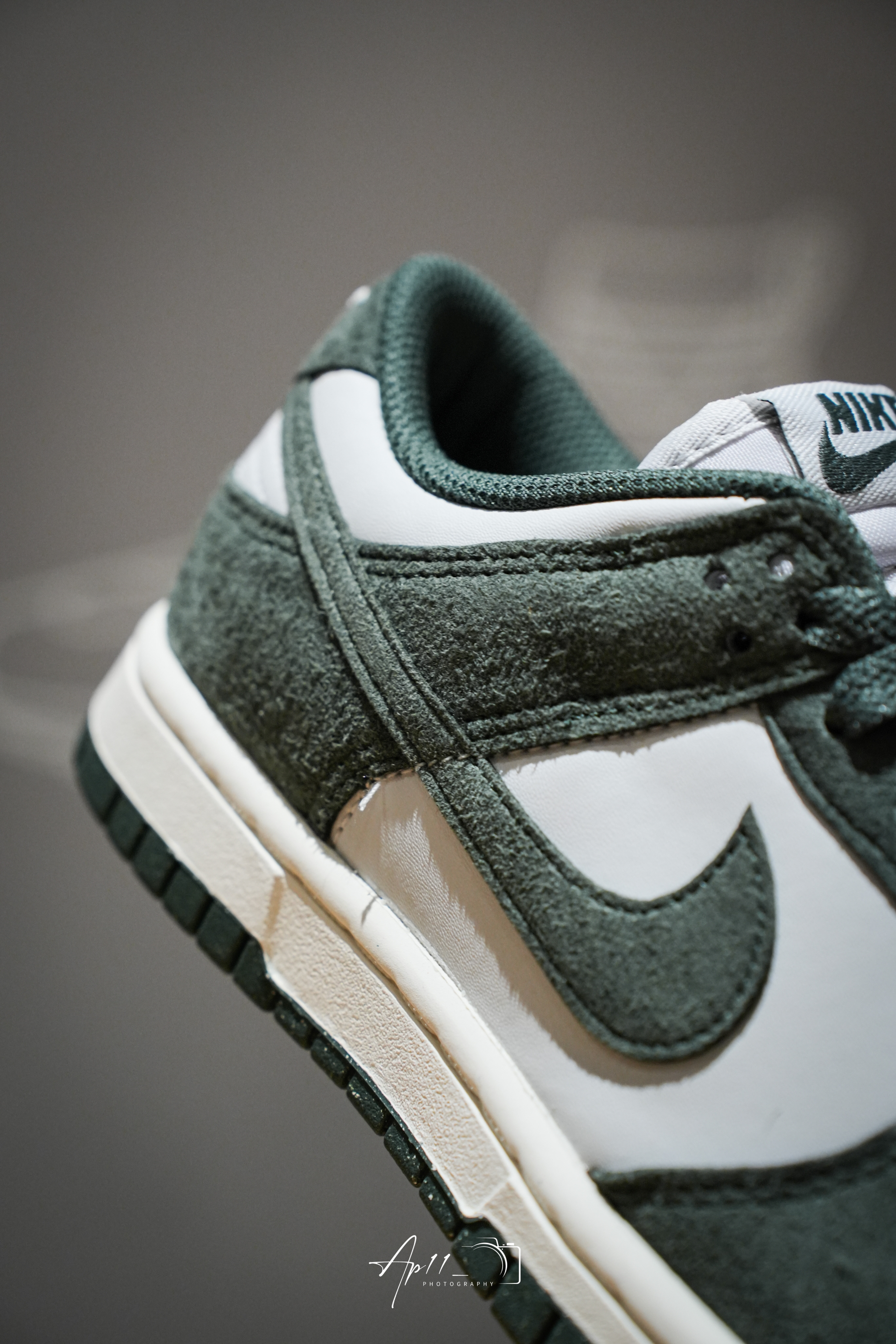 这款Nike Dunk Low配色设计可以说是相当复古的了,整体以墨绿色鞋面为主,搭配灰白色皮革的点缀,整双鞋配色很有一种年代感。而且鞋身的墨绿色部分还是用到了麂皮的材质,质感还是不错的。