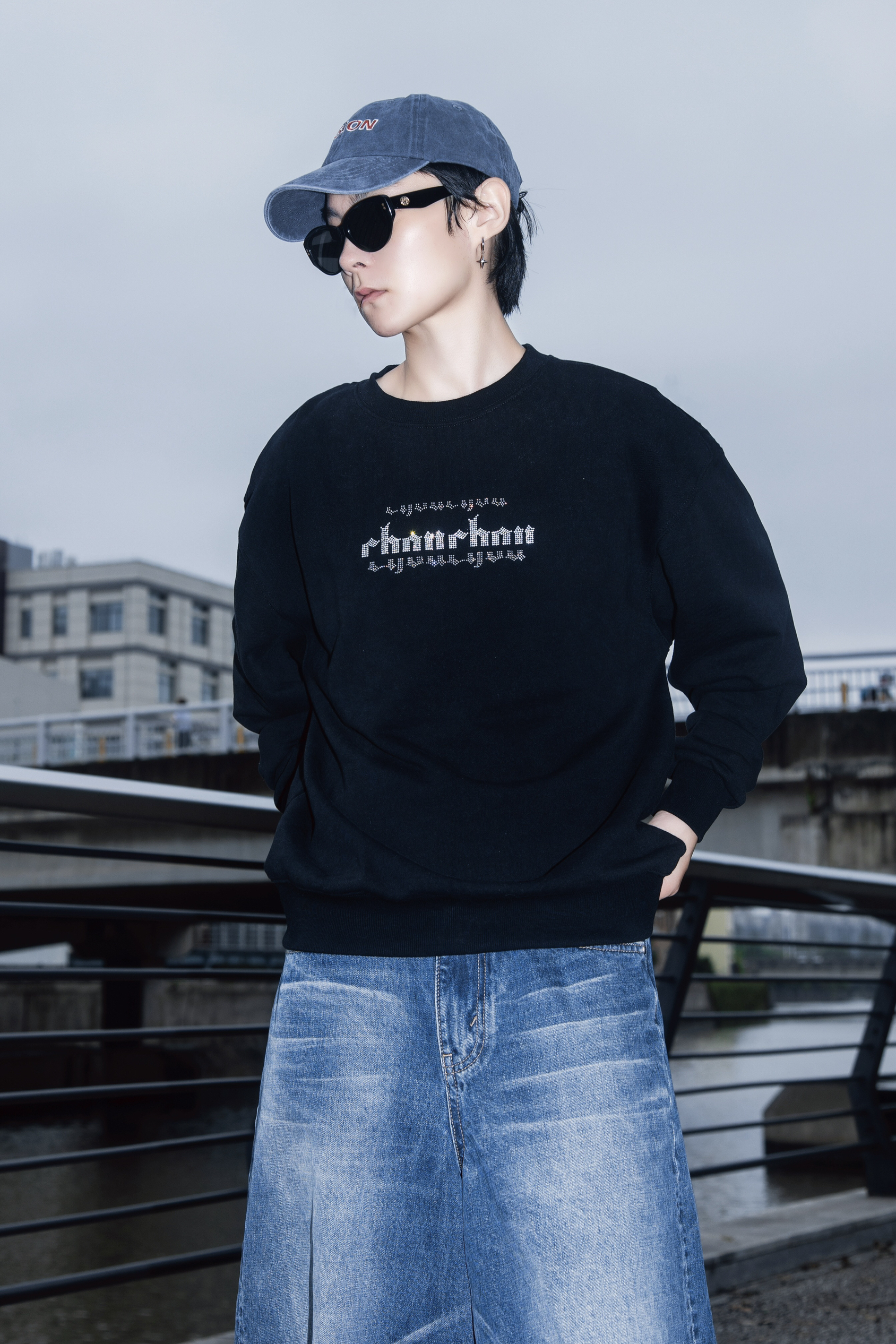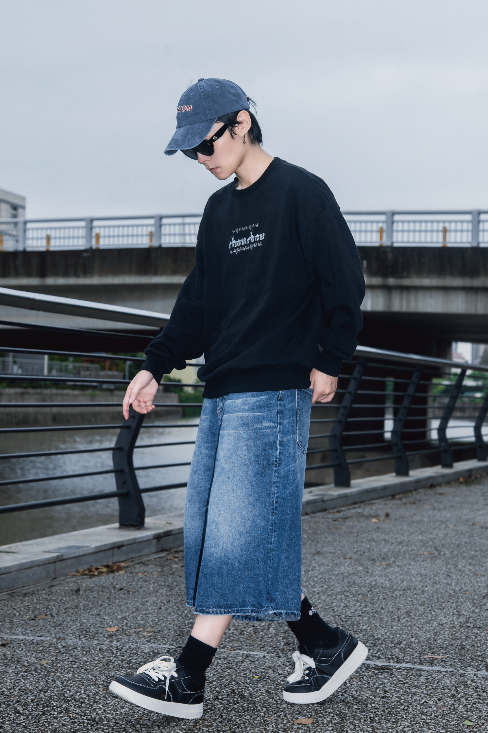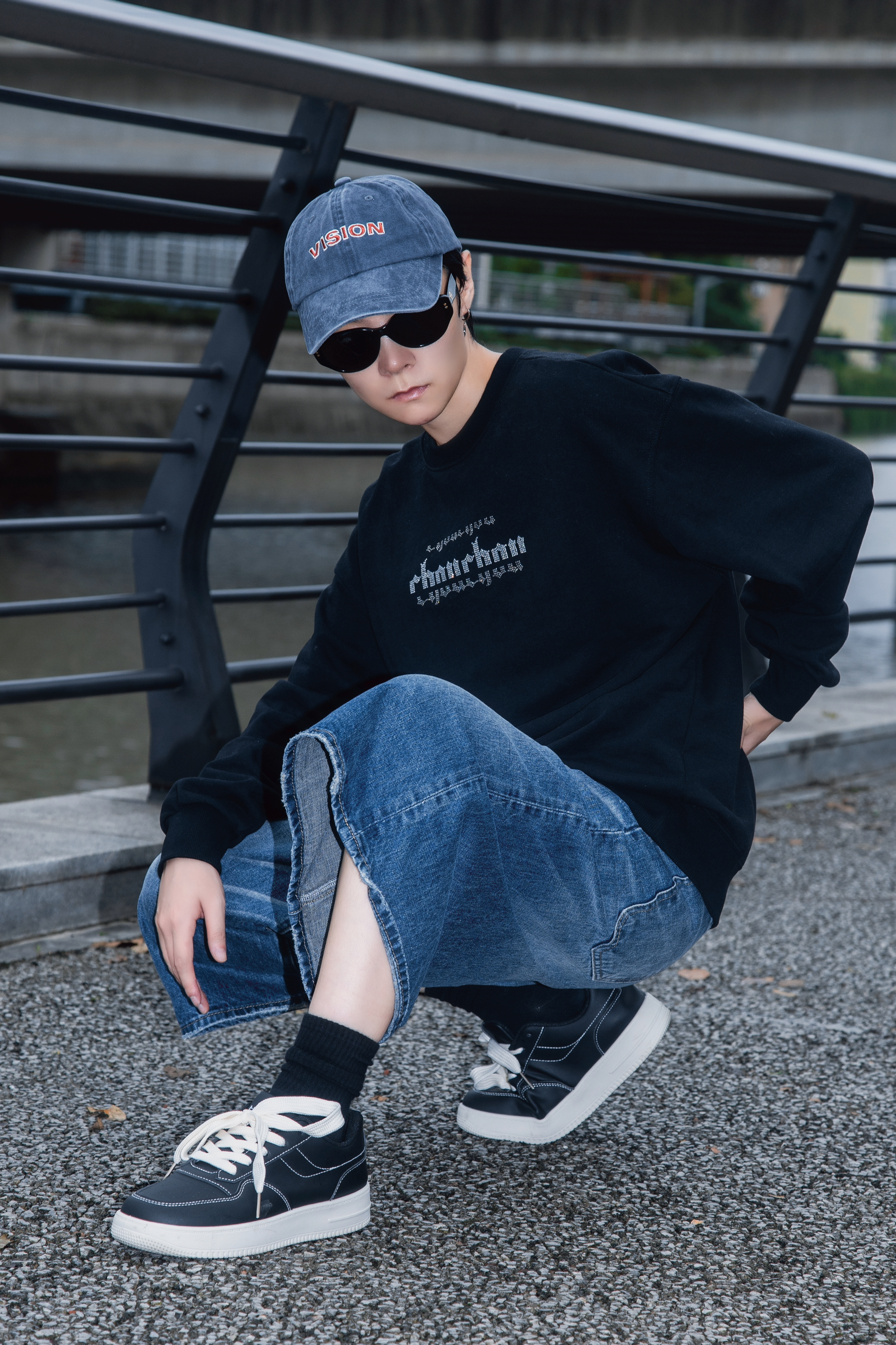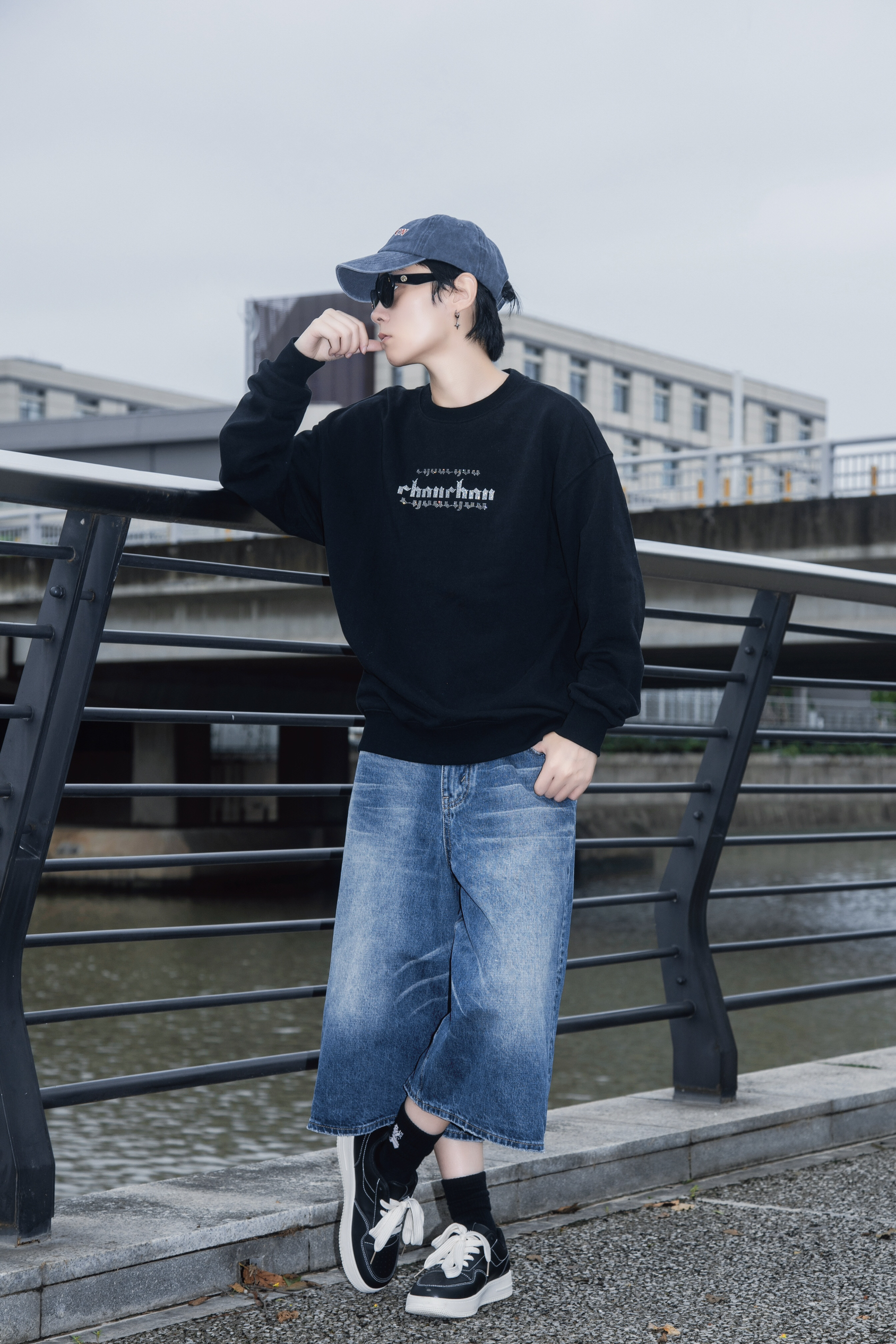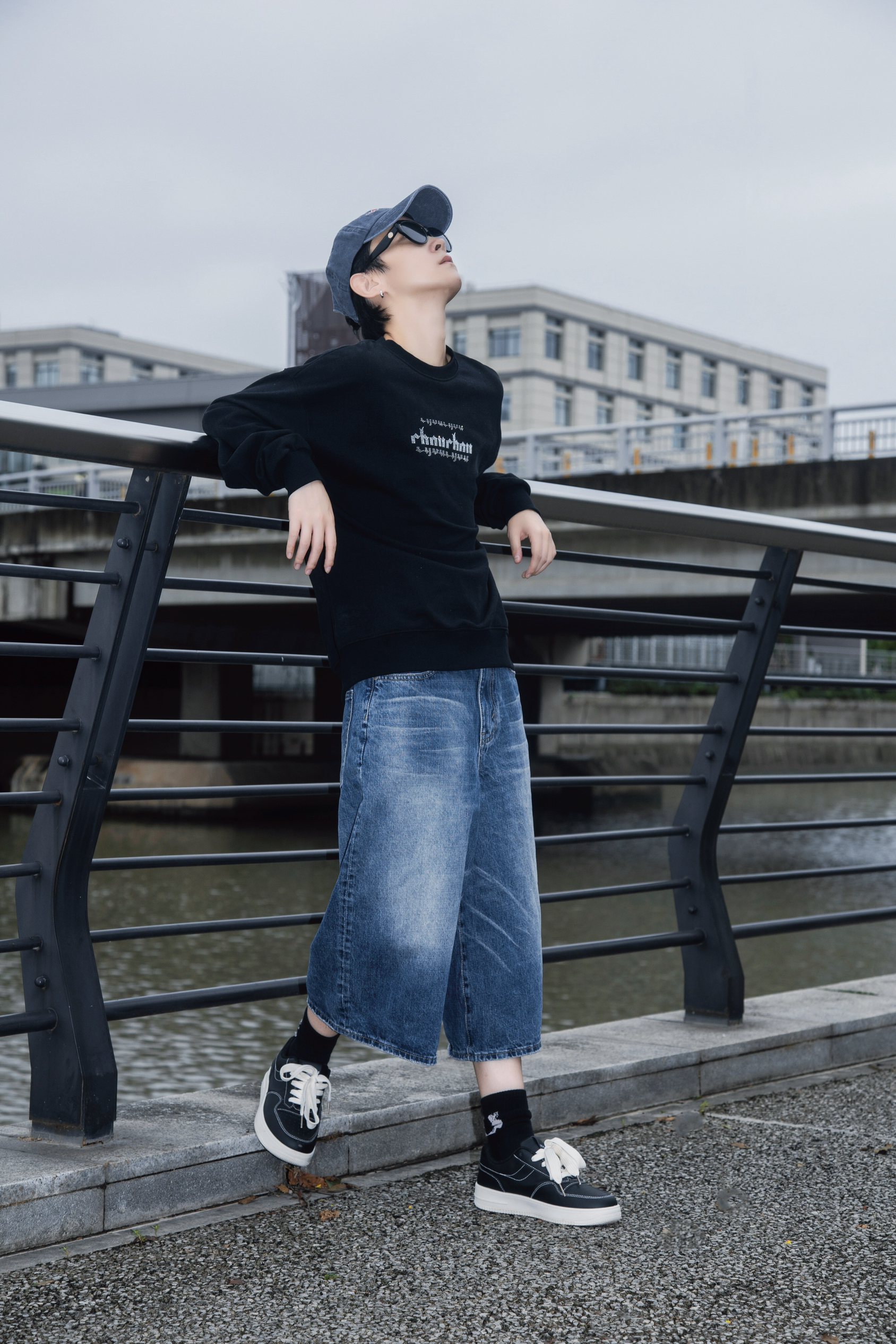 假如你有一件黑色圆领卫衣 一起来看看怎么穿才好看 入秋了可以选一件重磅卫衣 宽松的版型会更随性 周同学这件有烫钻印花 给基础款增加些亮点 配一条蓝色七分牛仔裤 水洗做旧处理 街头感这不就有了 搭一双黑色板鞋首尾呼应一下 戴一顶牛仔鸭舌帽 哎哟 就是这么拽酷拽酷的