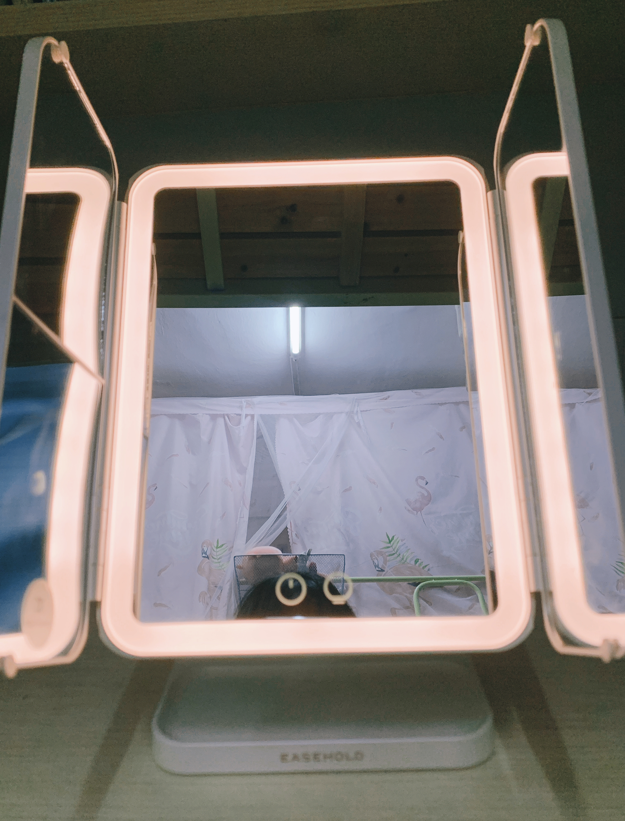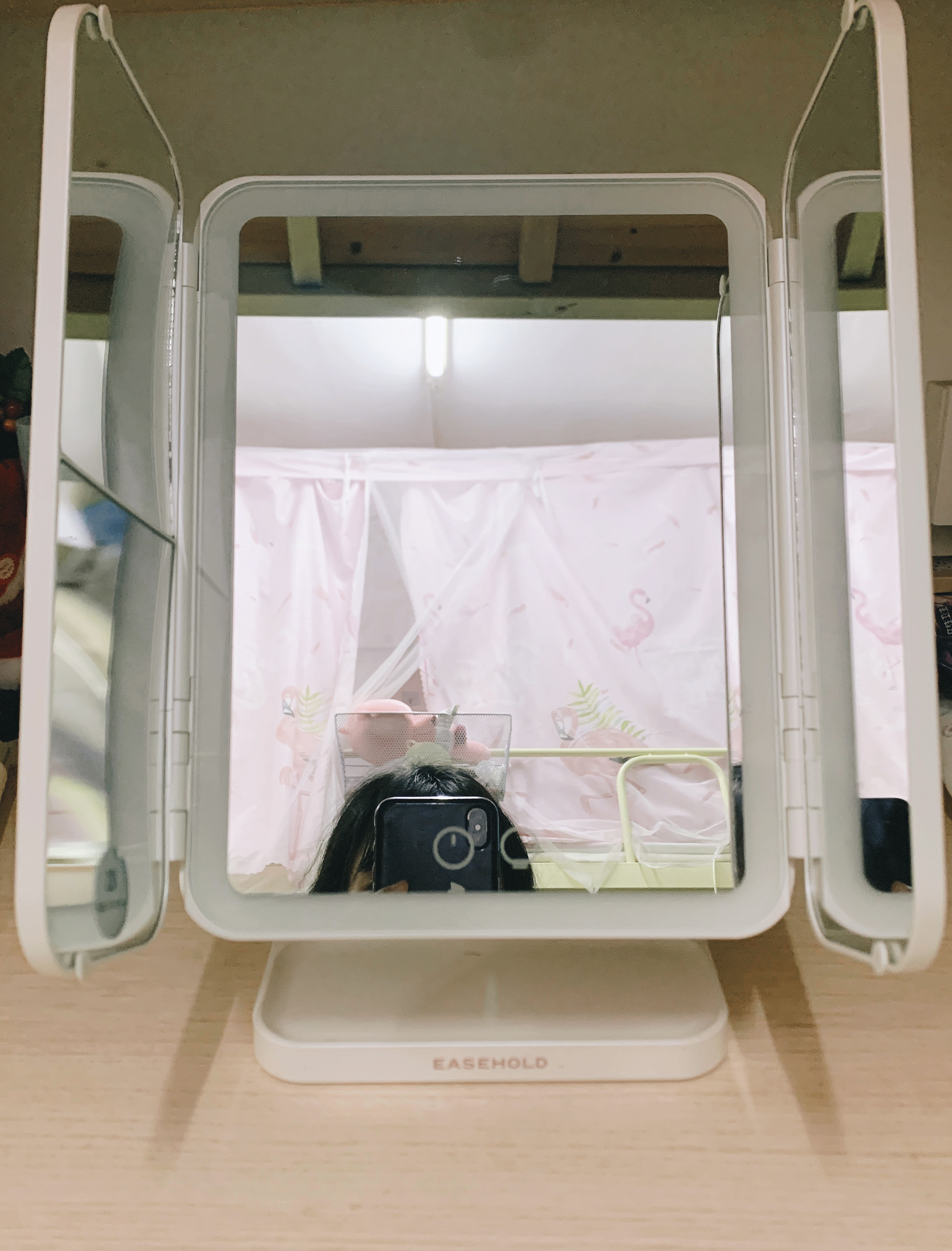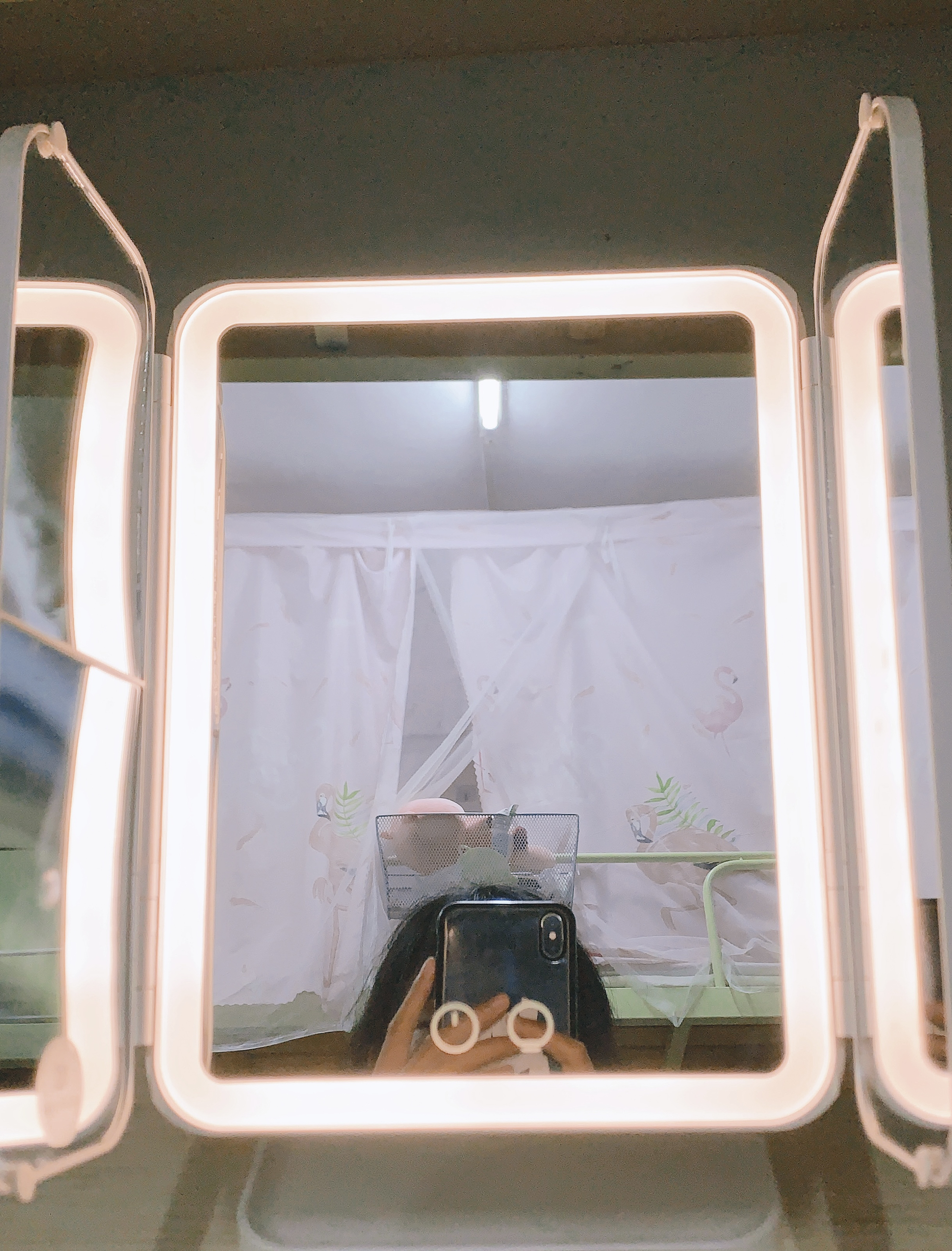 三面折叠化妆镜分别分为三块镜面,每一块镜面都有倍数,化妆的时候看不清就用放大的那面,而且有三种调节灯光,可以根据需要调节,真的太方便啦!而且可以上下左右转动,非常的方便,摸起来 质感超好,包装也倍有面,快冲!