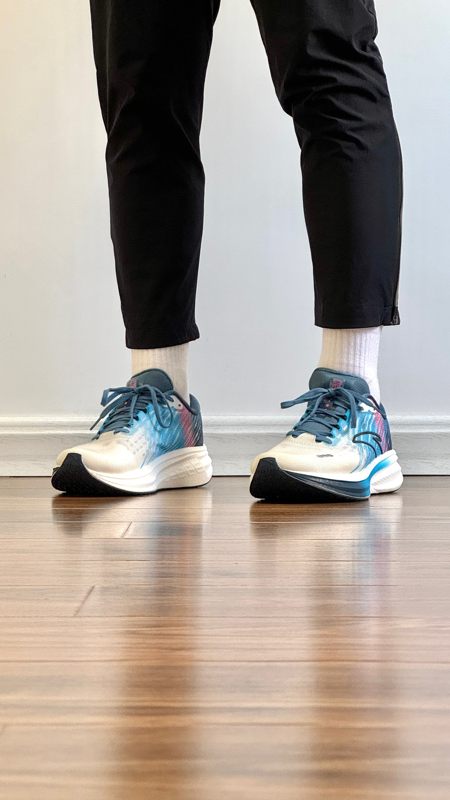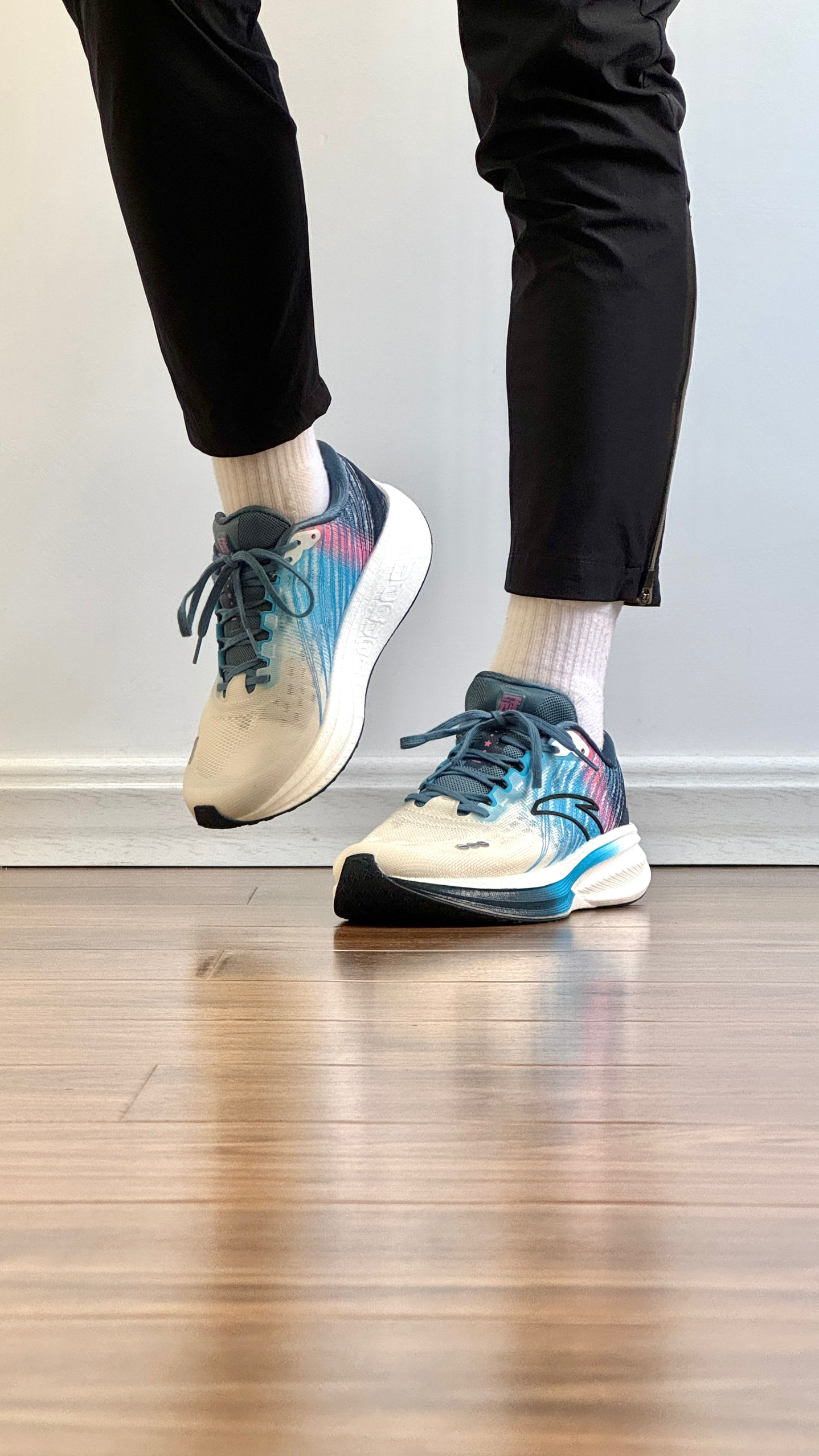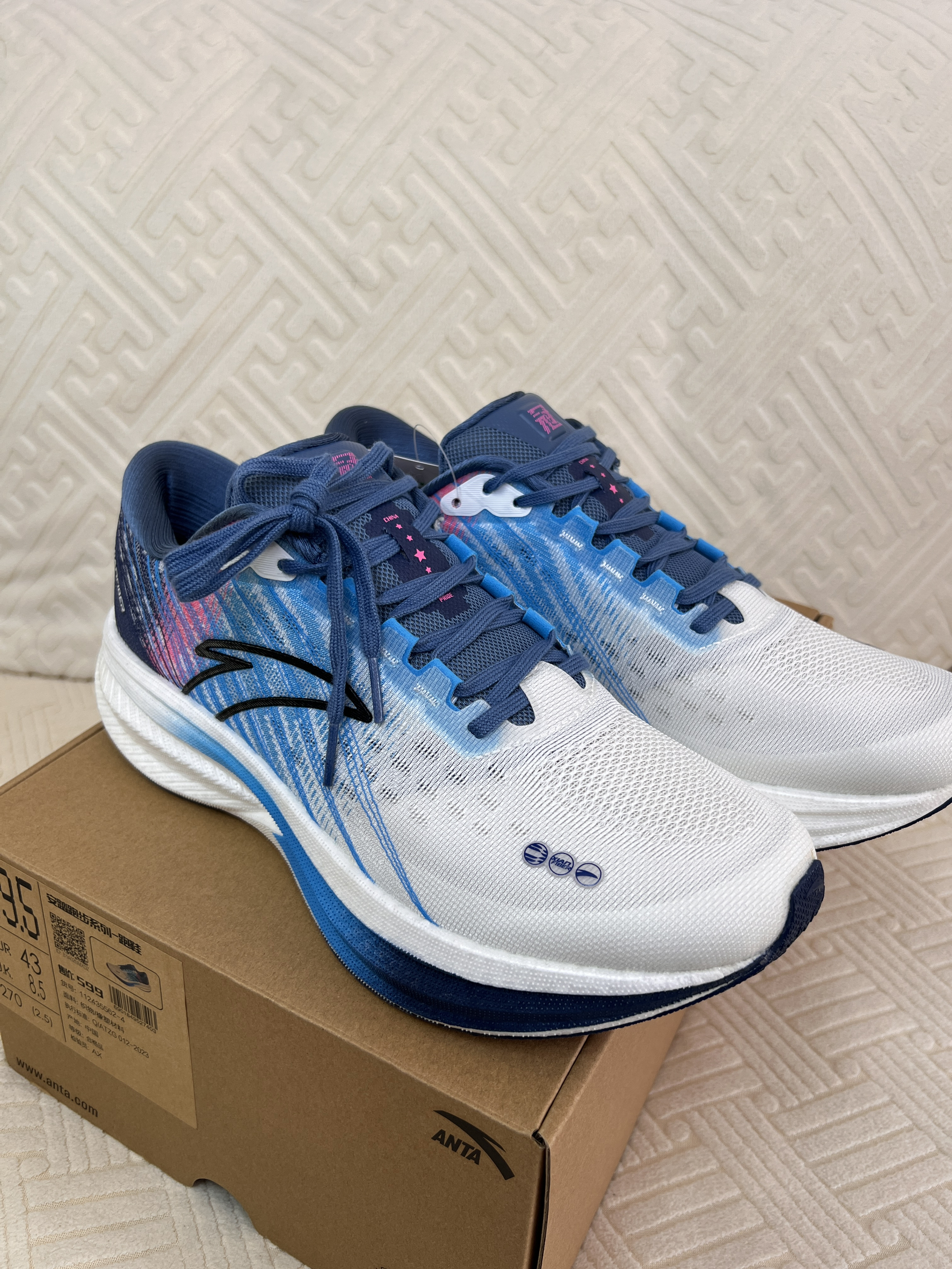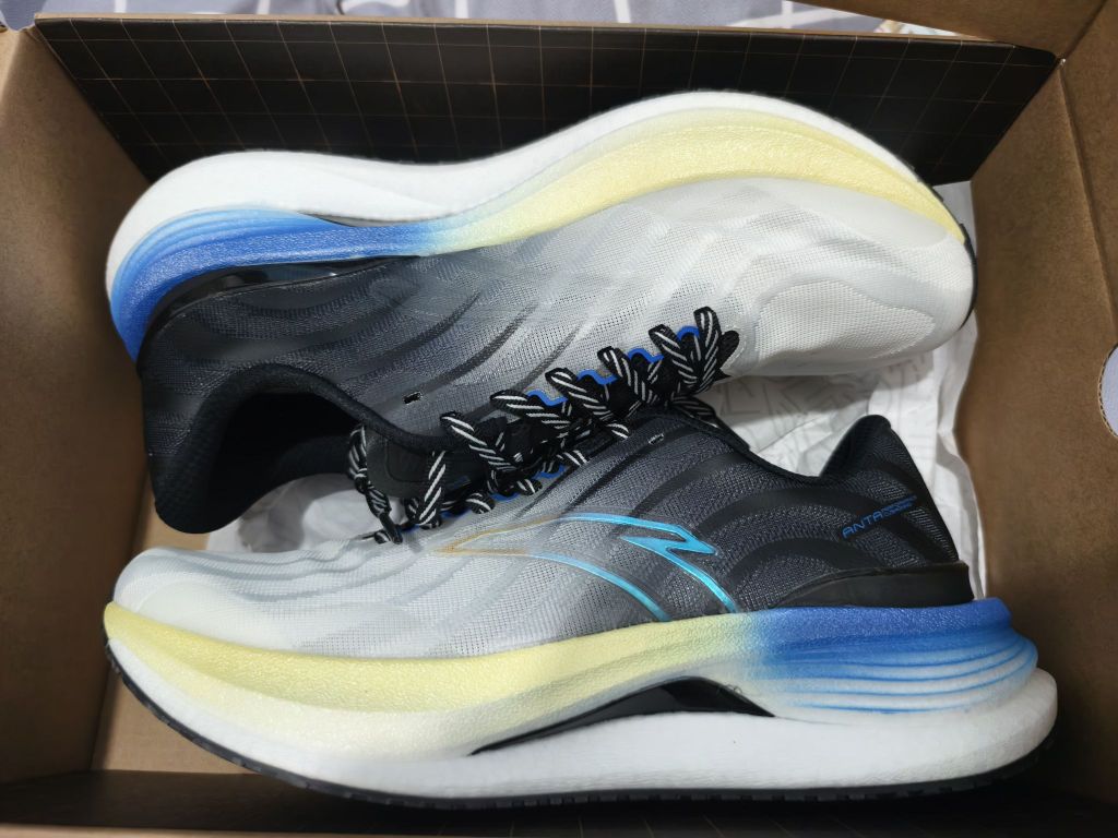 白蓝配色清爽百搭。TPU绞综编织鞋面轻量透气。中足与后跟搭载弦科技包裹更出色。前后掌坡差8毫米。全掌氮科技中底脚感软弹。中足内嵌TPU稳定片保证足底刚性。龙鳞大底防滑耐磨不挑场地。尺码正常。适合中小体重日常通勤,中长距离竞速训练及半马比赛使用。
