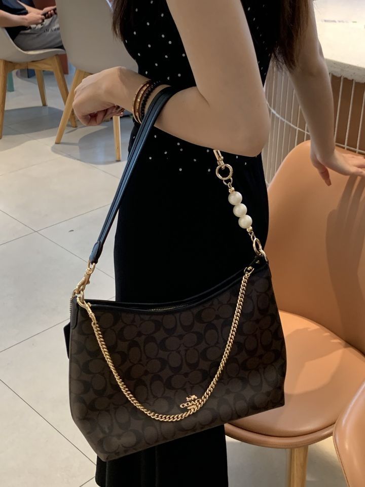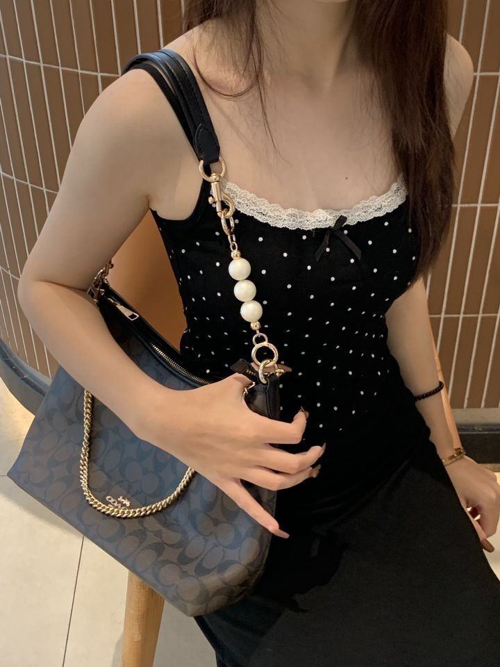 原肩带过短,使用起来很不方便。幸好我发现了神奇的直金珍珠和装饰链小狗扣。它们让包包瞬间变得可以腋下背,时尚感爆棚,实用性也大大提升。