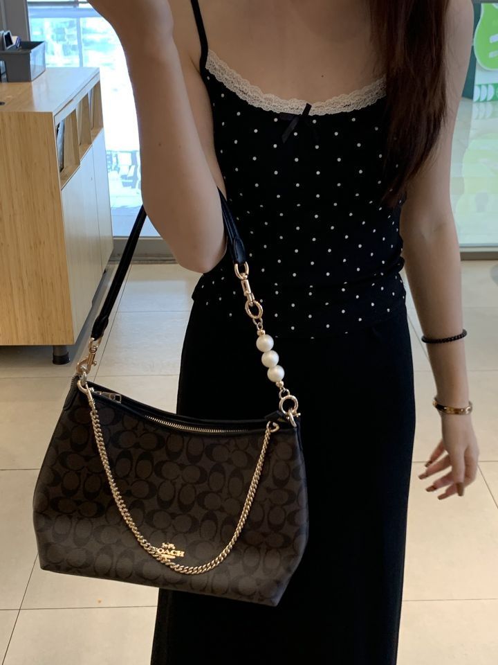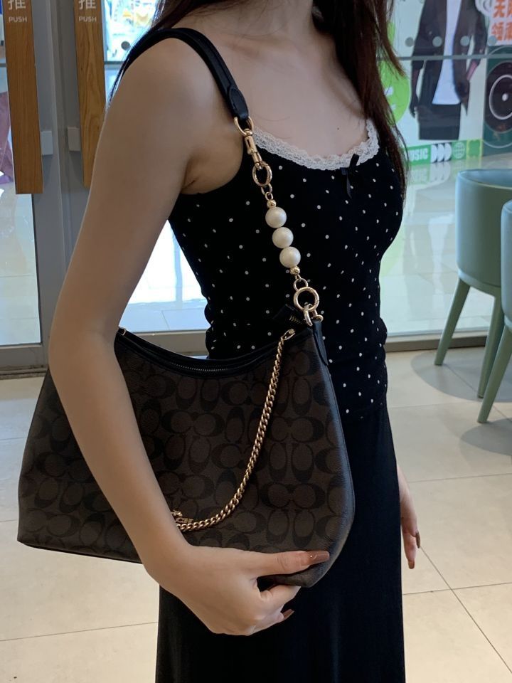 原肩带也太短了,实在让人困扰。好在我找到了直金珍珠和装饰链小狗扣!有了它们,包包可以轻松腋下背,既好看又实用,简直是完美组合。