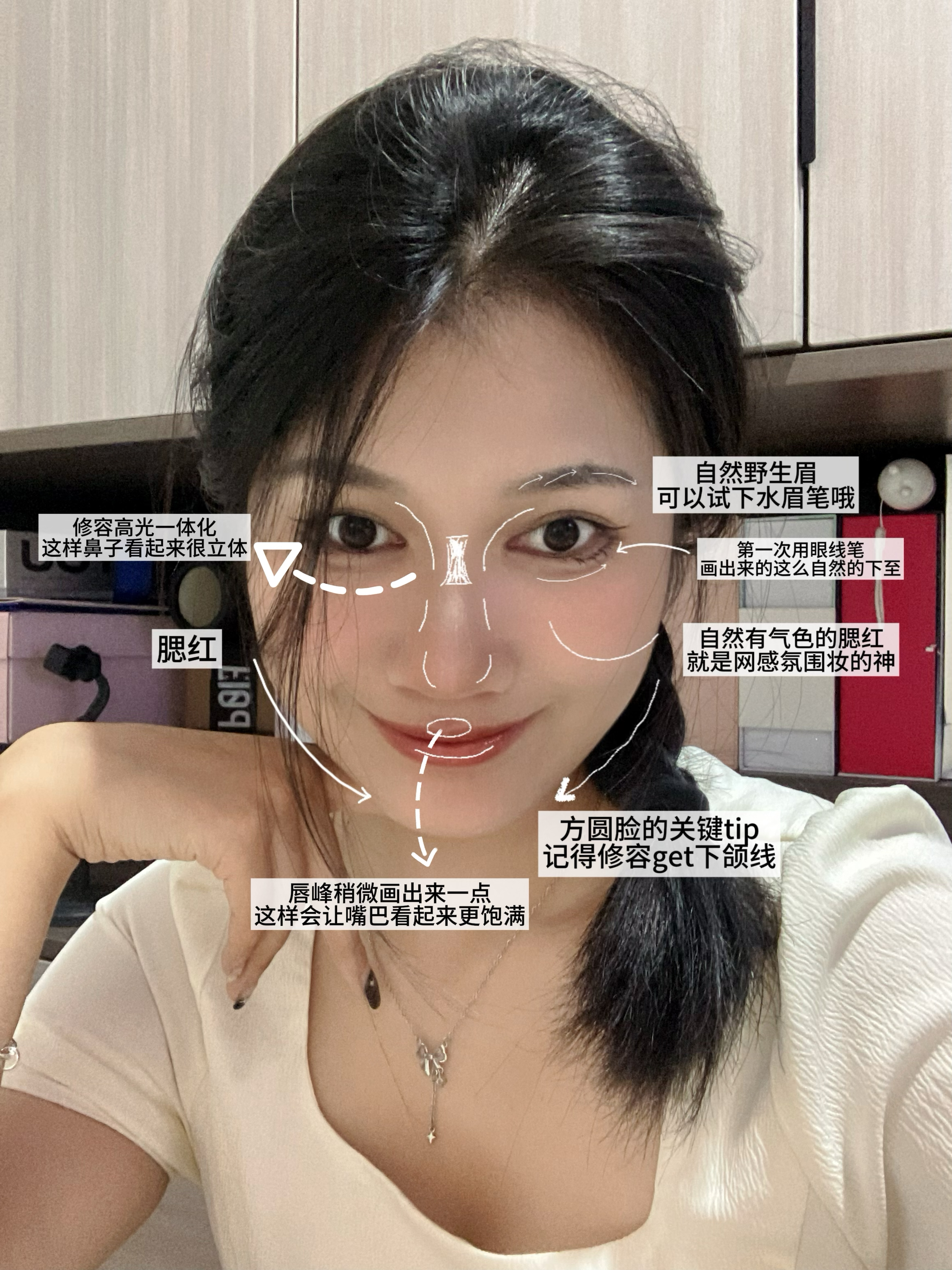最近get到了网感妆容的关键 我服了真相就是越浓越是出片‼️ 👀小猫眼线➕下至和下睫毛 感觉有了下至以后眼睛变大了一圈 👃鼻头鼻中的高光和鼻侧的阴影 我的小塌鼻子有一天也能拔地而起哈哈 👄嘴巴画个唇峰下嘴唇也是一眼看就很饱满~ 呜呼~勇敢尝试✌🏻就这么水灵灵的画出来啦
