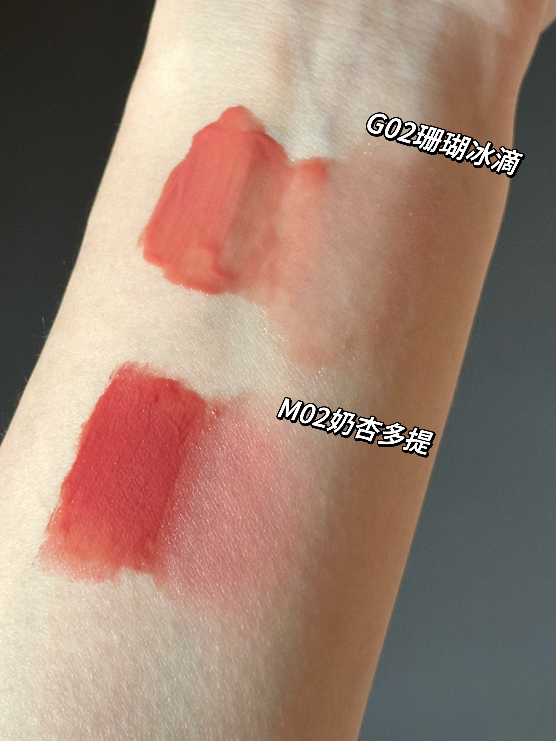 礼盒里面除了周边有这两只口红,颜色都挺不错的蛮日常,我个人皮肤是黄2白深唇,上嘴没有染唇的情况质地蛮丝滑的, g02是水光唇釉,颜色对我来说可能稍微有点浅适合浅唇的妹子不过质地很滋润,颜色也蛮日常的素颜也可以涂,适合纯欲日常妆容 m02是雾面哑光一点的效果,唇泥的设计很丝滑不卡纹,擦掉也没有染唇的情况适合现在秋冬天的季节,颜色也很日常,适合校园日常或者高冷御姐妆