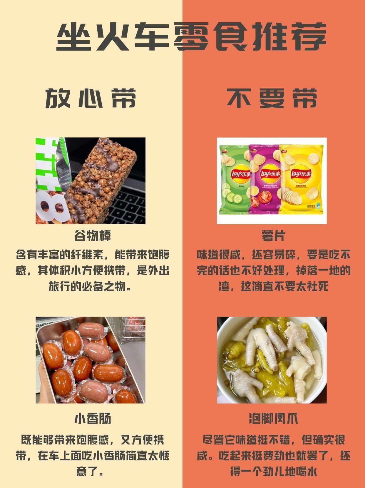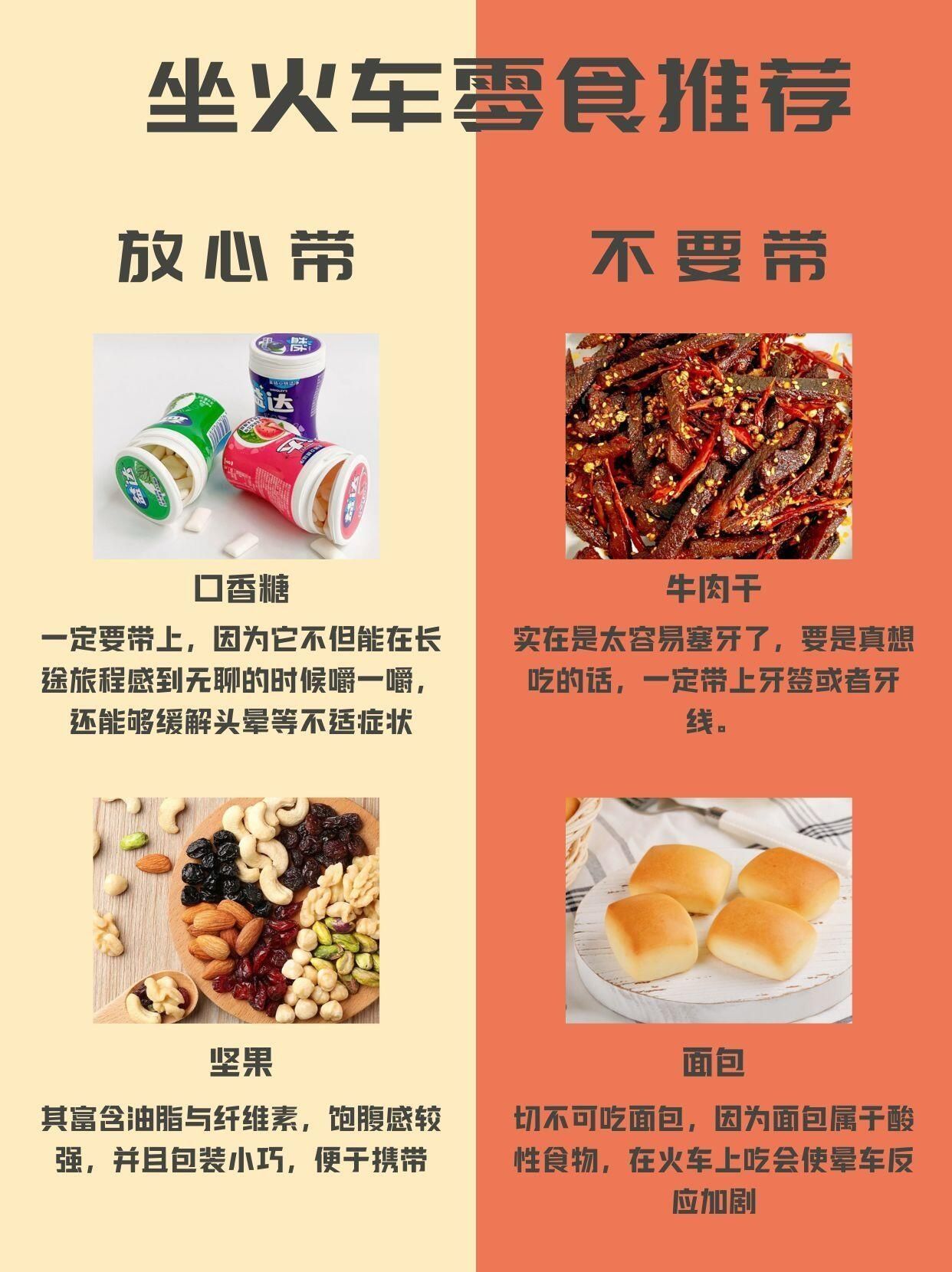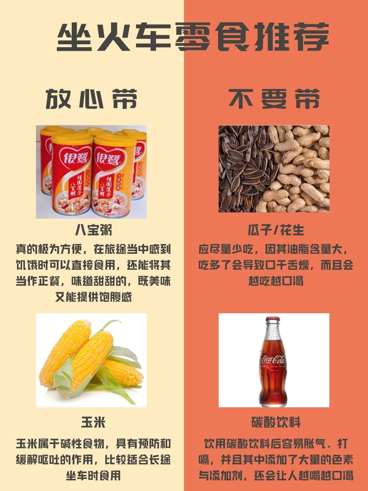 假期准备出去玩的姐妹们千万不要错过了!! 这些食物放心带谷物棒 含有丰富的纤维素,能带来饱腹感,其体积小方便携带,是外出旅行的必备之物~☑小香肠 既能够带来饱腹感,又方便携带,在车上面吃小香肠简直太惬意了八宝粥 真的极为方便,在旅途当中感到饥饿时可以直接食用,还能将其当作正餐,味道甜甜的,既美味又能提供饱腹感玉米 玉米属于碱性食物,具有预防和缓解呕吐的作用,比较适合长途坐车时食用口香糖 一定要带上...
