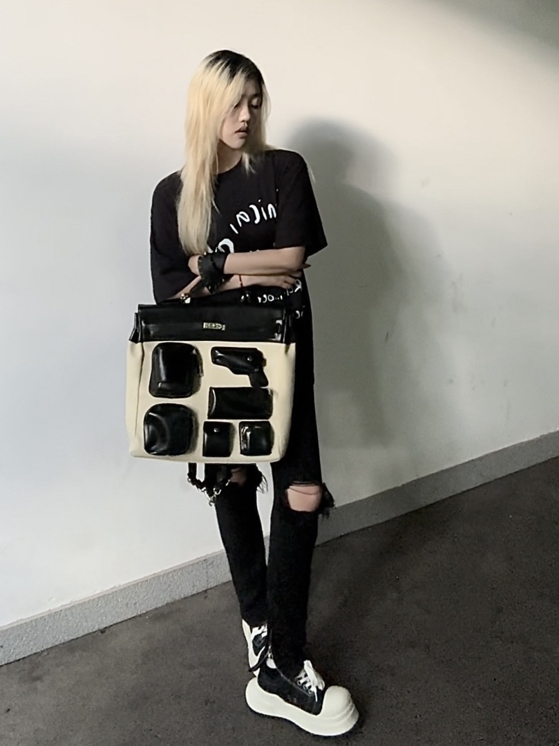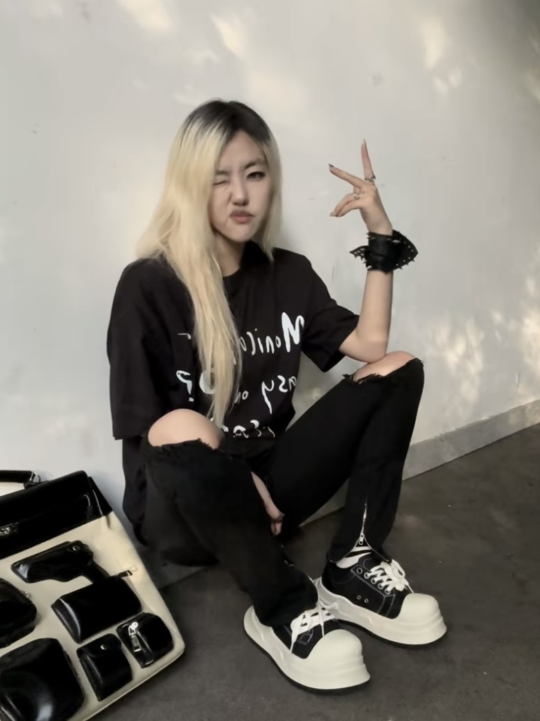 最近的心头好🍷 黑白配色和我的衣柜搭配无压力 同色系英文字母T十破洞裤真有韩流内味 加上配饰和精髓下眼线直接2012住了 @你大吴头仔🎾
