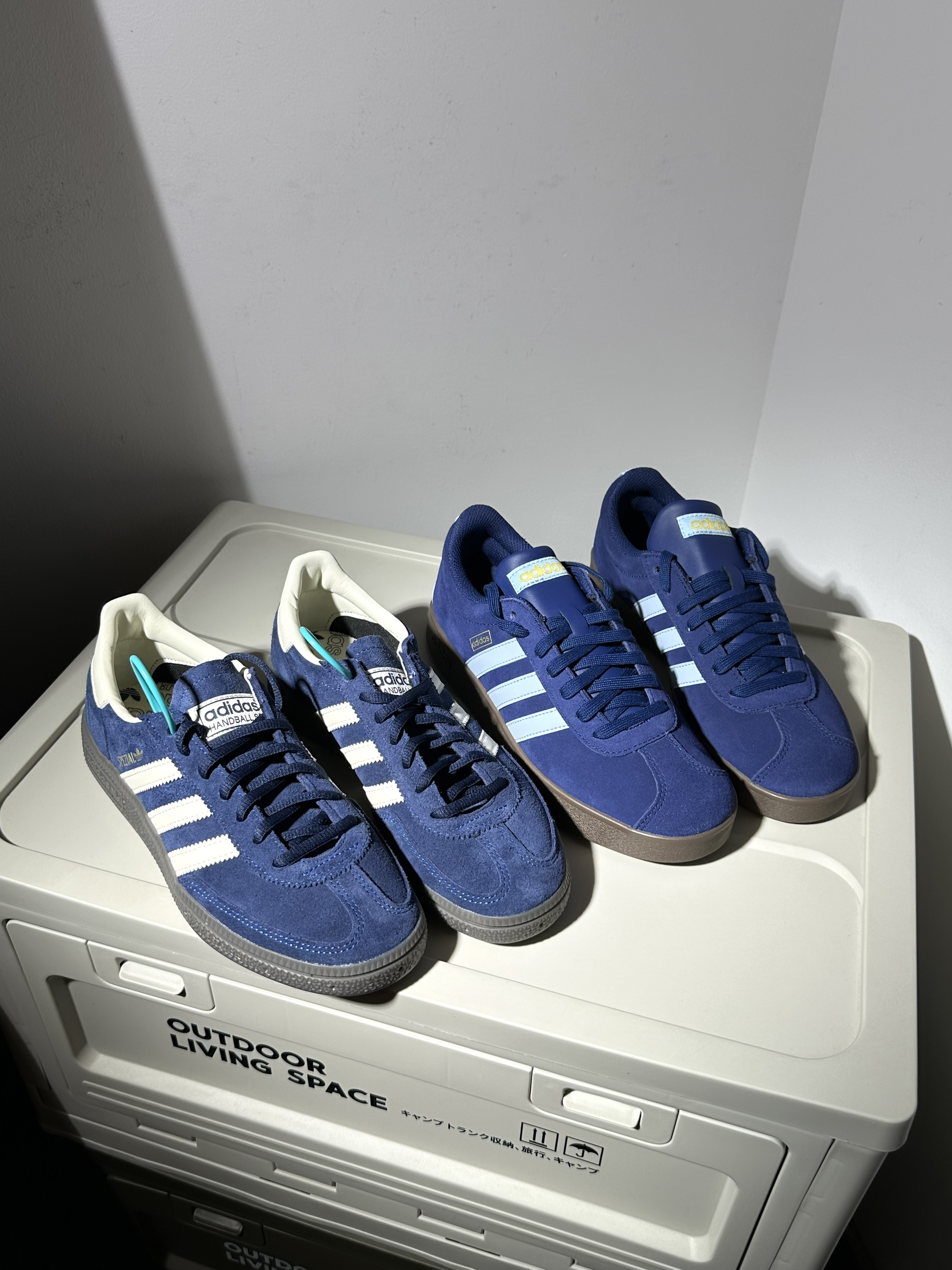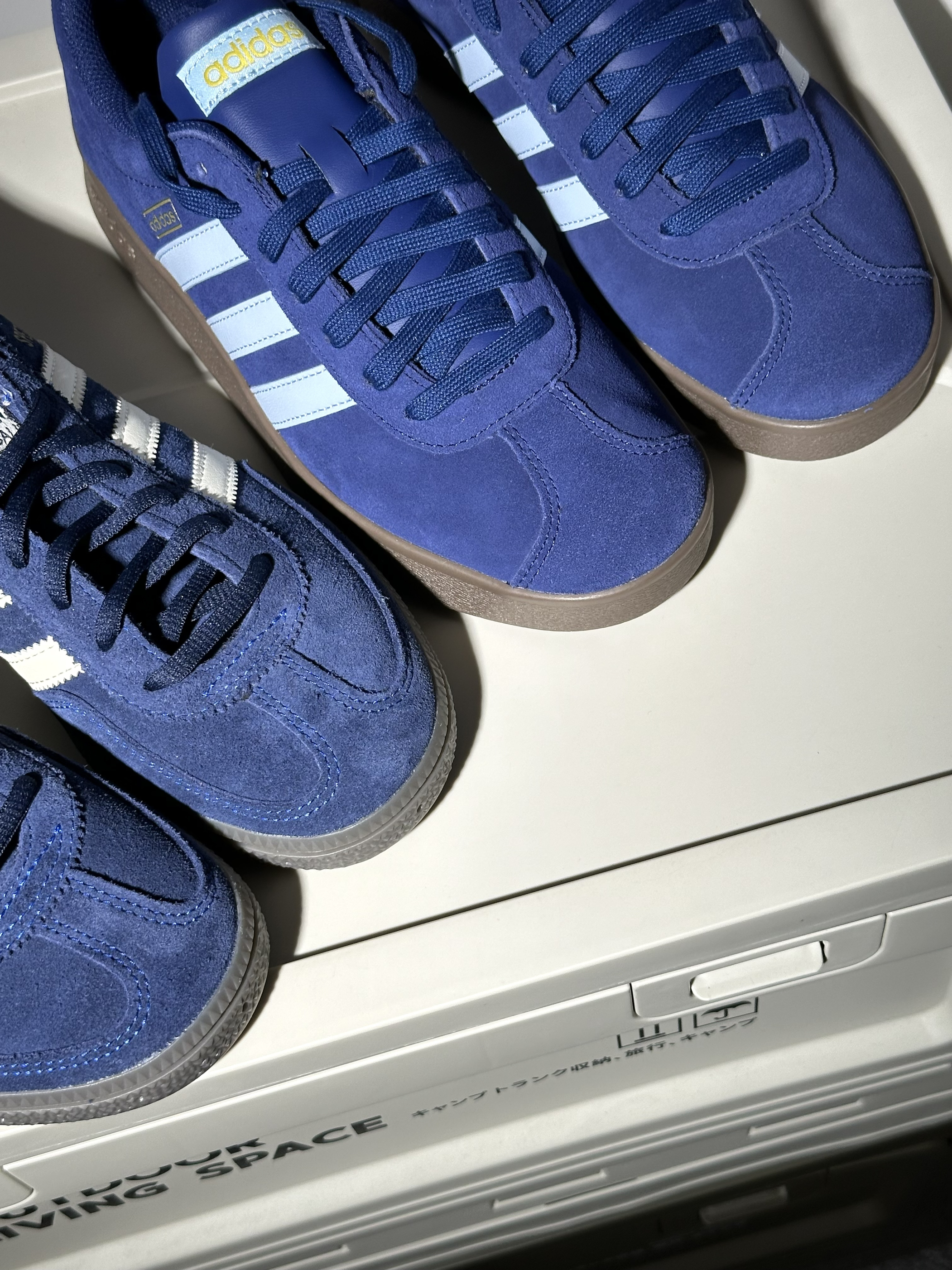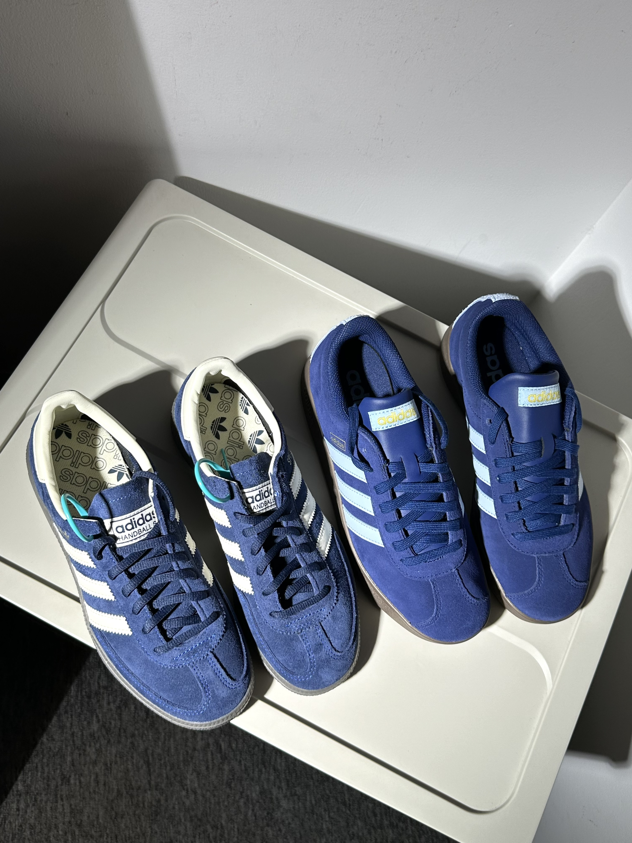 深蓝色VL court 🆚 spezial 1️⃣鞋型不同:两双鞋鞋型都很秀气,VL court相对来讲会宽松一点,spezial设计细节会更精致 2️⃣鞋面材质不同:VL court用到合成革,spezial用到牛皮革和牛剖层革,不过都是做成了麂皮质感,质感都很棒,但打理起来需要仔细⚠️ 3️⃣脚感不同:spezial系列脚感更好,鞋垫更加软糯,也有足弓支撑,不过都是比较适合通勤出街穿适合做...