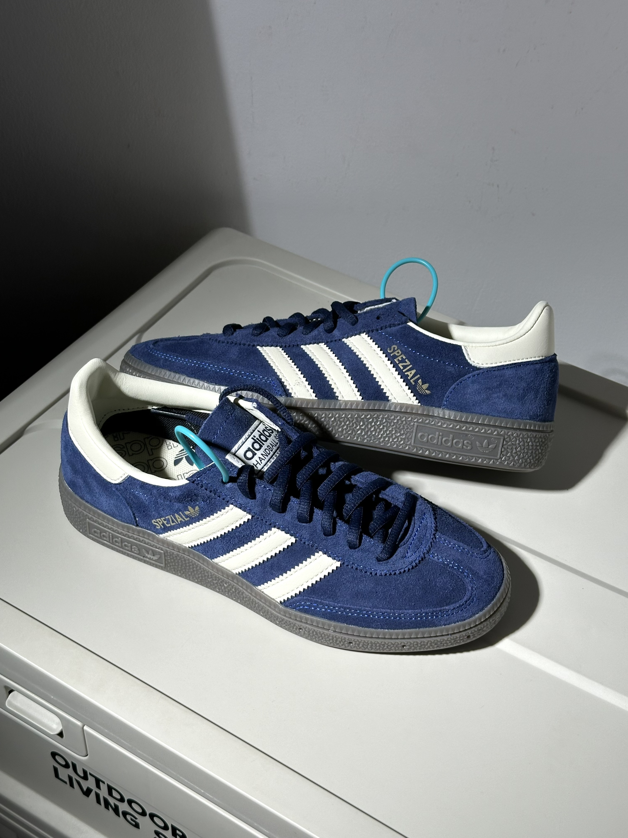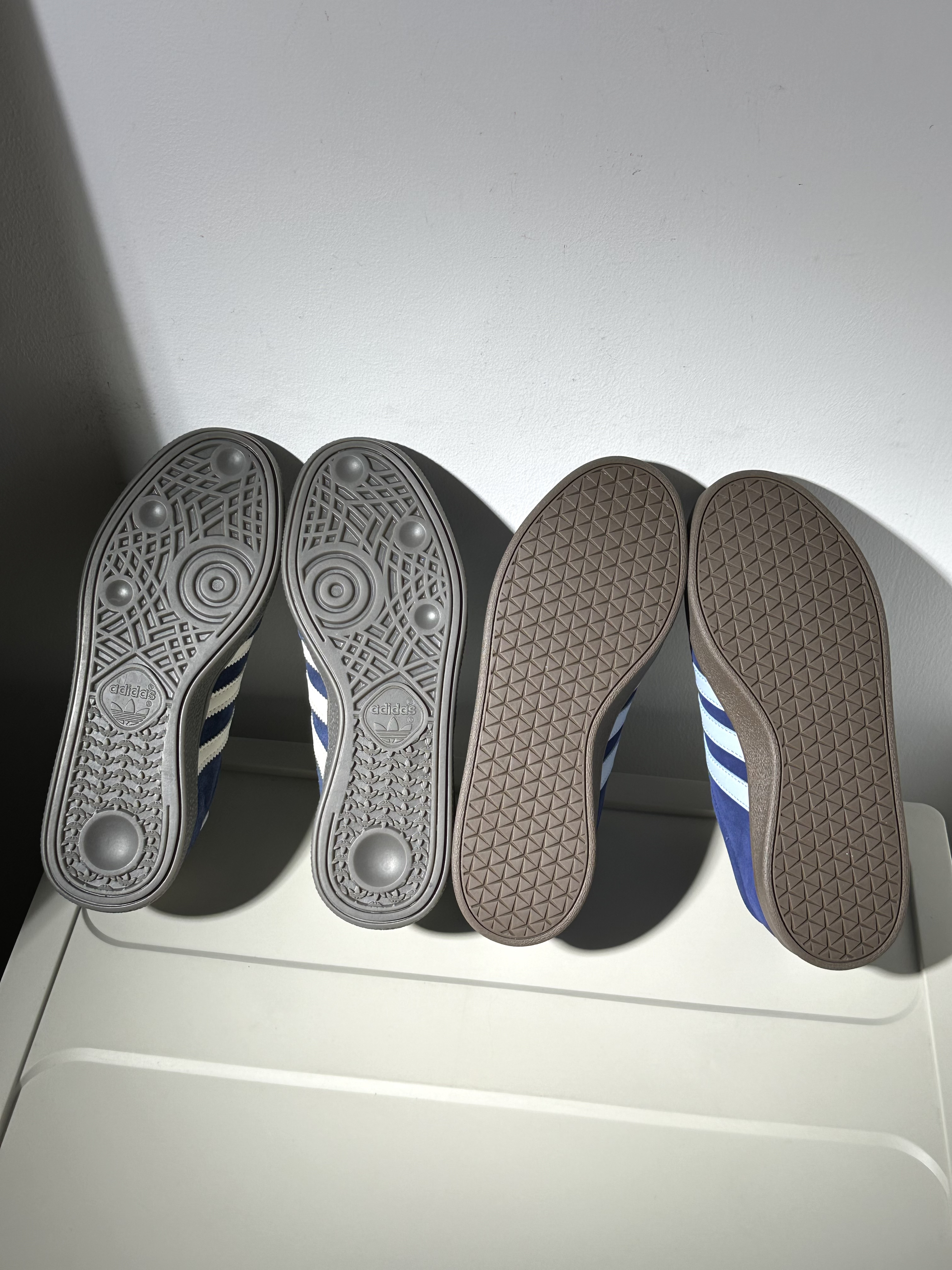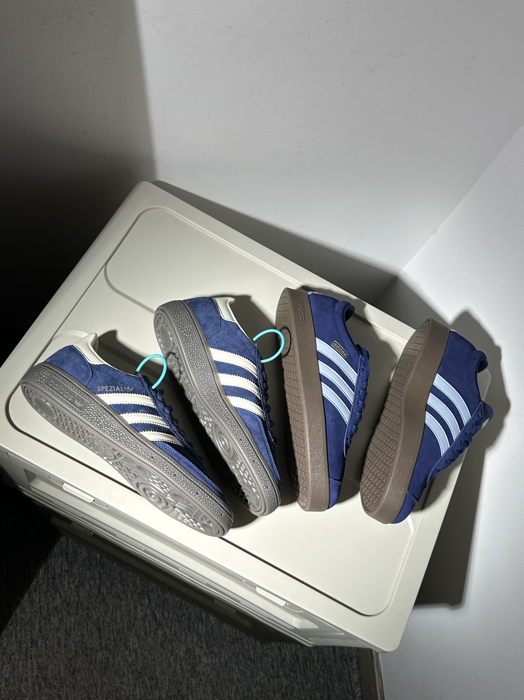 深蓝色VL court 🆚 spezial 1️⃣鞋型不同:两双鞋鞋型都很秀气,VL court相对来讲会宽松一点,spezial设计细节会更精致 2️⃣鞋面材质不同:VL court用到合成革,spezial用到牛皮革和牛剖层革,不过都是做成了麂皮质感,质感都很棒,但打理起来需要仔细⚠️ 3️⃣脚感不同:spezial系列脚感更好,鞋垫更加软糯,也有足弓支撑,不过都是比较适合通勤出街穿适合做...