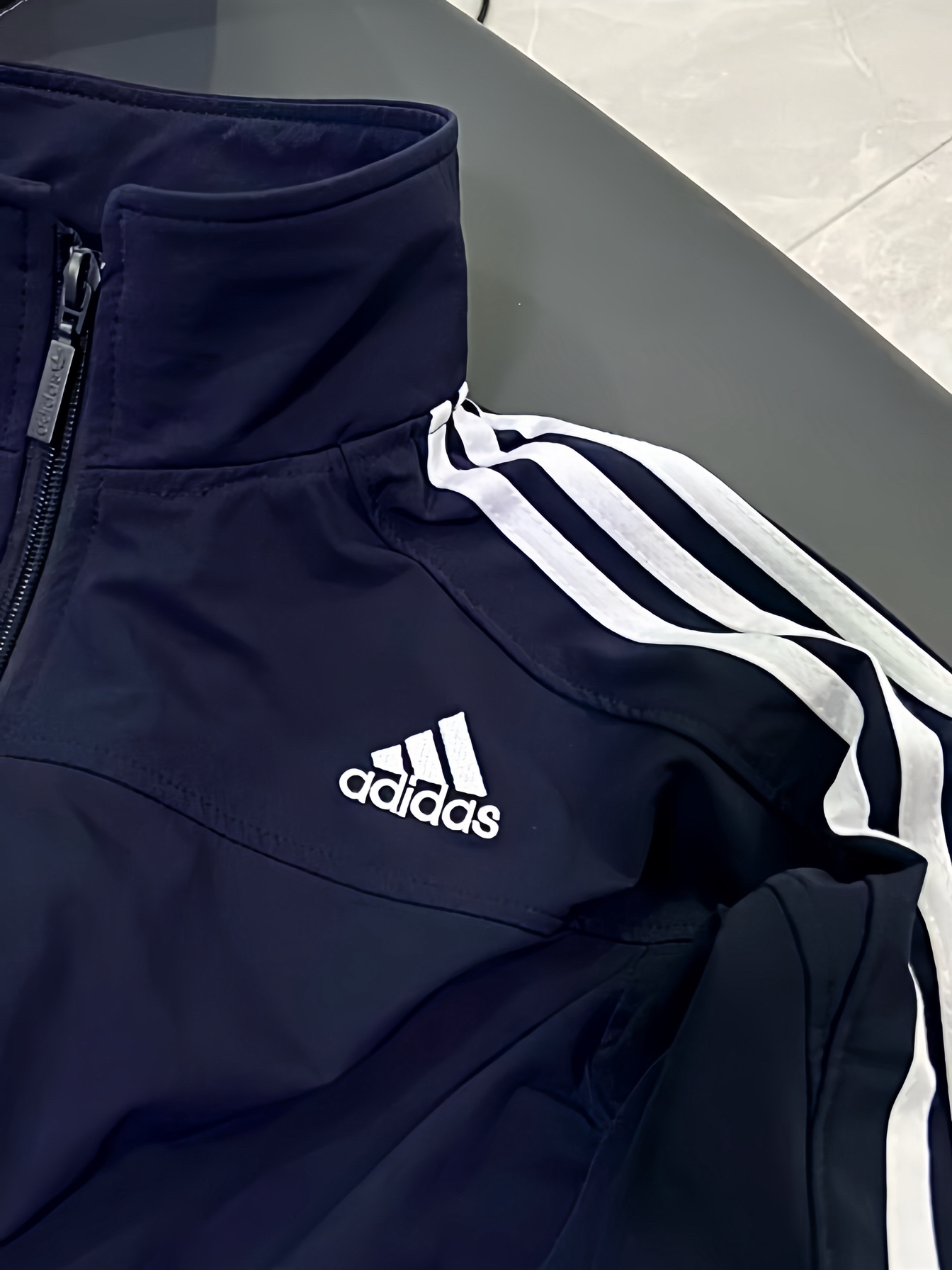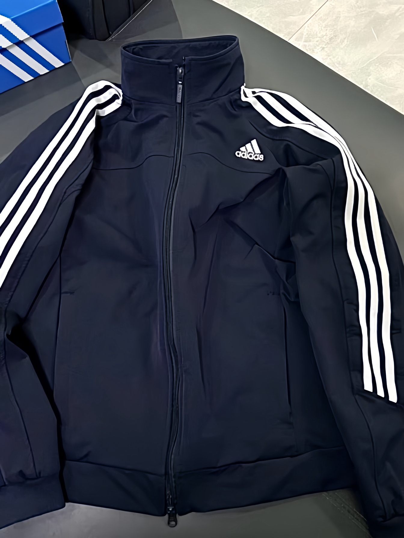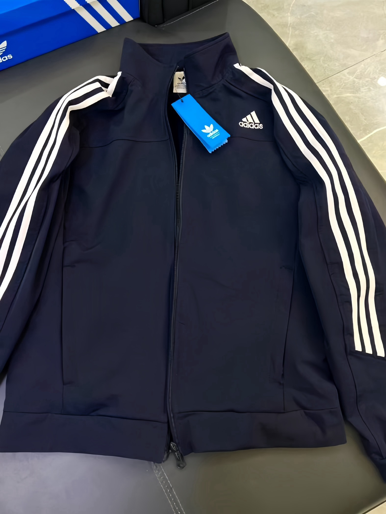 阿迪家的这款外套火了!真的泰爱了!! 很久了买回来真的意料之外 同学还问我拿🔗啦 现在的温度穿刚刚合适 整体是那种藏蓝色的很显白 侧边是阿迪经典的三条杠设计很显瘦 特别百搭的一款外套 特别适合秋天🍂 真的爱啦 男女同款哦